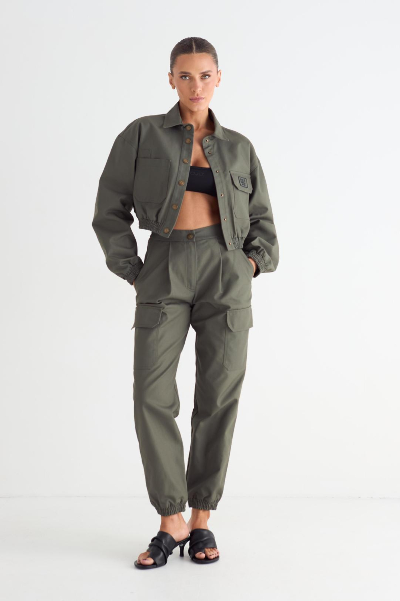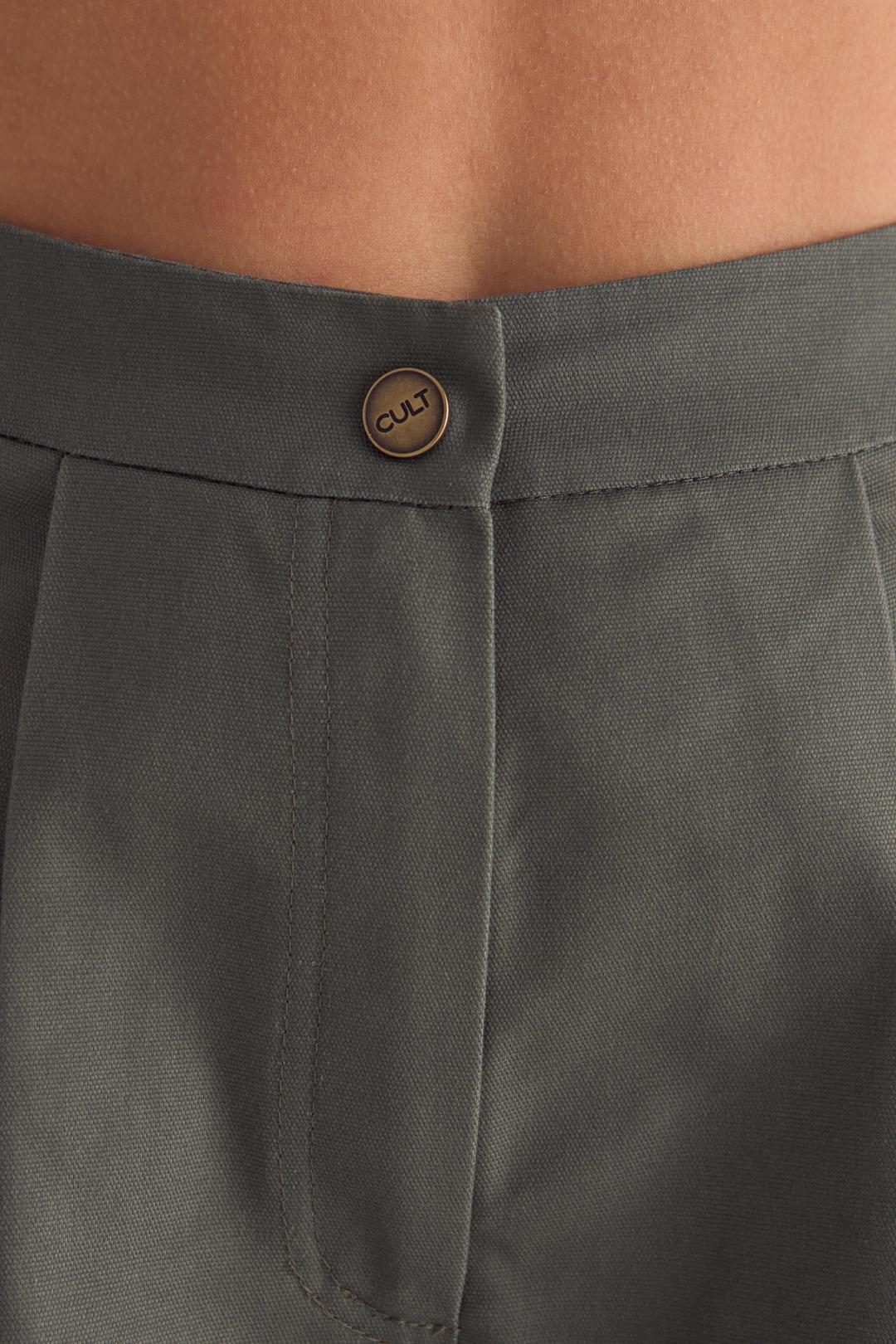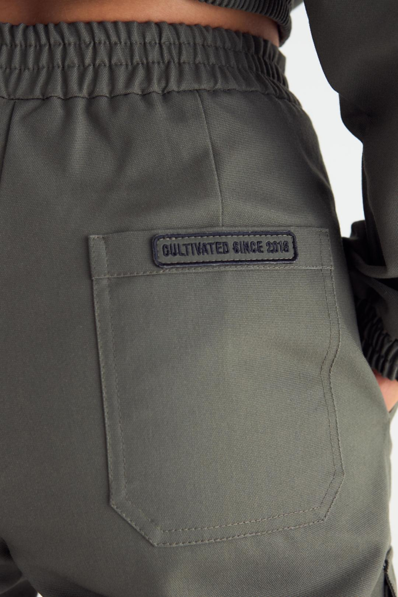Брюки женские прямого силуэта из канваса. Застежка гульфик на молнию и брендированную кнопку. Карманы боковые, накладные с клапанами на боковых швах и накладные карманы сзади с брендированной нашивкой справа. Пояс и манжеты по низу на резинке.