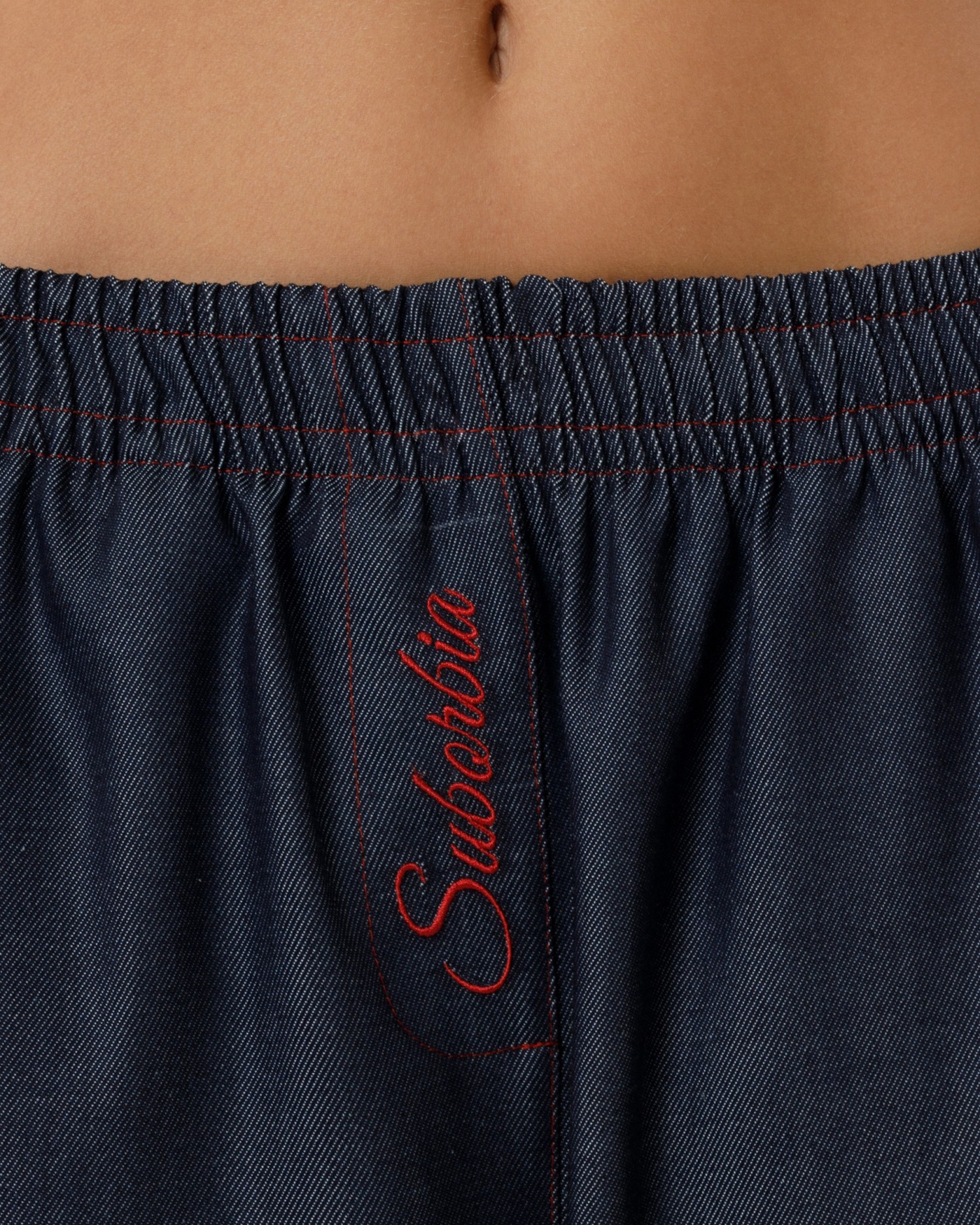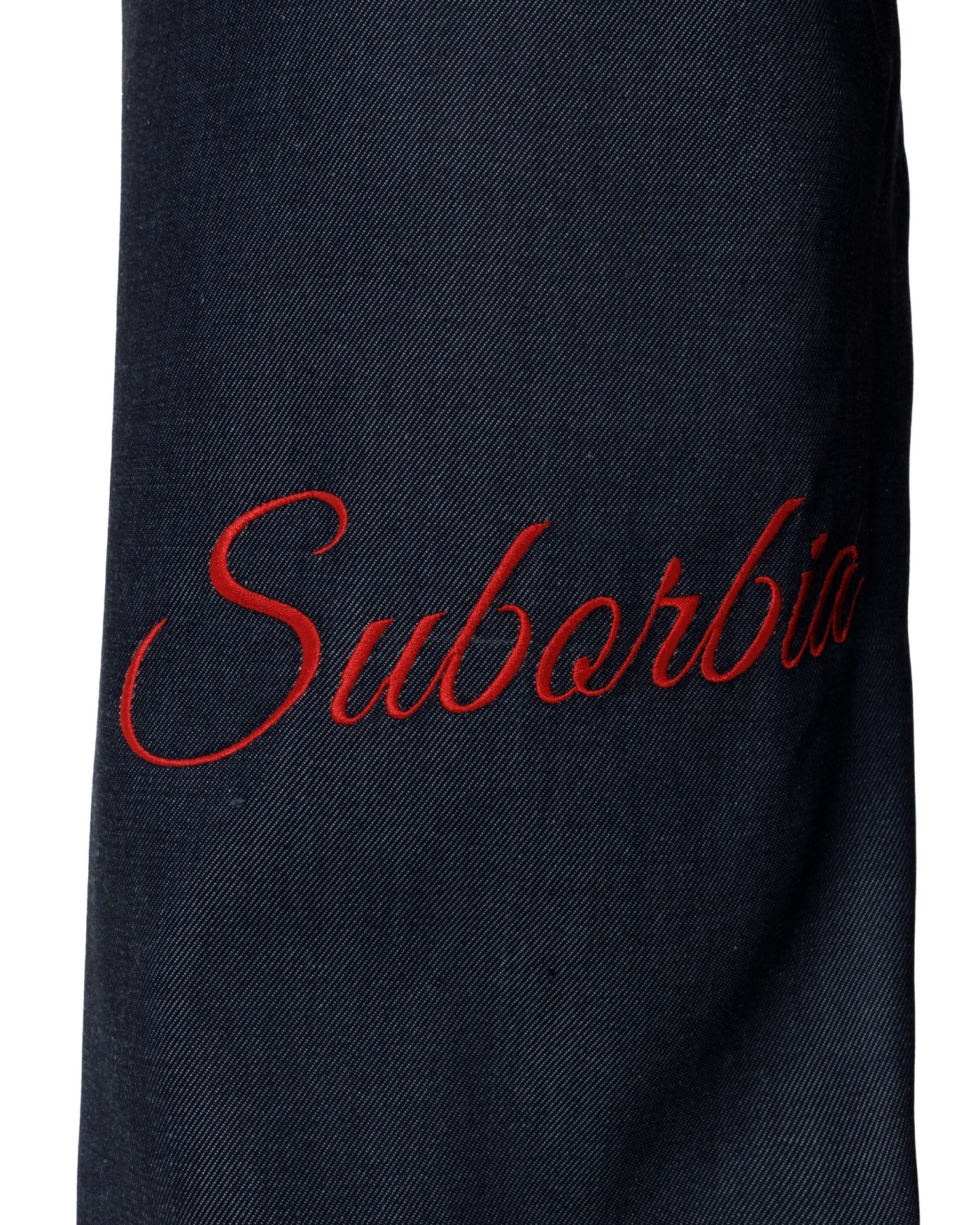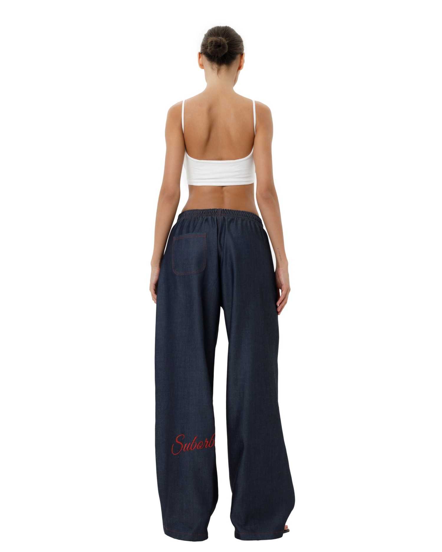 Брюки из денима прямого кроя с контрастными швами и вышивкой.
