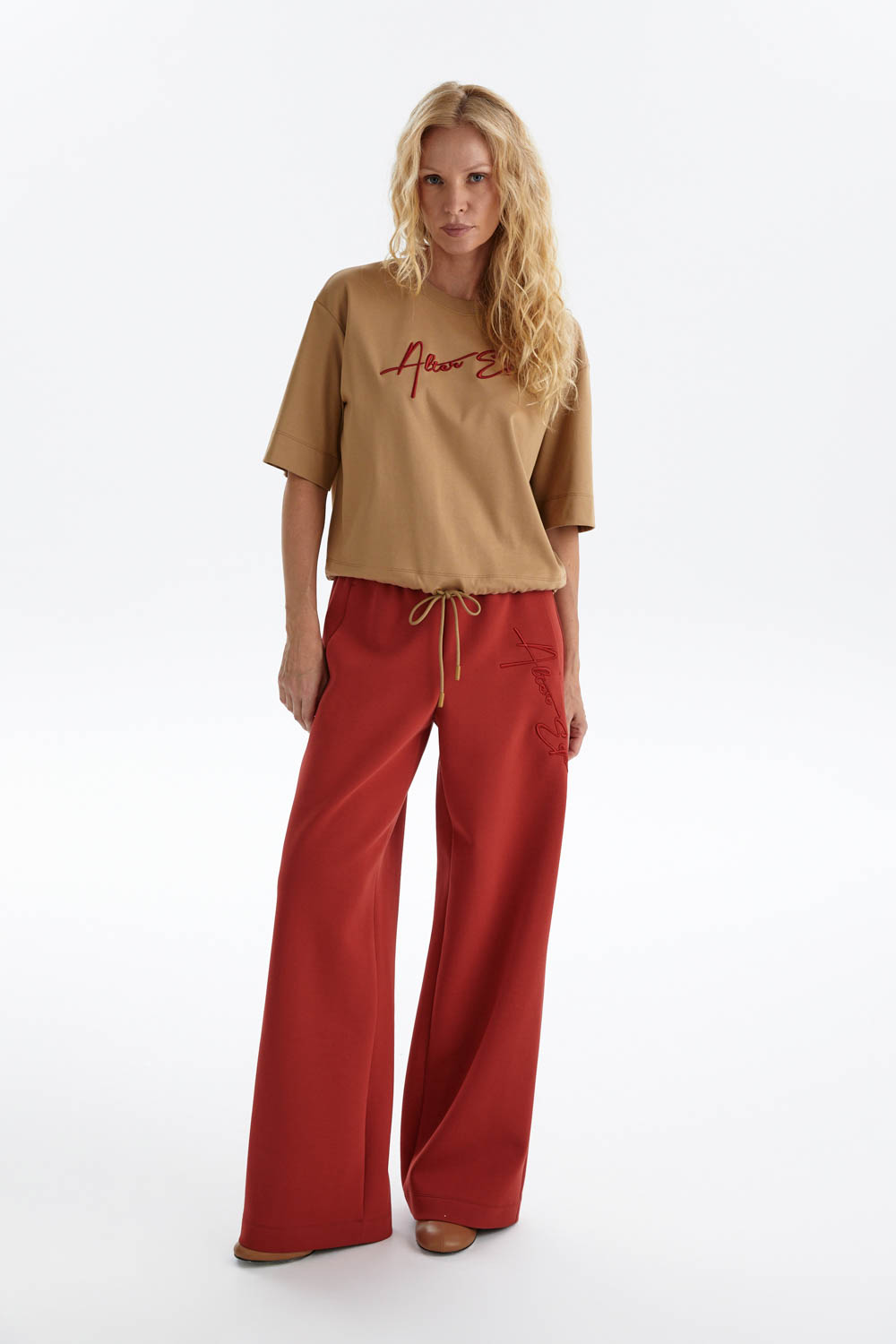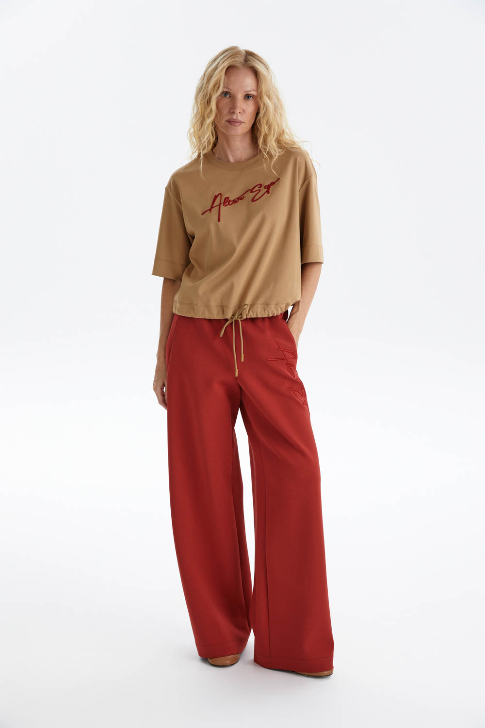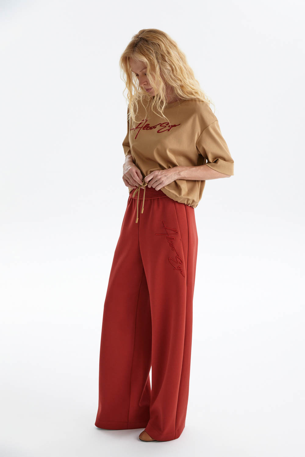 Прямые трикотажные брюки широкого кроя в насыщенном терракотовом оттенке — смелое решение для стильных и уверенных образов. Лаконичный дизайн сочетается с выразительным цветом, создавая гармонию комфорта и современности. Эластичный пояс на кулиске с завязками обеспечивает удобную посадку и мягко подстраивается под фигуру, а лёгкий материал красиво драпируется и дарит ощущение свободы. Такие брюки легко интегрируются в повседневный гардероб: они отлично смотрятся с базовыми футболками и свитшотами для непринуждённых сетов, а в сочетании с жакетом и обувью на каблуке превращаются в основу более утончённого стиля.