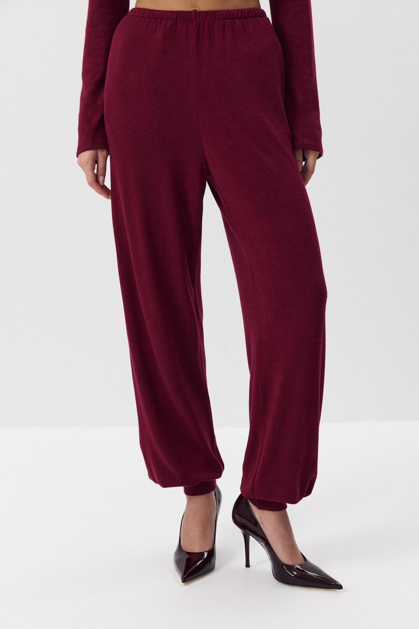 Брюки джоггеры из мягкого свитерного трикотажа. Объемный силуэт, который формируют широкие манжеты по низу. Брюки на тонком поясе с резинкой внутри.