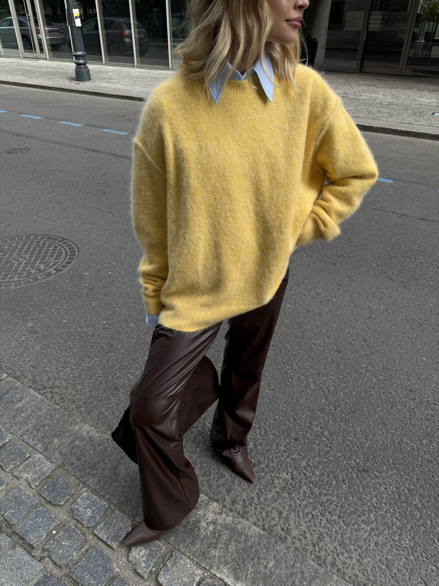Брюки прямого кроя из гладкой кожи в насыщенном оттенке горького шоколада.