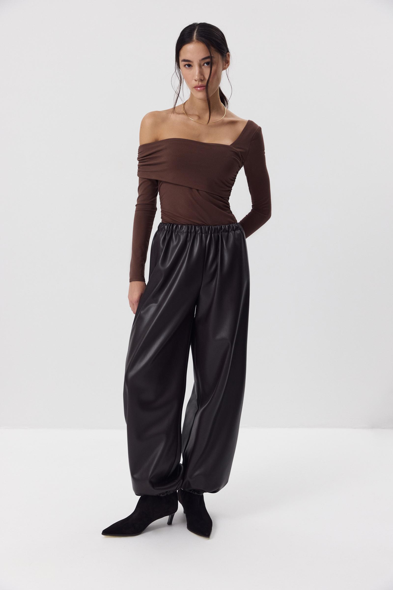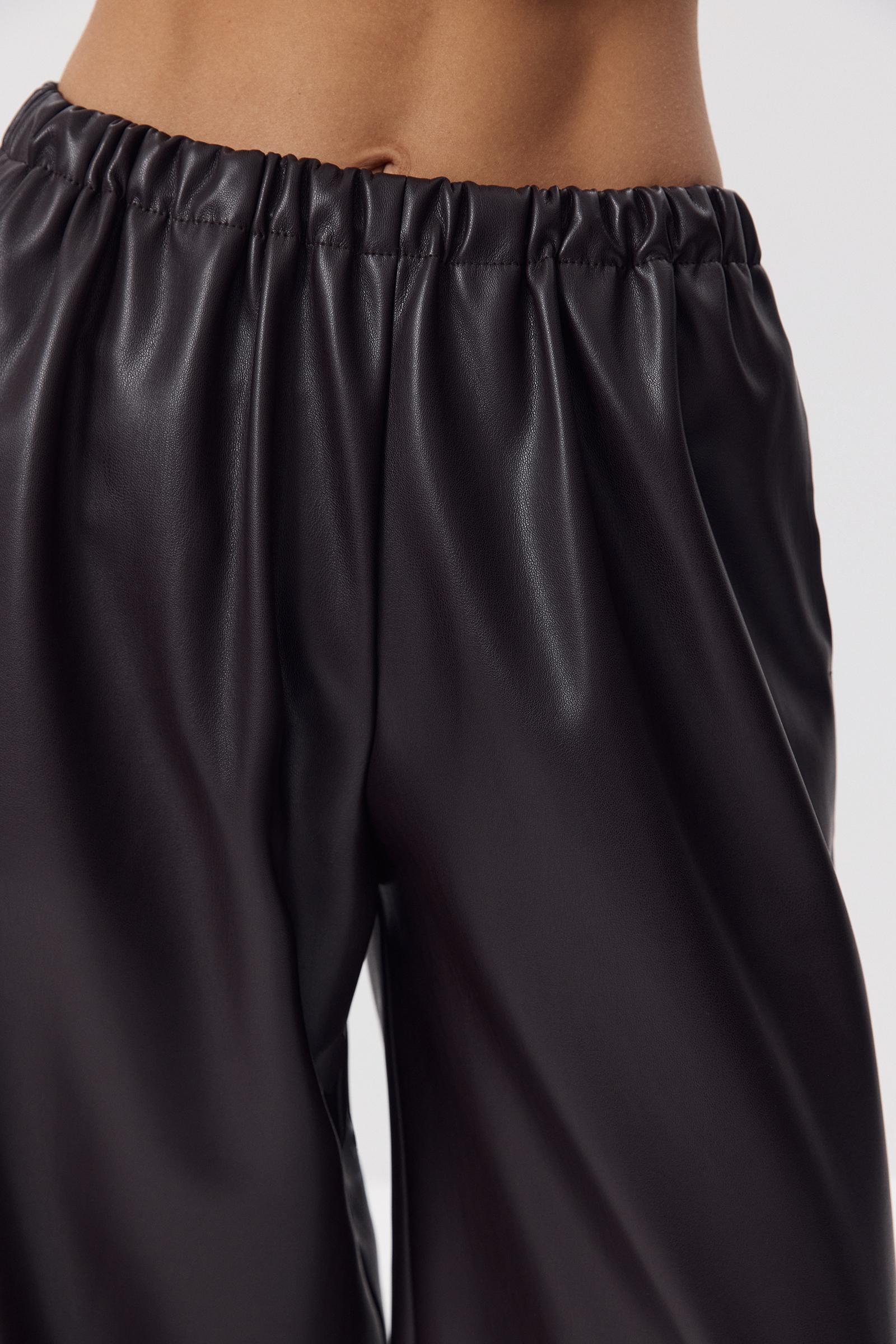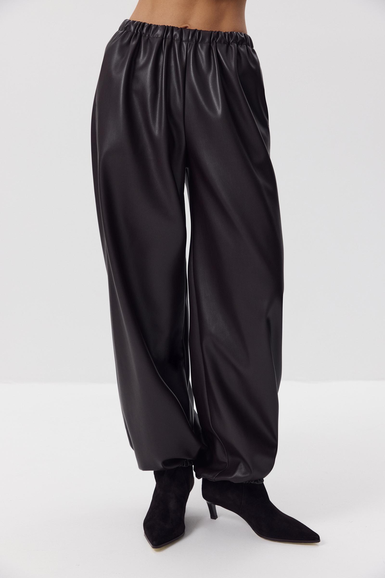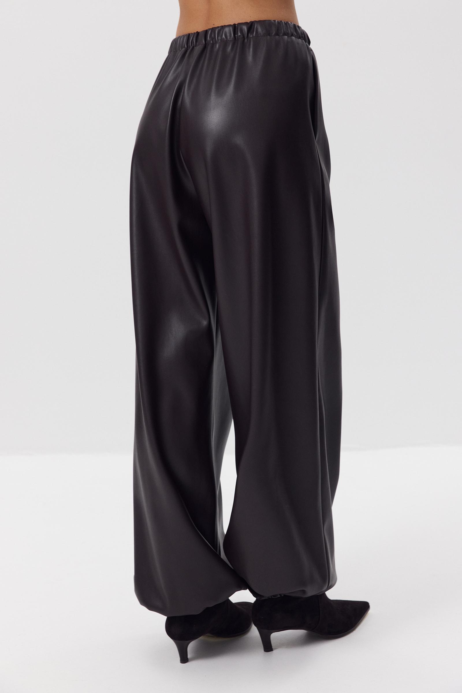 Брюки джоггеры из эко кожи. Объемный силуэт, который формируют широкие манжеты по низу. Брюки на тонком поясе с резинкой внутри.