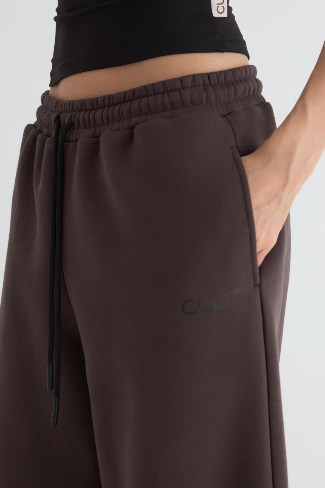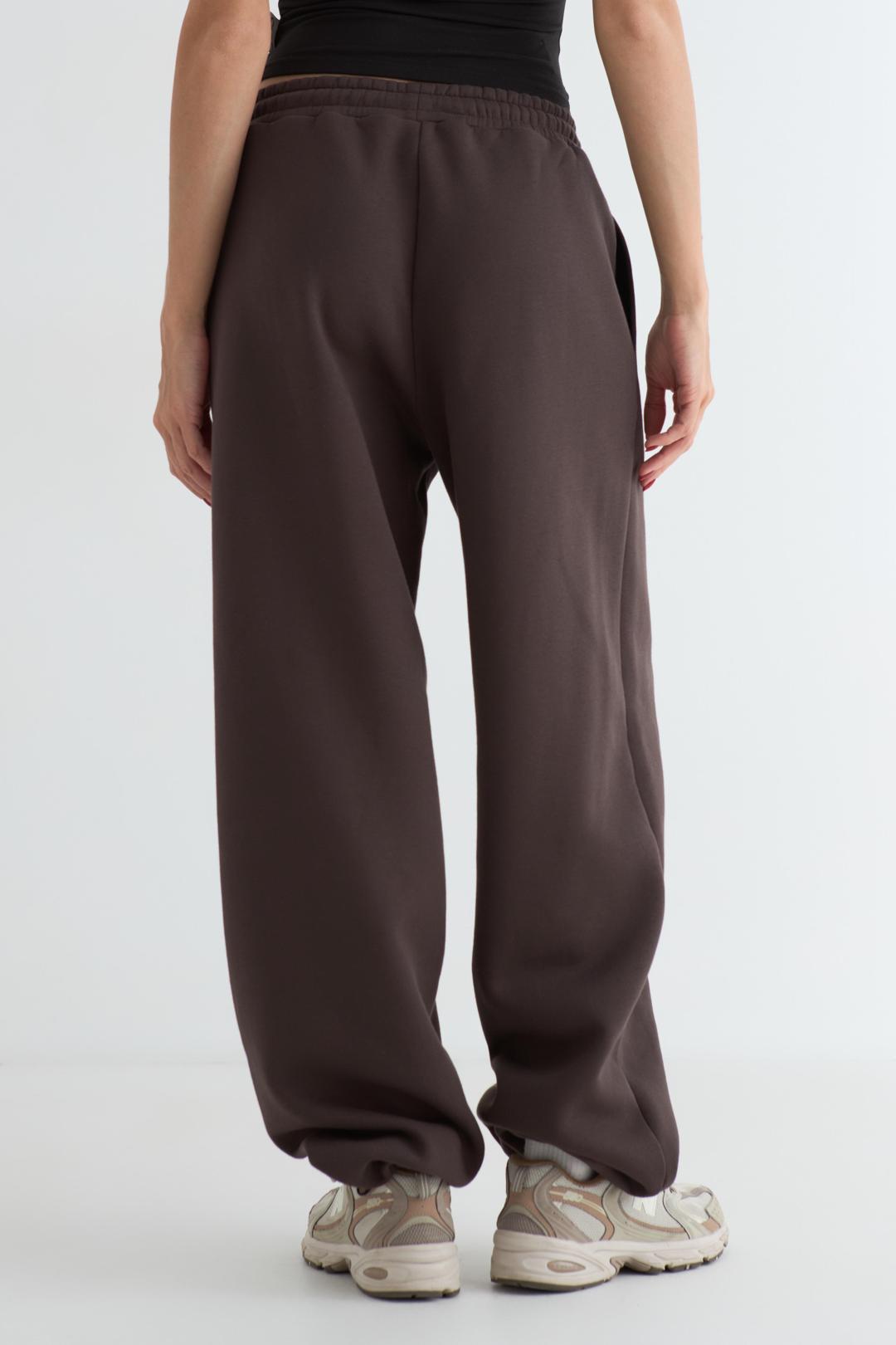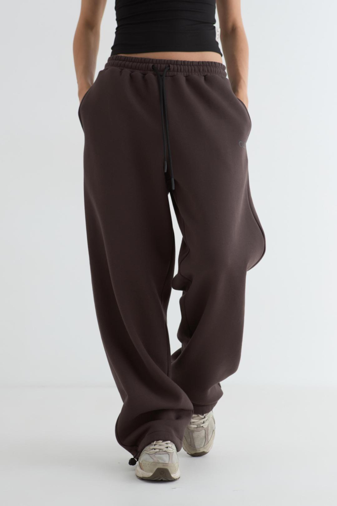 Брюки женские прямого силуэта из футера трехнитки с начёсом. Пояс на эластичной тесьме со шнуром, карманы в отрезном бочке. По низу брюк резинка с регулятором. Под левым карманом берендированный принт.