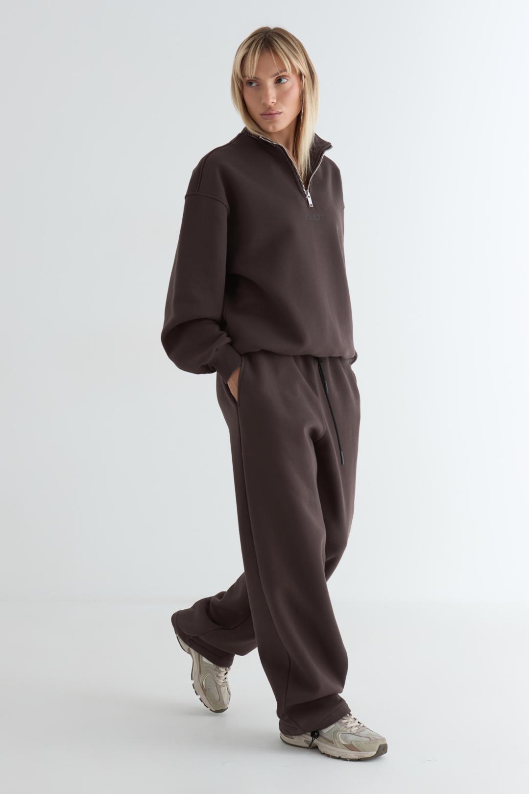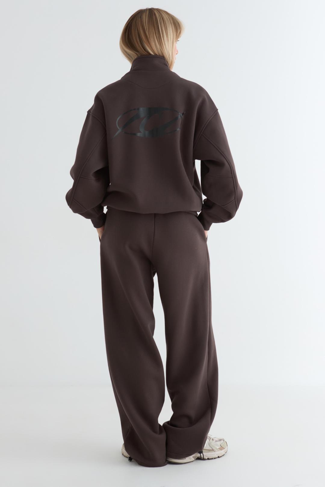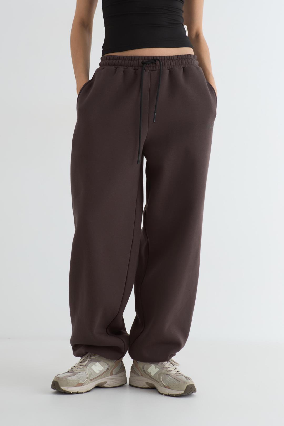 Брюки женские прямого силуэта из футера трехнитки с начёсом. Пояс на эластичной тесьме со шнуром, карманы в отрезном бочке. По низу брюк резинка с регулятором. Под левым карманом берендированный принт.