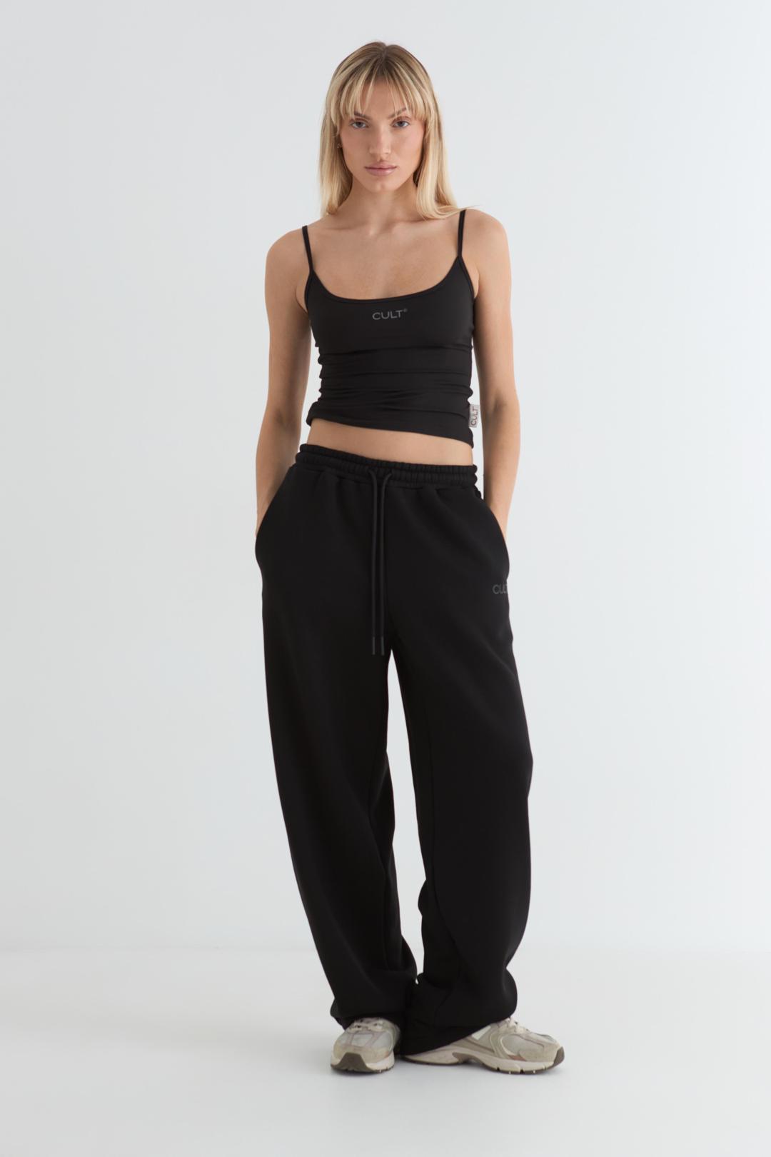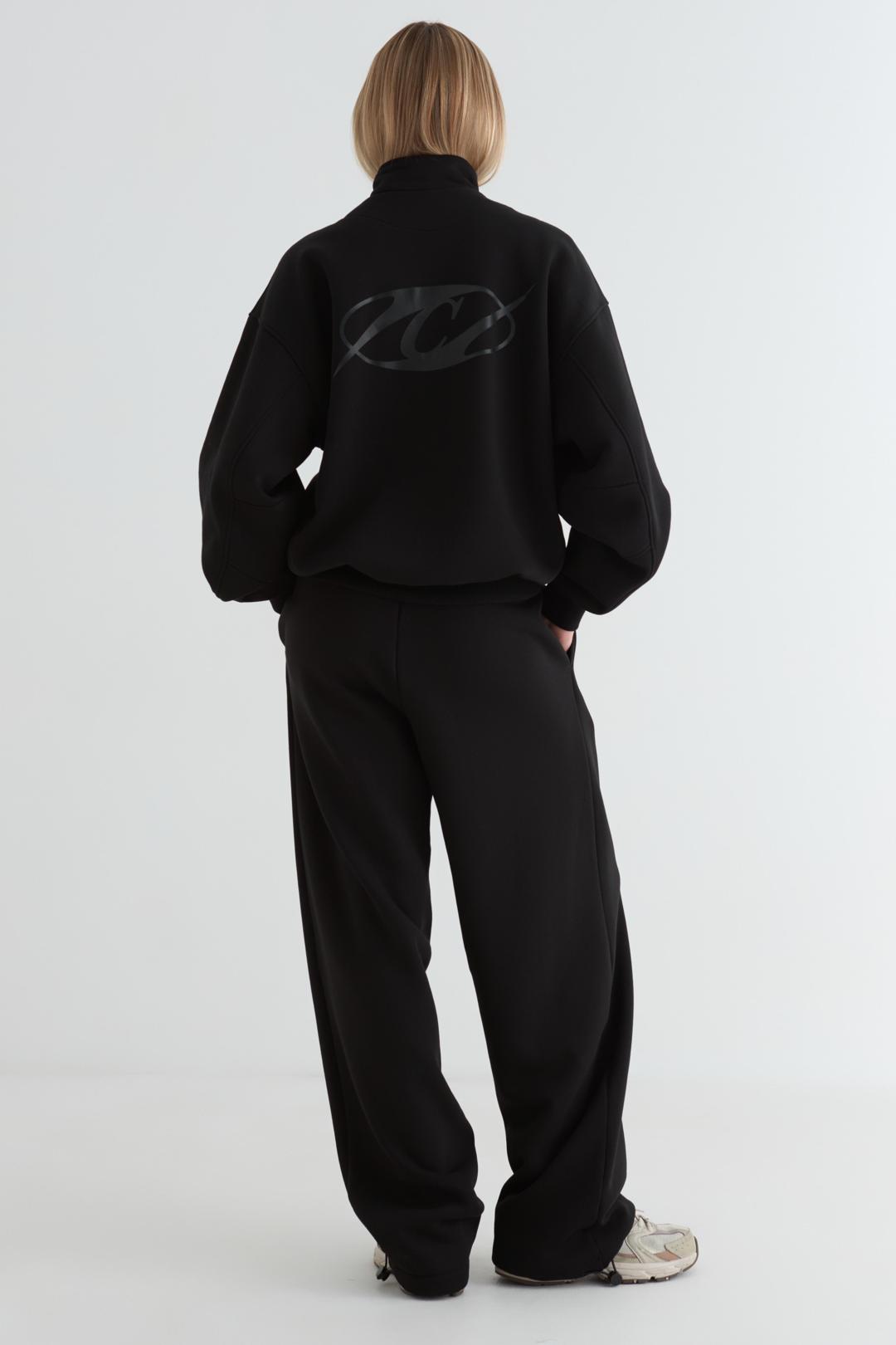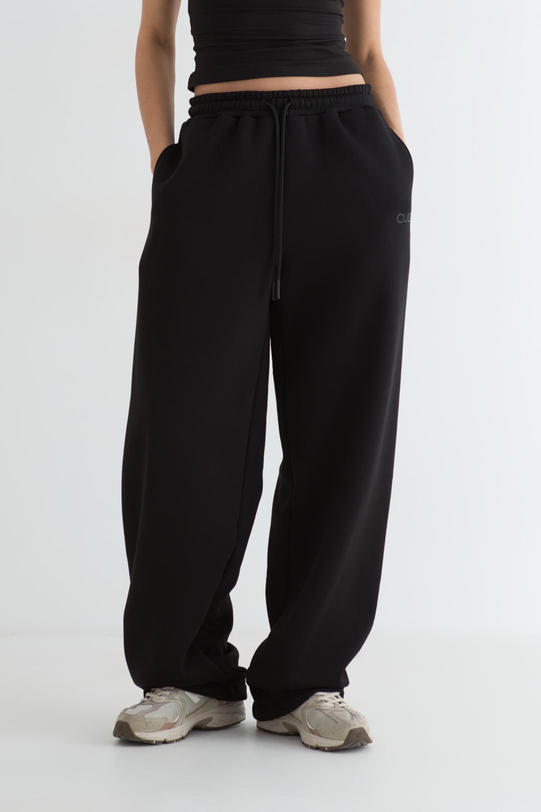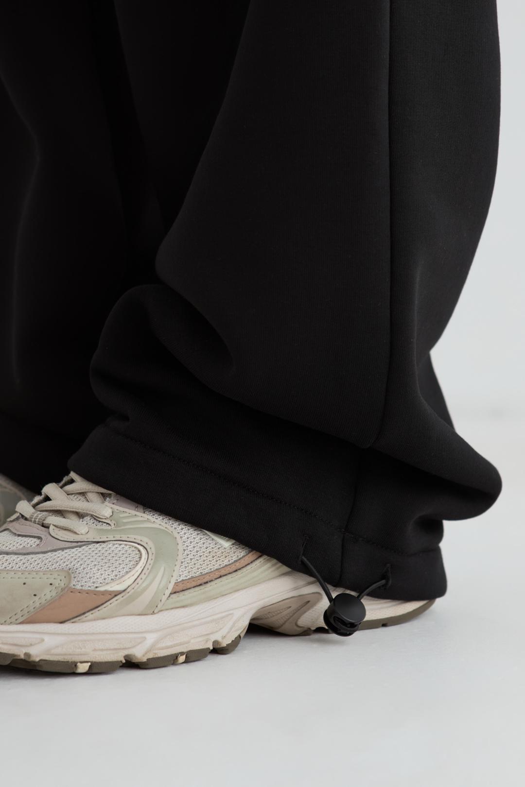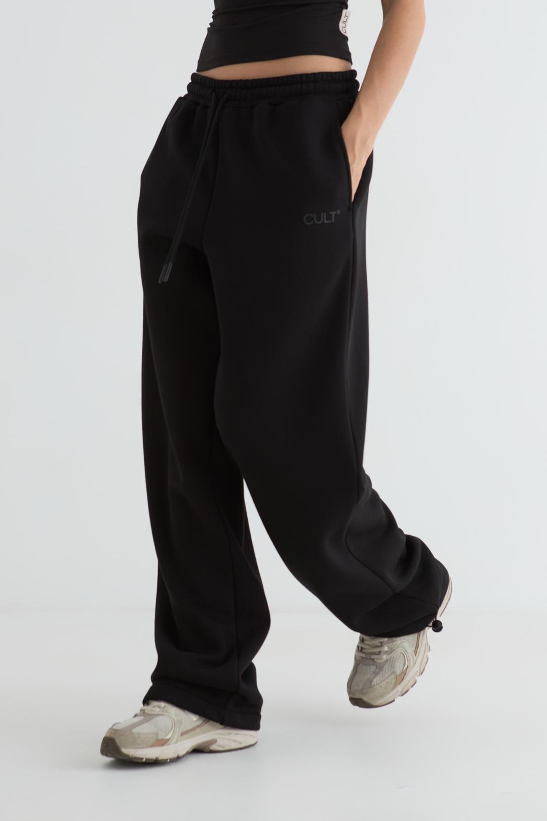 Брюки женские прямого силуэта из футера трехнитки с начёсом. Пояс на эластичной тесьме со шнуром, карманы в отрезном бочке. По низу брюк резинка с регулятором. Под левым карманом берендированный принт.