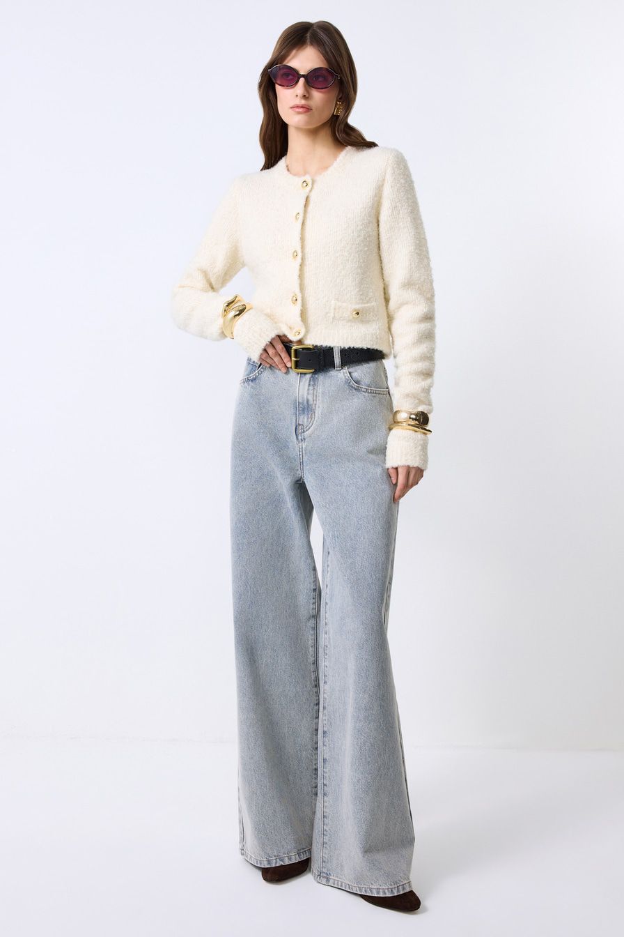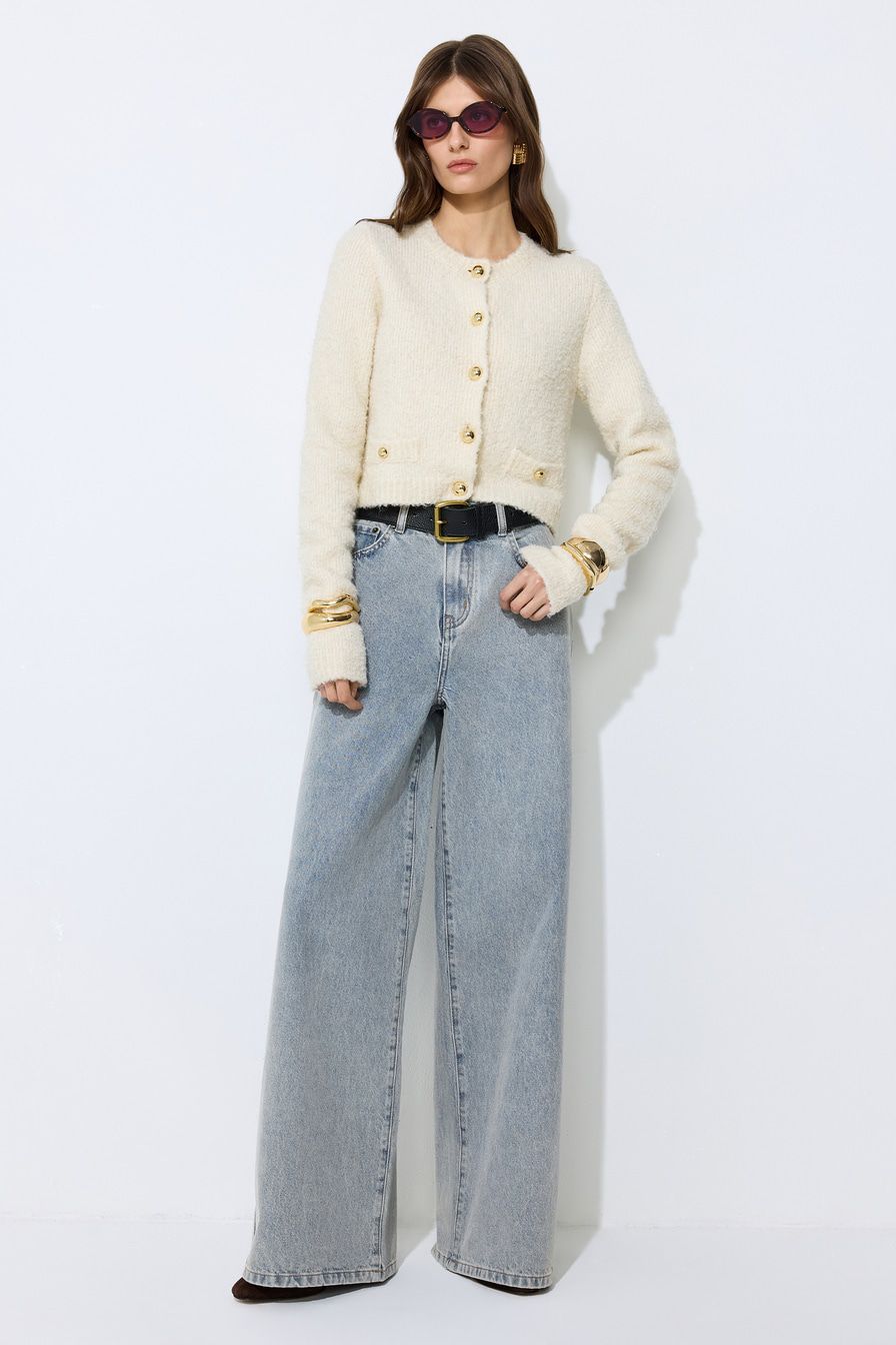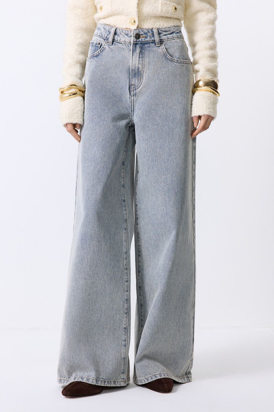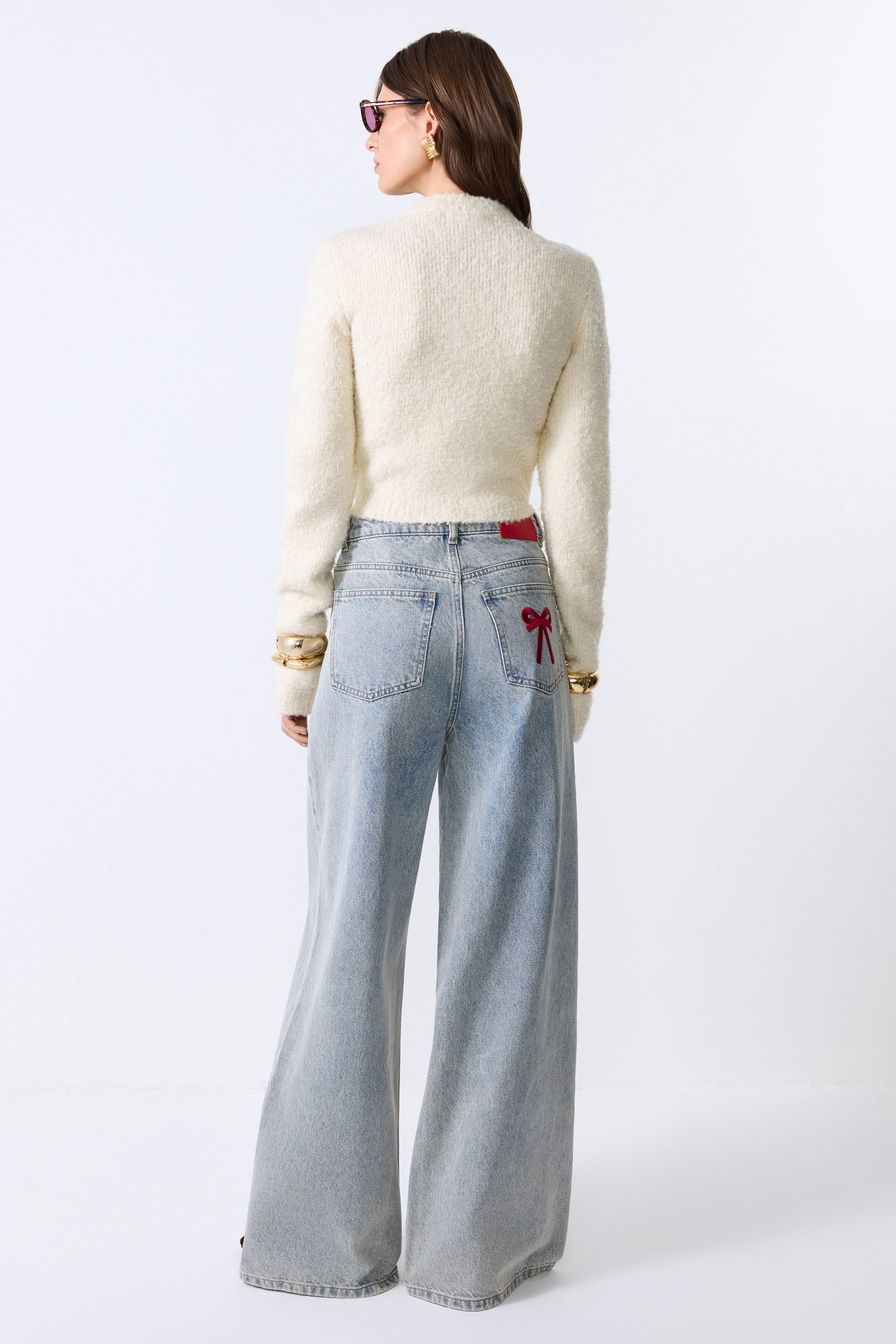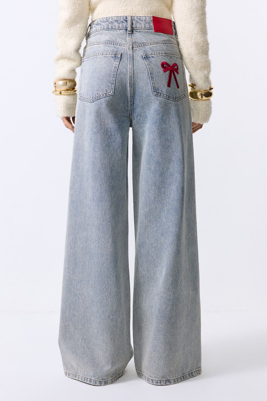 Широкие светло-голубые джинсы выполнены из 100% хлопка и декорированы вышивкой в виде бантика на заднем кармане.