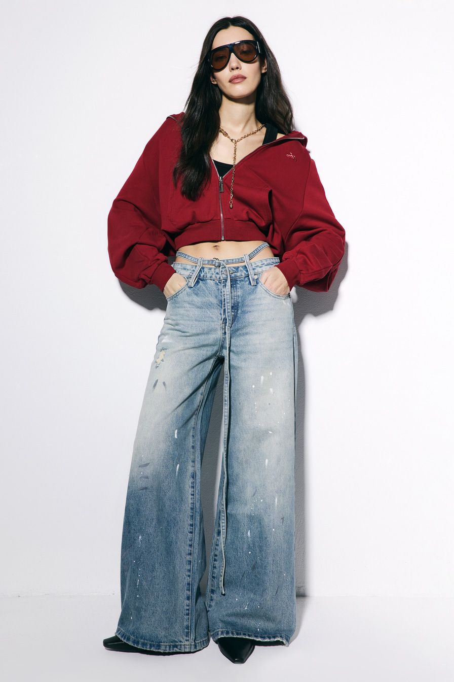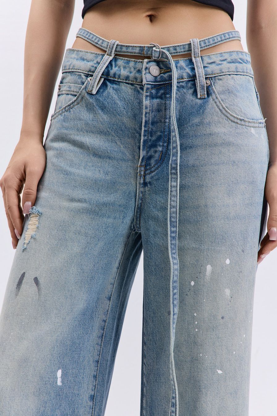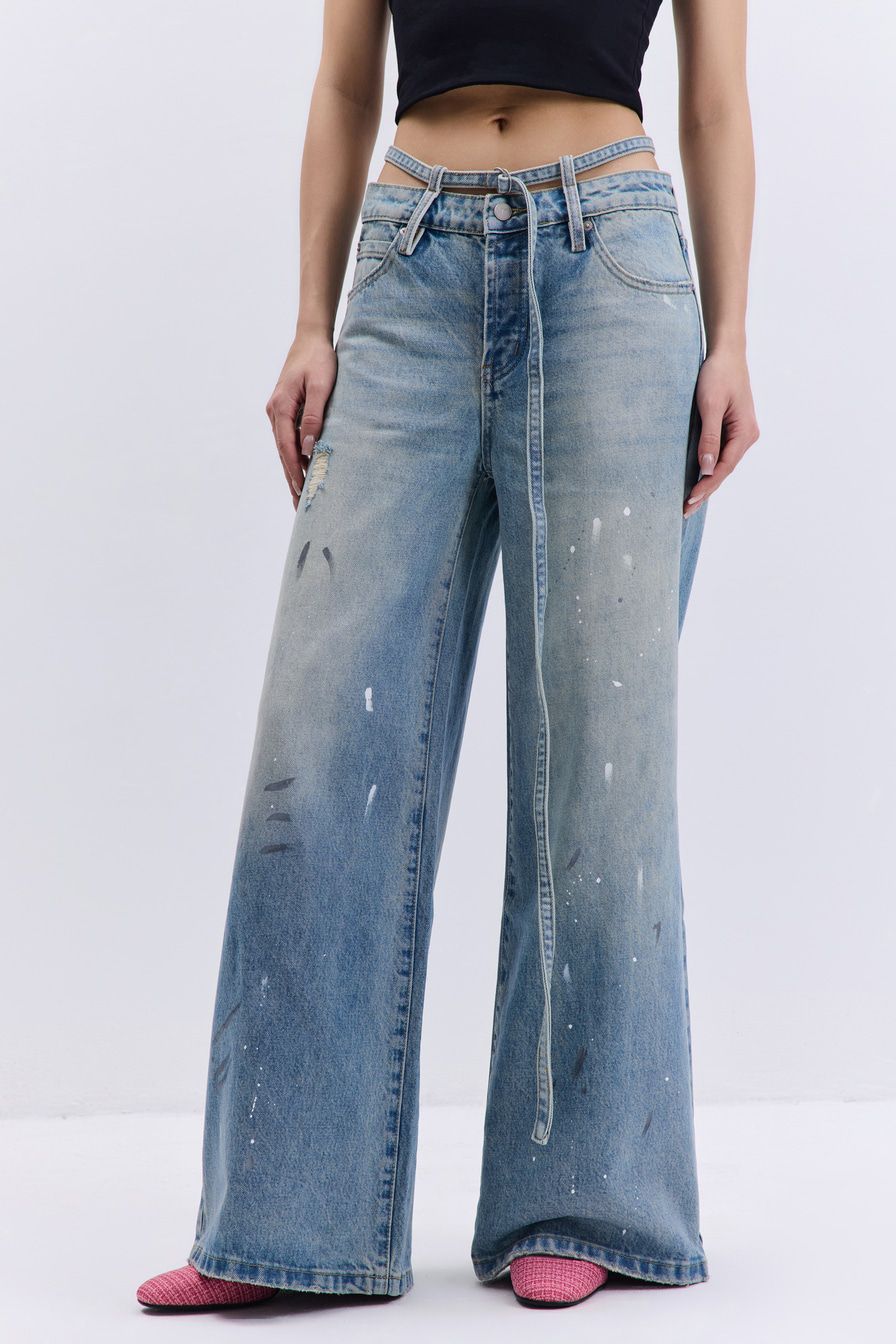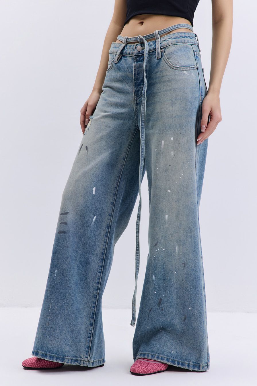Широкие темно-голубые джинсы из 100% хлопка – модель со средней посадкой. Джинсы декорированы потертостями, разрезами и мазками краски в стиле гранж, дополнены двойными шлевками и тонким джинсовым поясом.