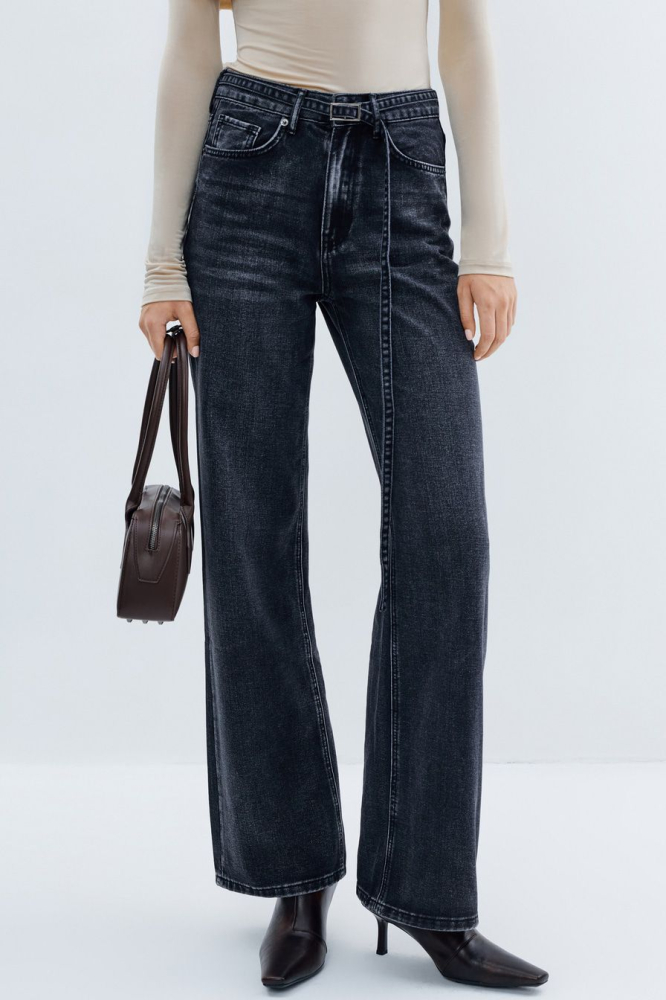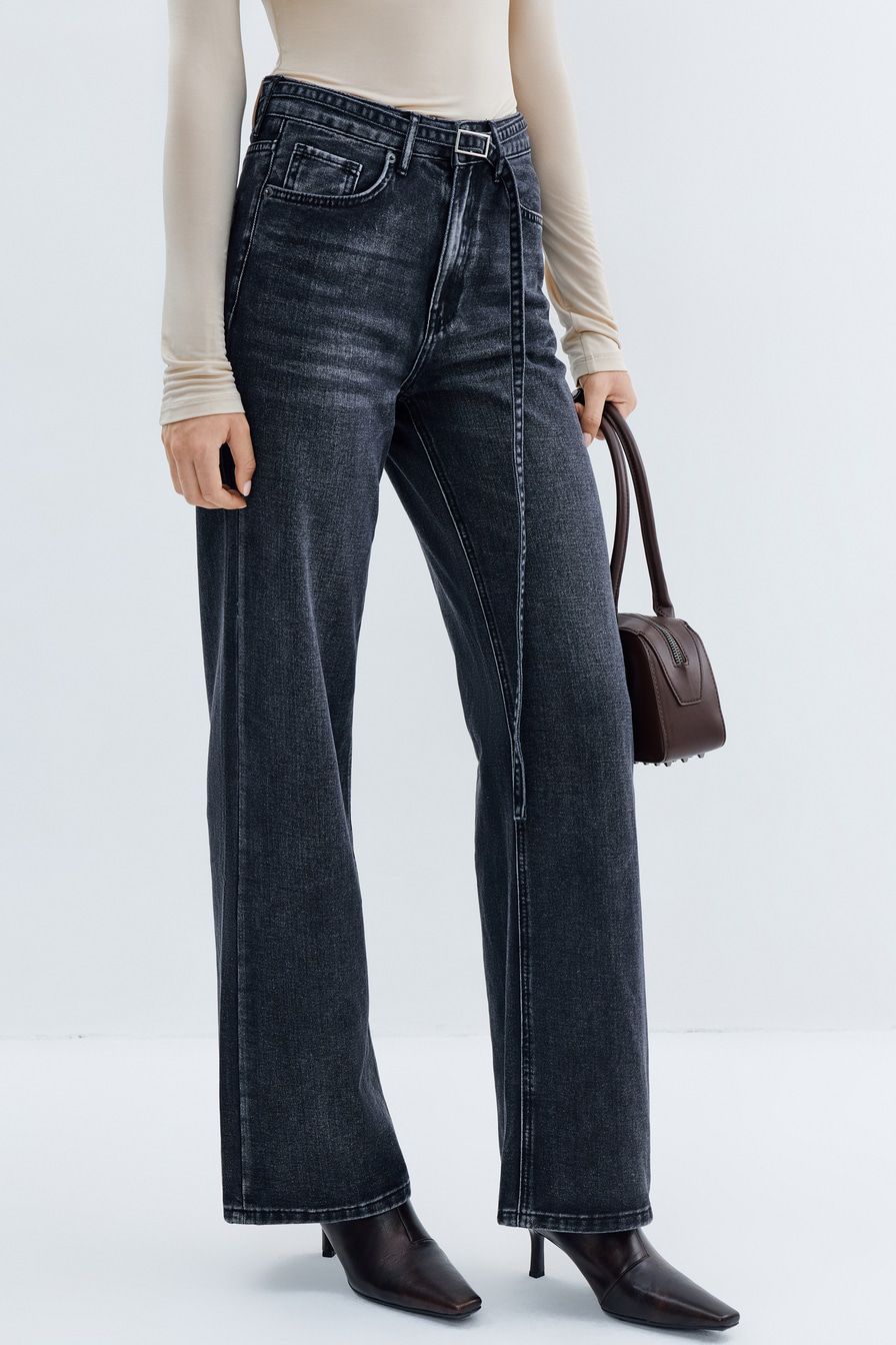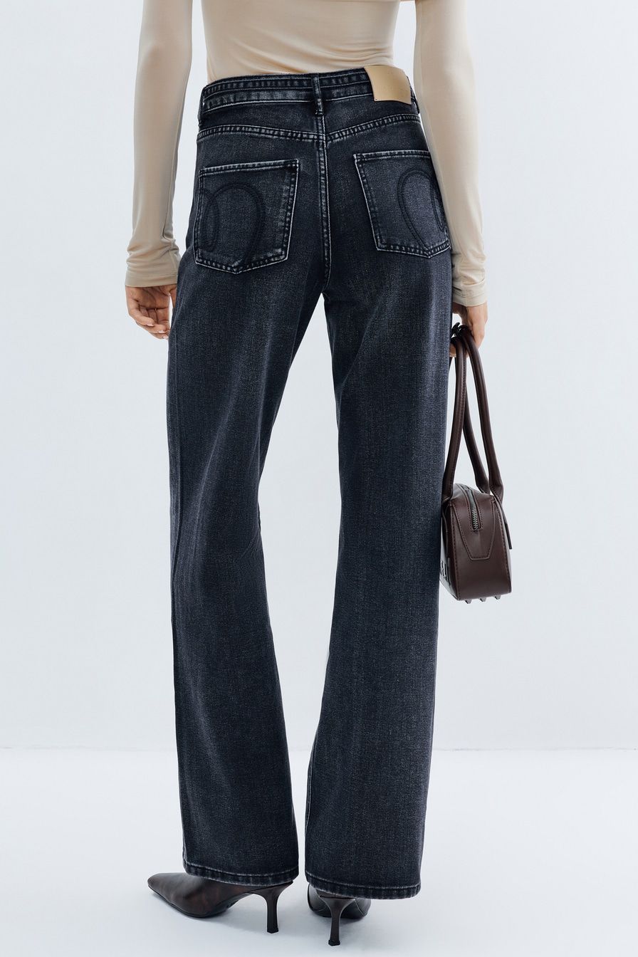 Широкие джинсы из смесового хлопка – модель выбеленного черного цвета с высокой посадкой. Задние карманы декорированы узорной вышивкой. Джинсы дополнены ремнем из основного материала.