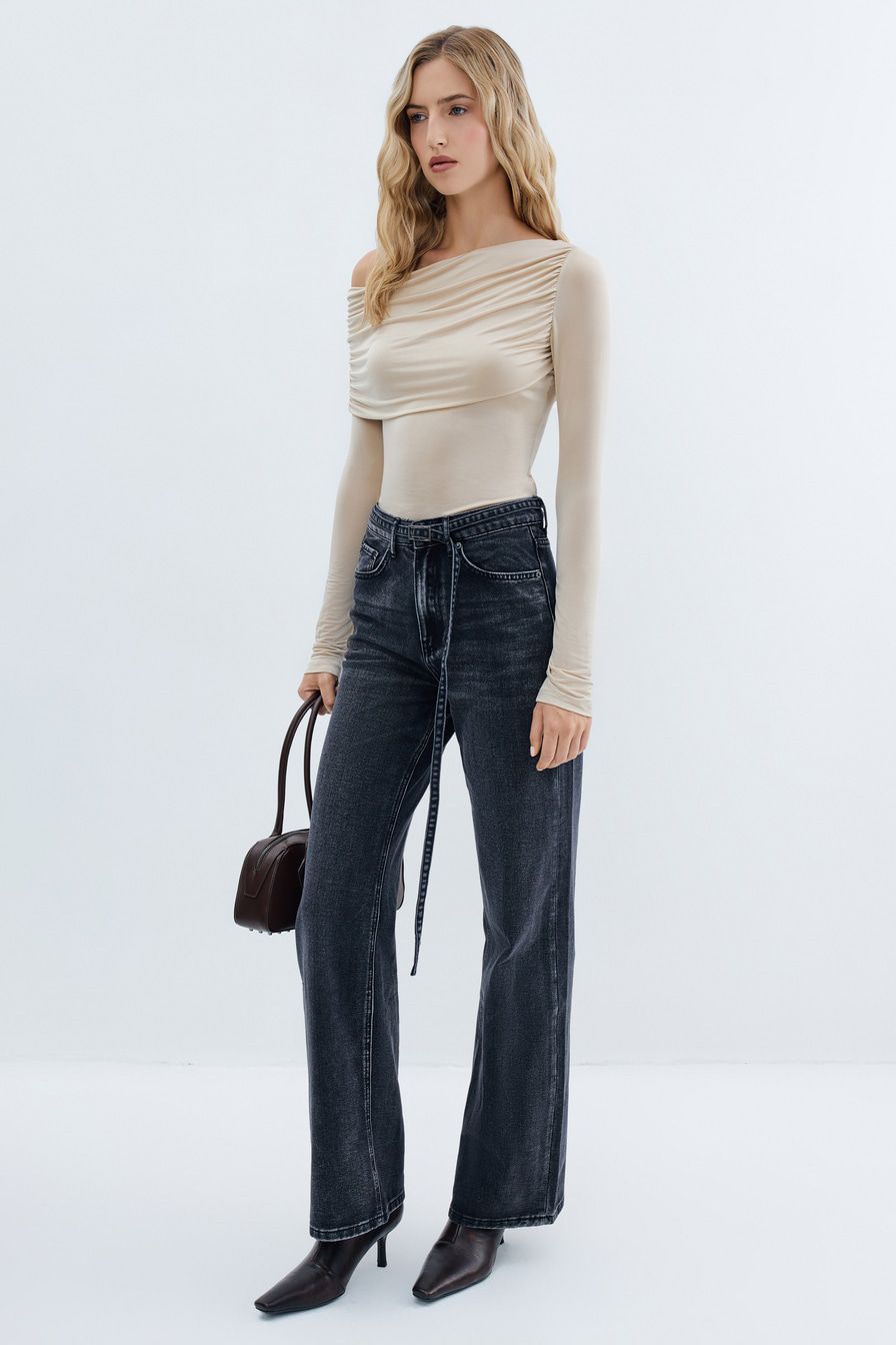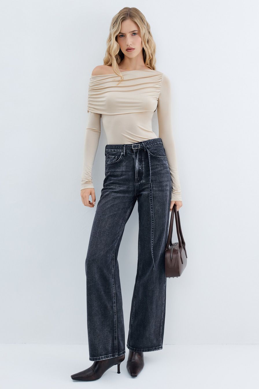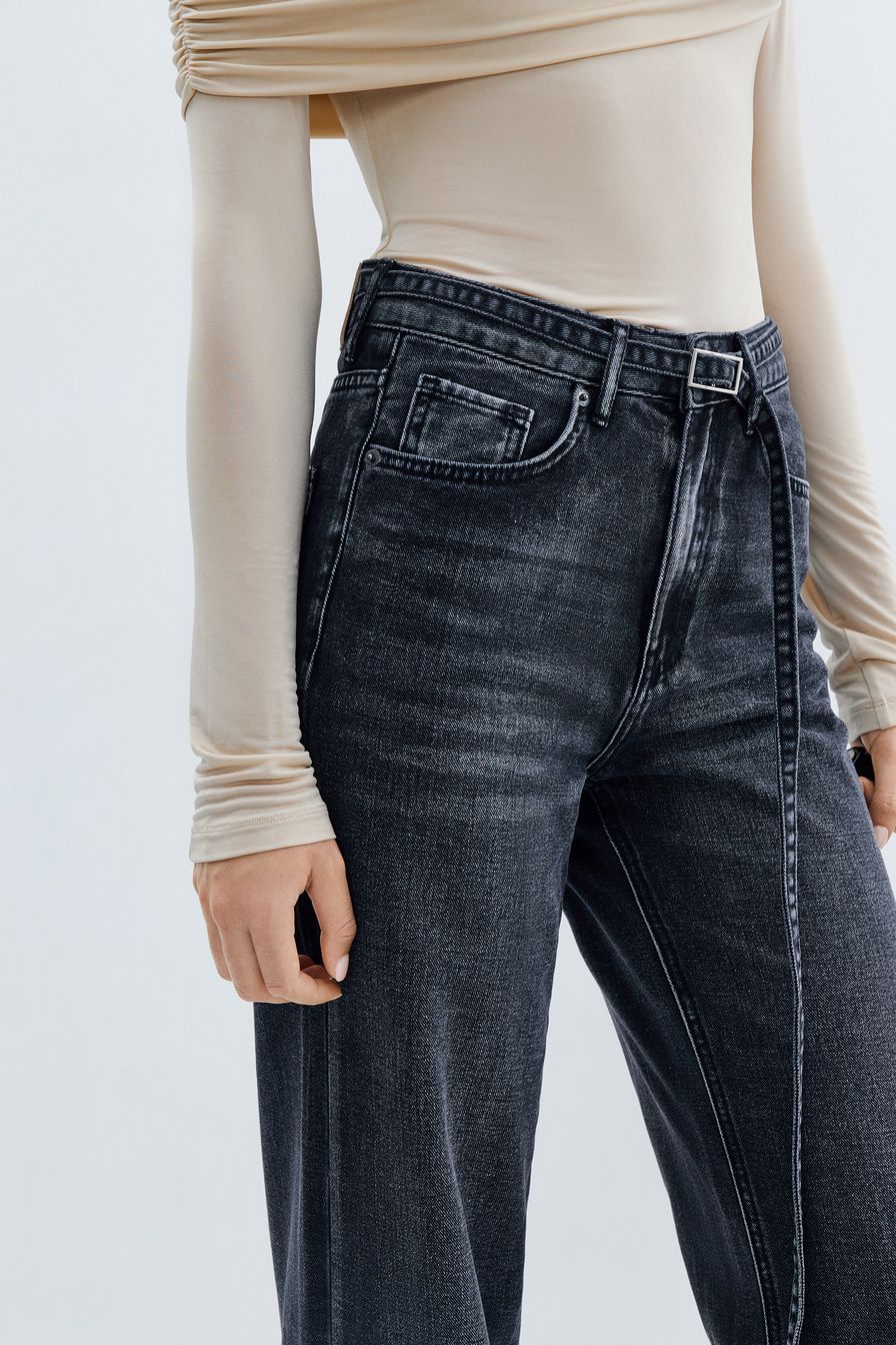 Широкие джинсы из смесового хлопка – модель выбеленного черного цвета с высокой посадкой. Задние карманы декорированы узорной вышивкой. Джинсы дополнены ремнем из основного материала.
