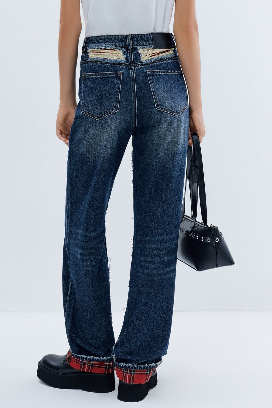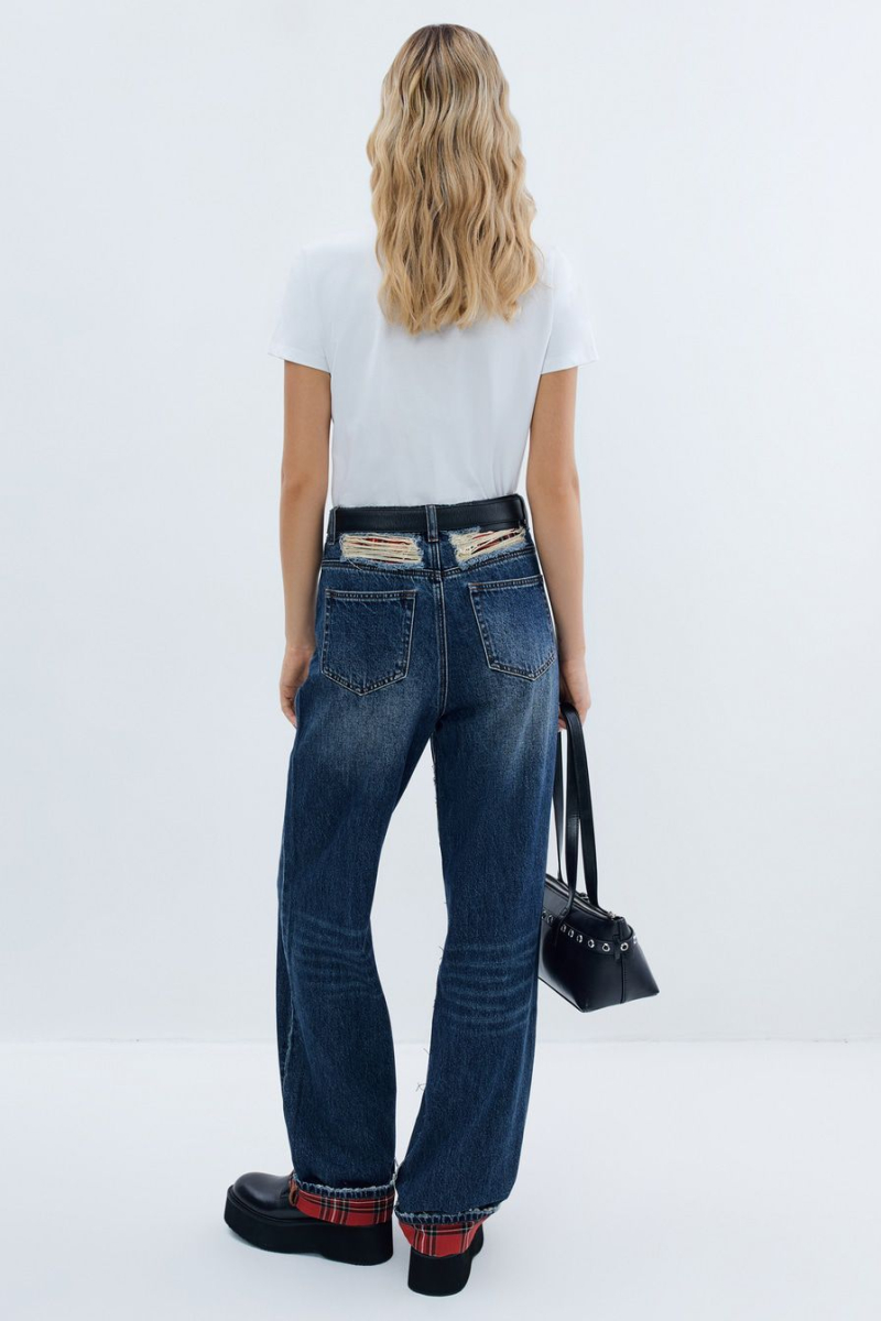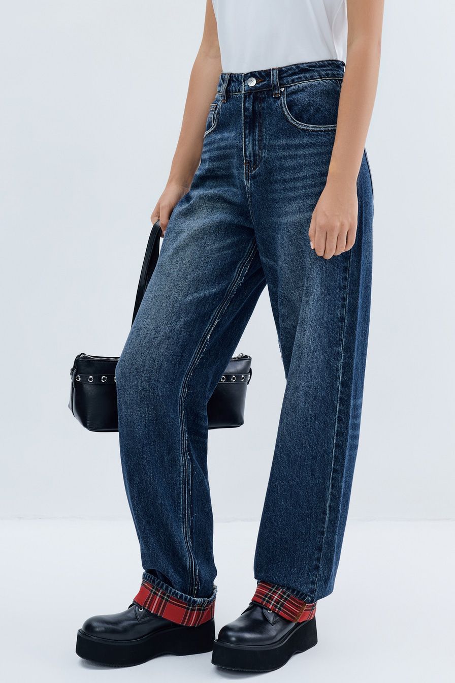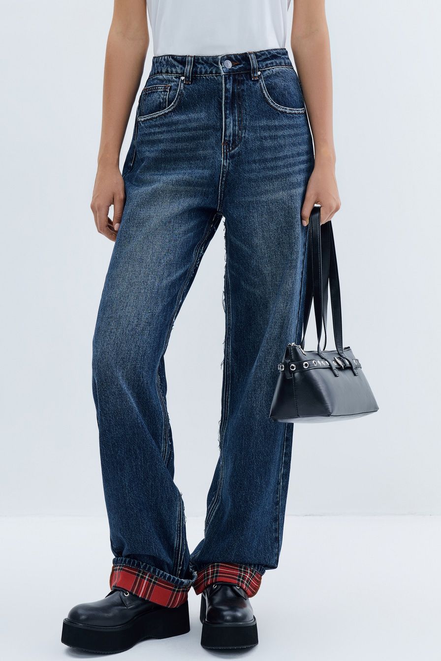 Широкие джинсы из 100% хлопка – модель прямого кроя с высокой посадкой. Джинсы декорированы потертостями и разрезами, дополнены отворотами с клетчатым принтом.