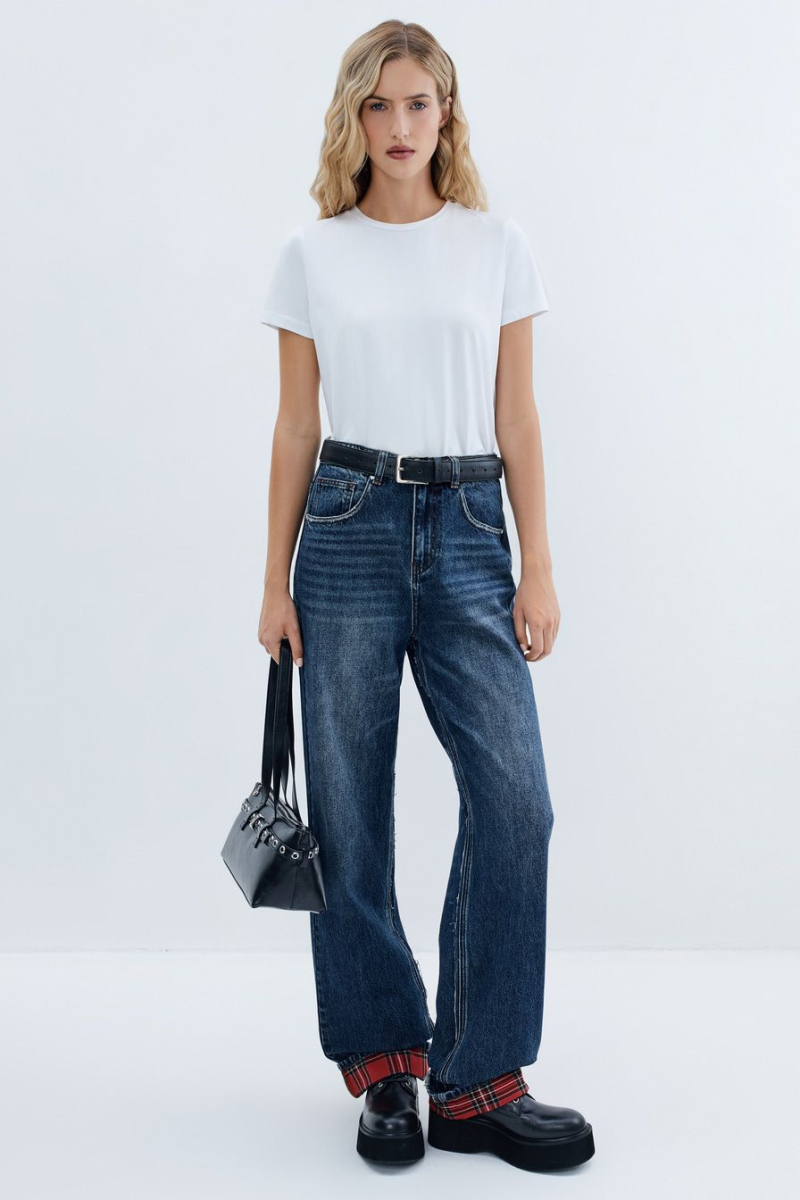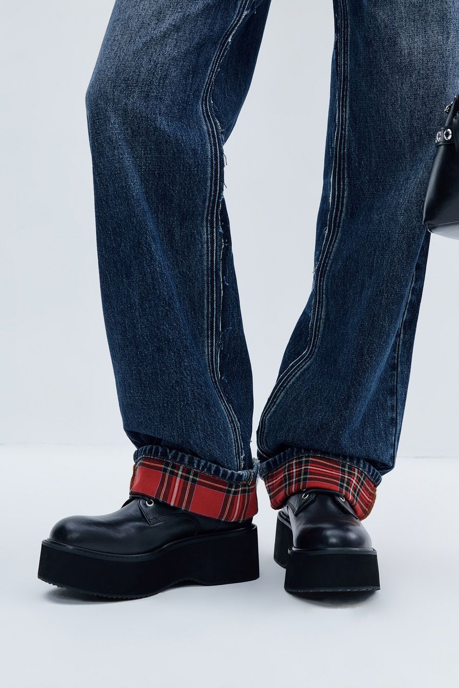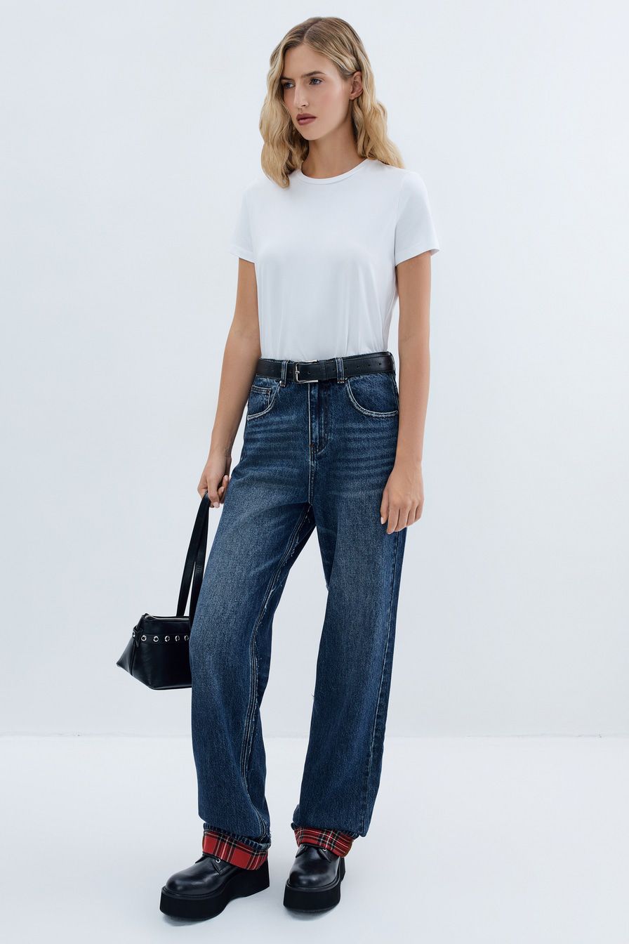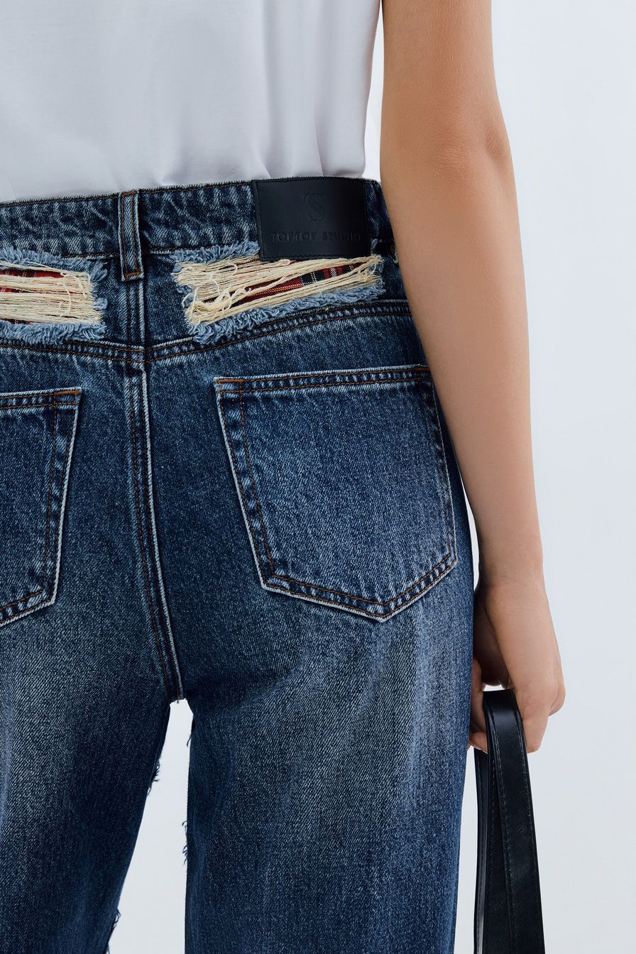 Широкие джинсы из 100% хлопка – модель прямого кроя с высокой посадкой. Джинсы декорированы потертостями и разрезами, дополнены отворотами с клетчатым принтом.