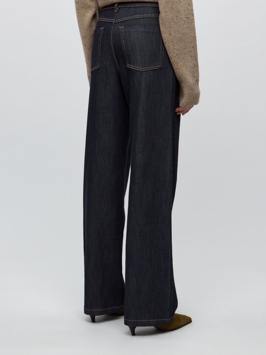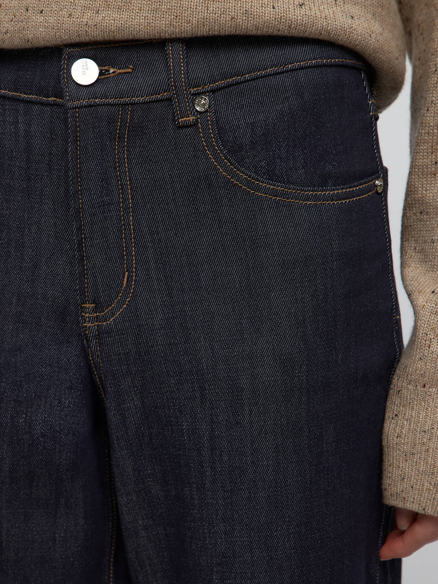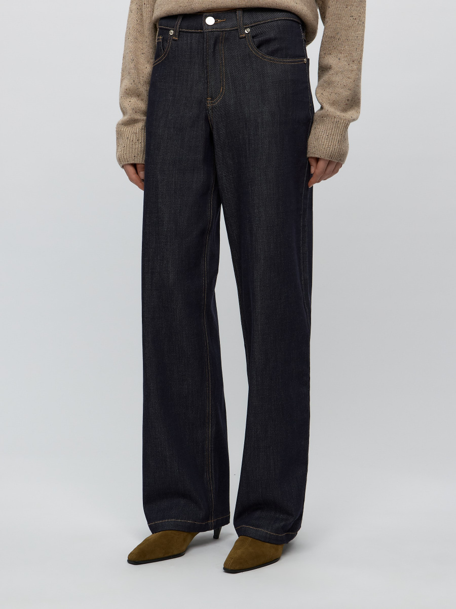 Классические джинсы straight fit — средняя посадка и облегание, полная длина. Выполнены с пятью карманами, традиционными оранжевыми строчками, металлической фурнитурой и шлевками под ремень. Правильная V-образная кокетка моделирует фигуру. Плотный деним со светлой изнанкой со временем приобретает красивые потертости.