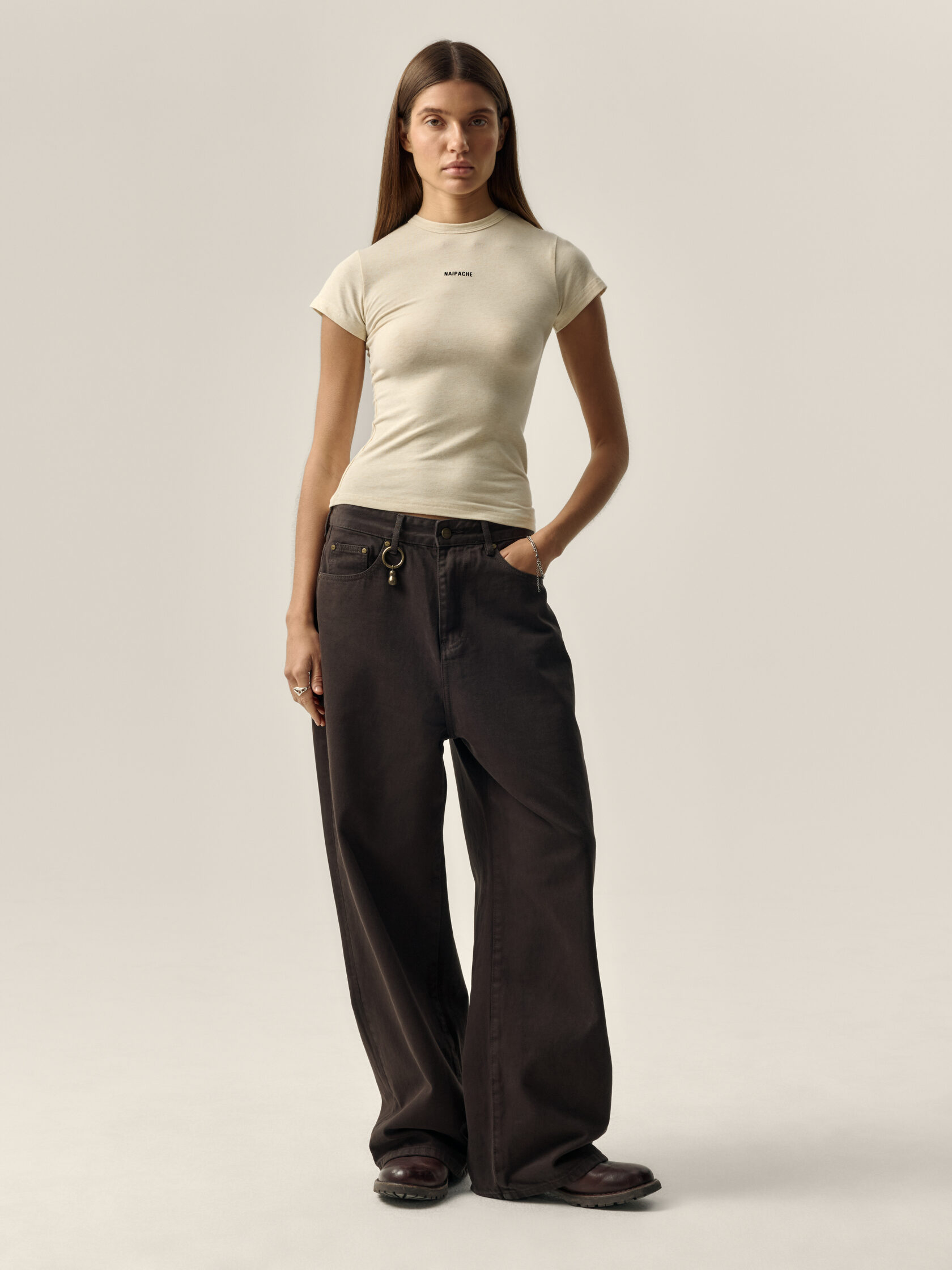 Приталенная футболка универсального размера (one-size). Классический трикотаж с гладкой поверхностью внутри и снаружи. Обладает высокой воздухопроницаемостью для комфорта и отлично держит форму. Облегающий крой подчеркивает силуэт без стеснения движений. Минималистичный логотип добавляет изысканный акцент. Балансируйте облегающий верх с джинсами или свободными брюками. Плотность ткани - 175 г/м².