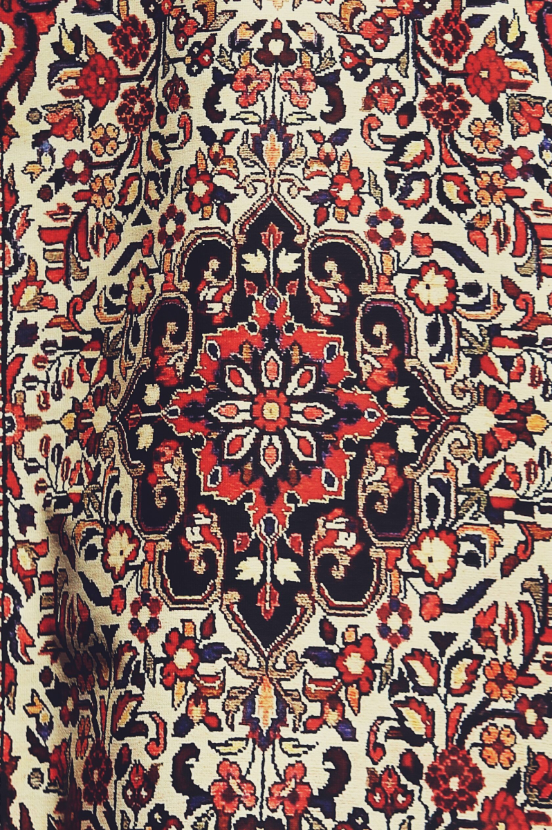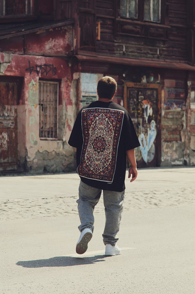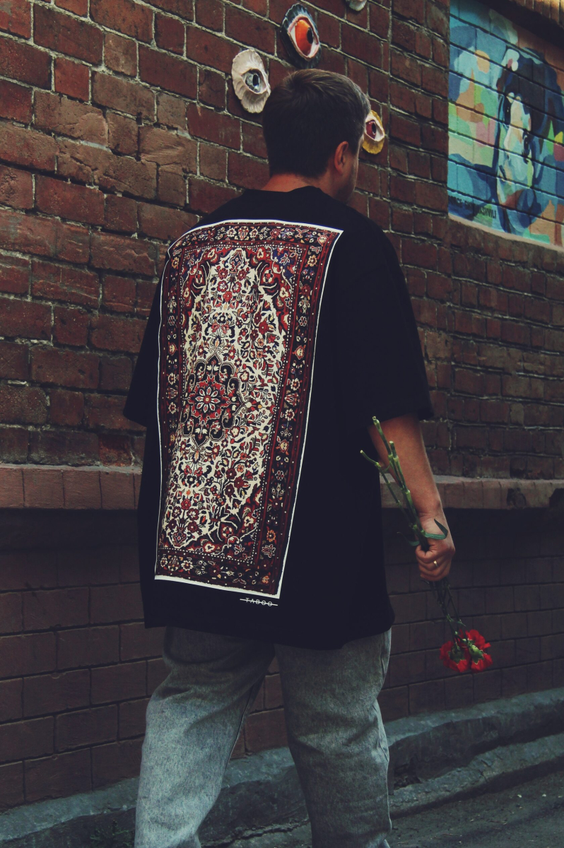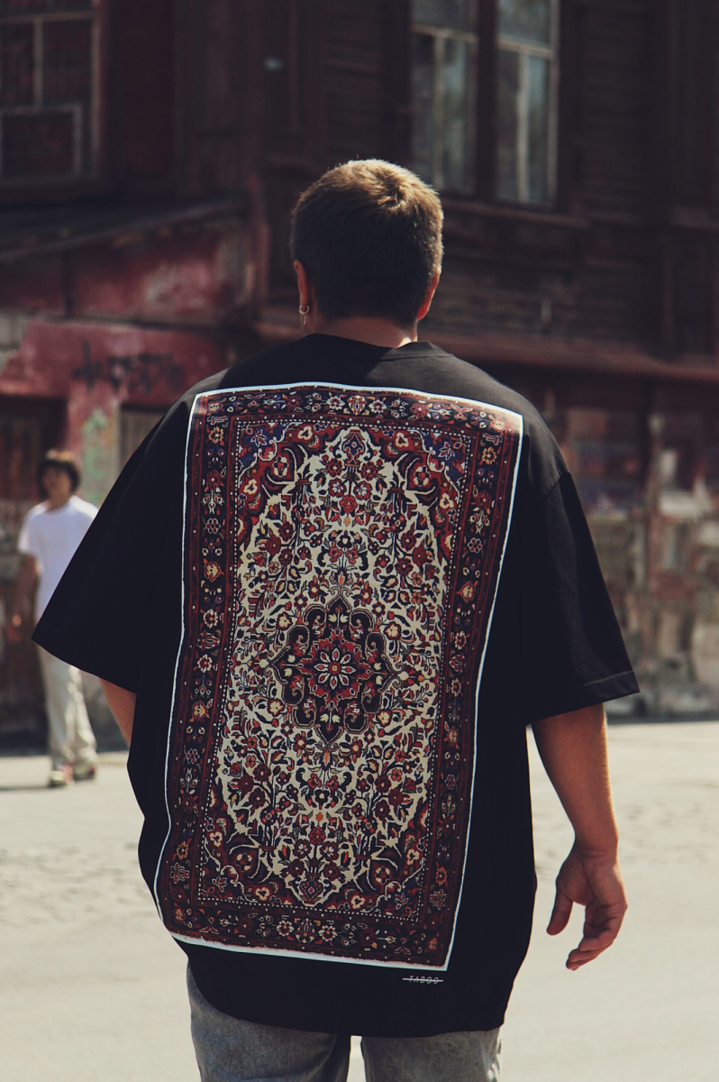 Футболка максиовер объемного кроя с принтом ковра, расположенном на спине.