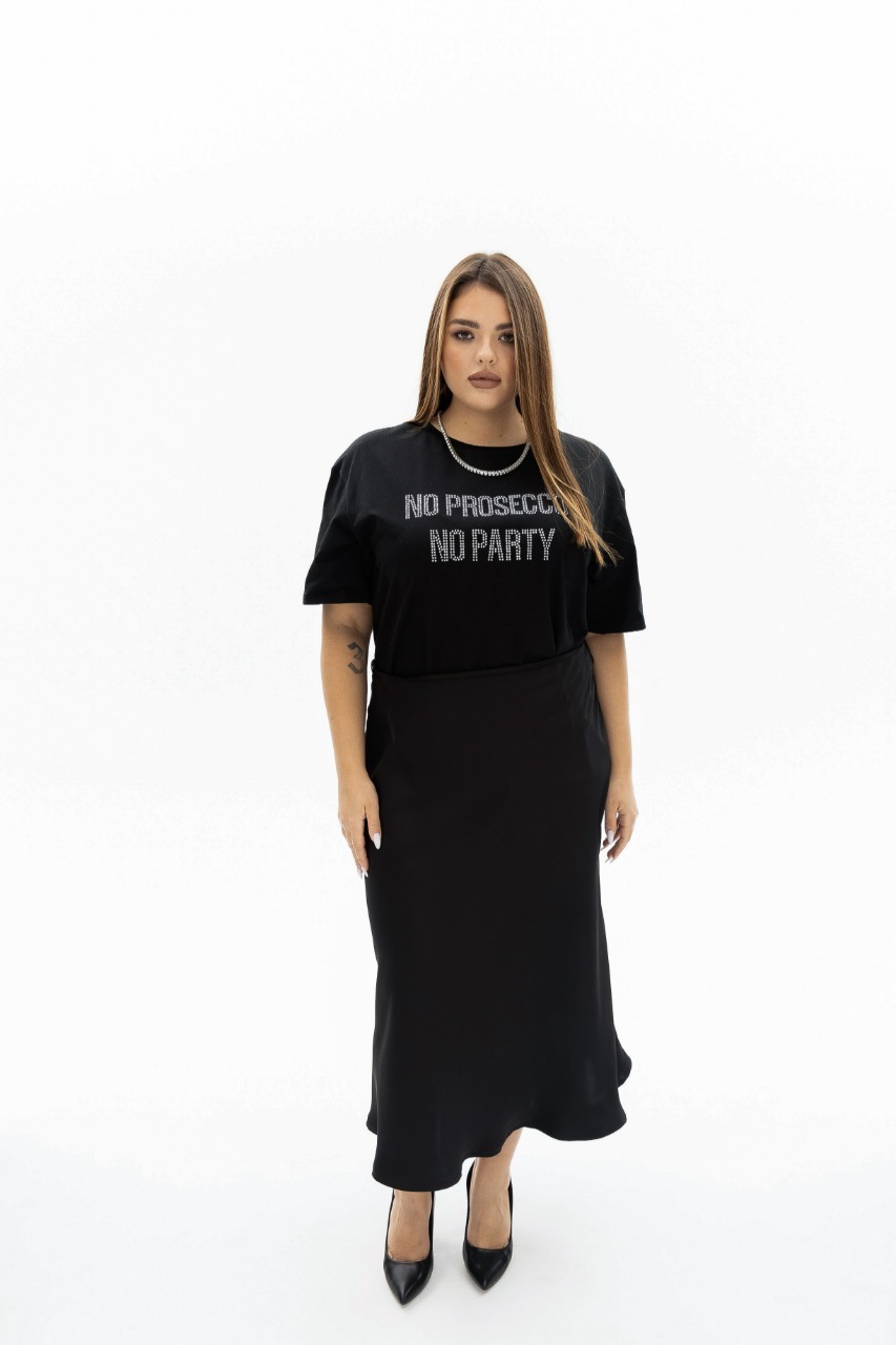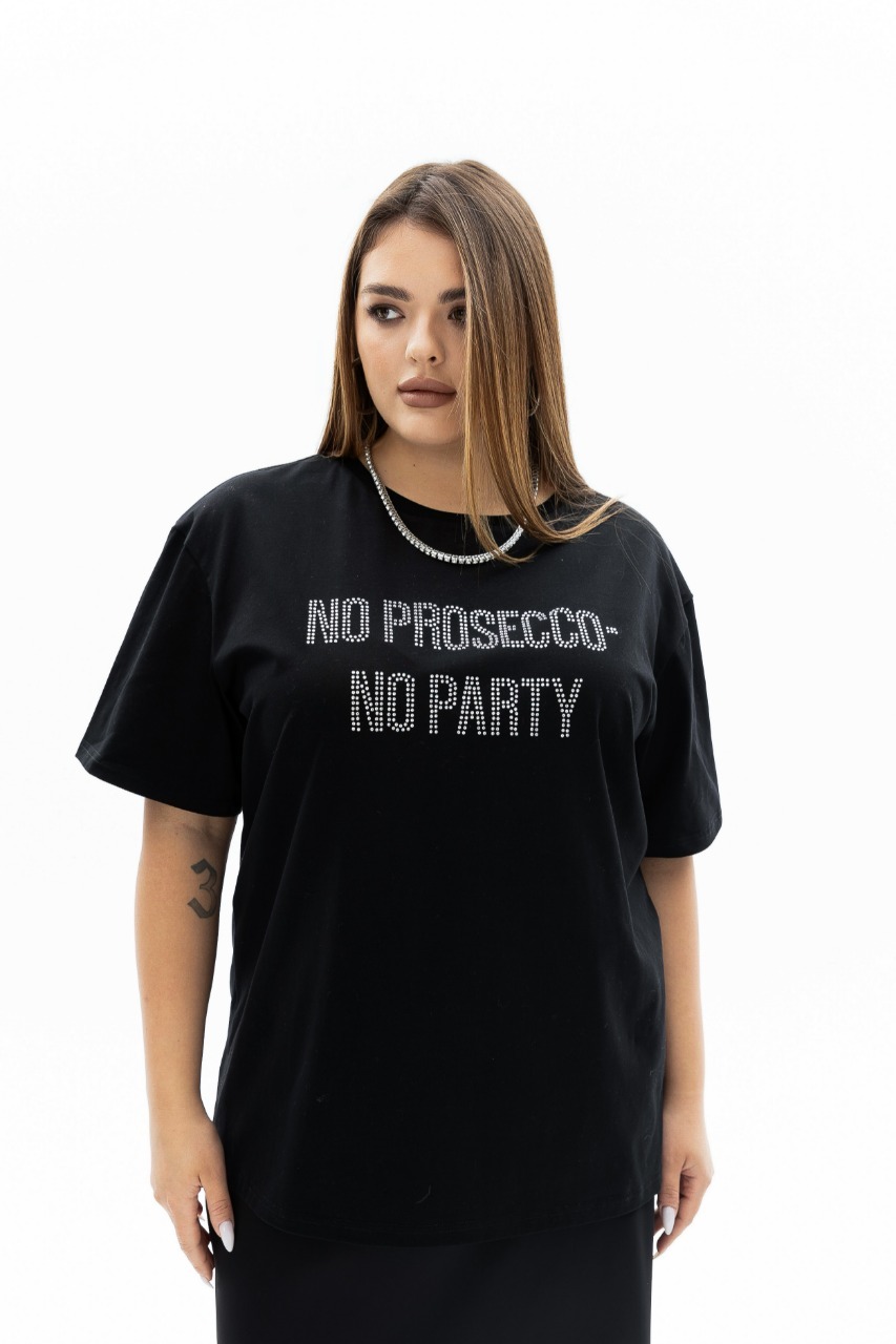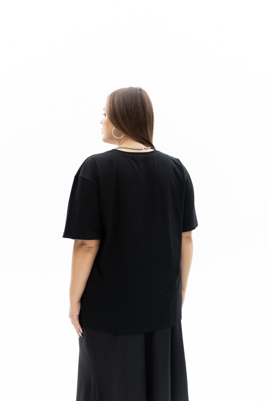 Чёрная футболка с надписью из страз добавит утончённости в каждодневный образ, а в паре с атласной юбкой, либо брюками с перьями создаст полноценный праздничный наряд.
