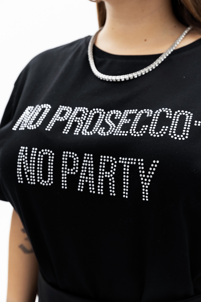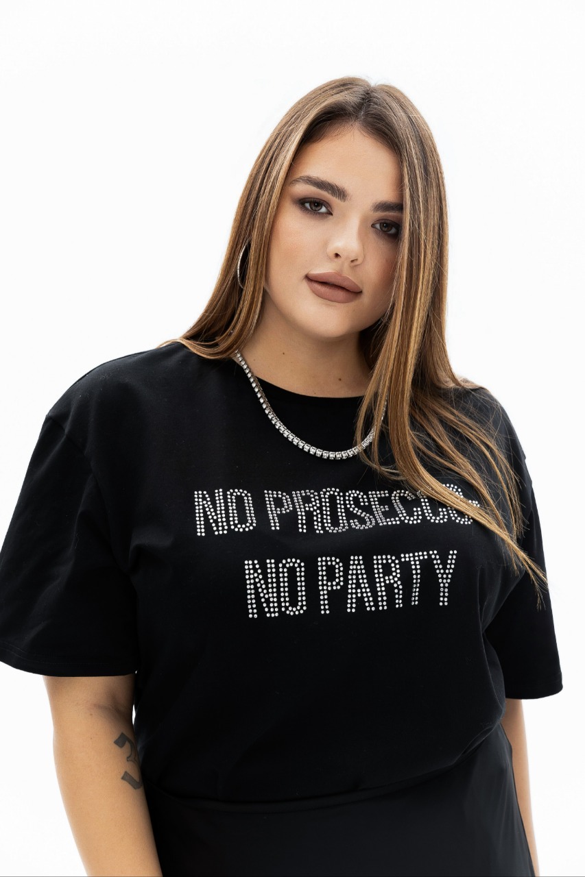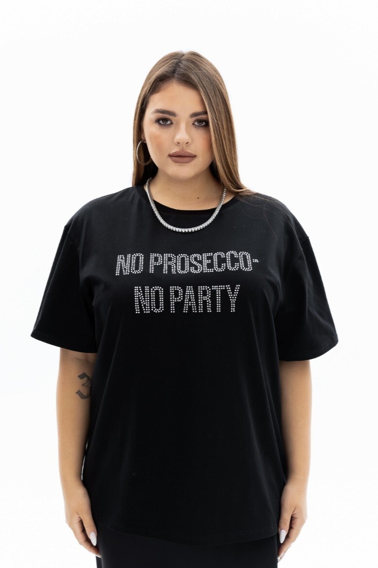 Чёрная футболка с надписью из страз добавит утончённости в каждодневный образ, а в паре с атласной юбкой, либо брюками с перьями создаст полноценный праздничный наряд.