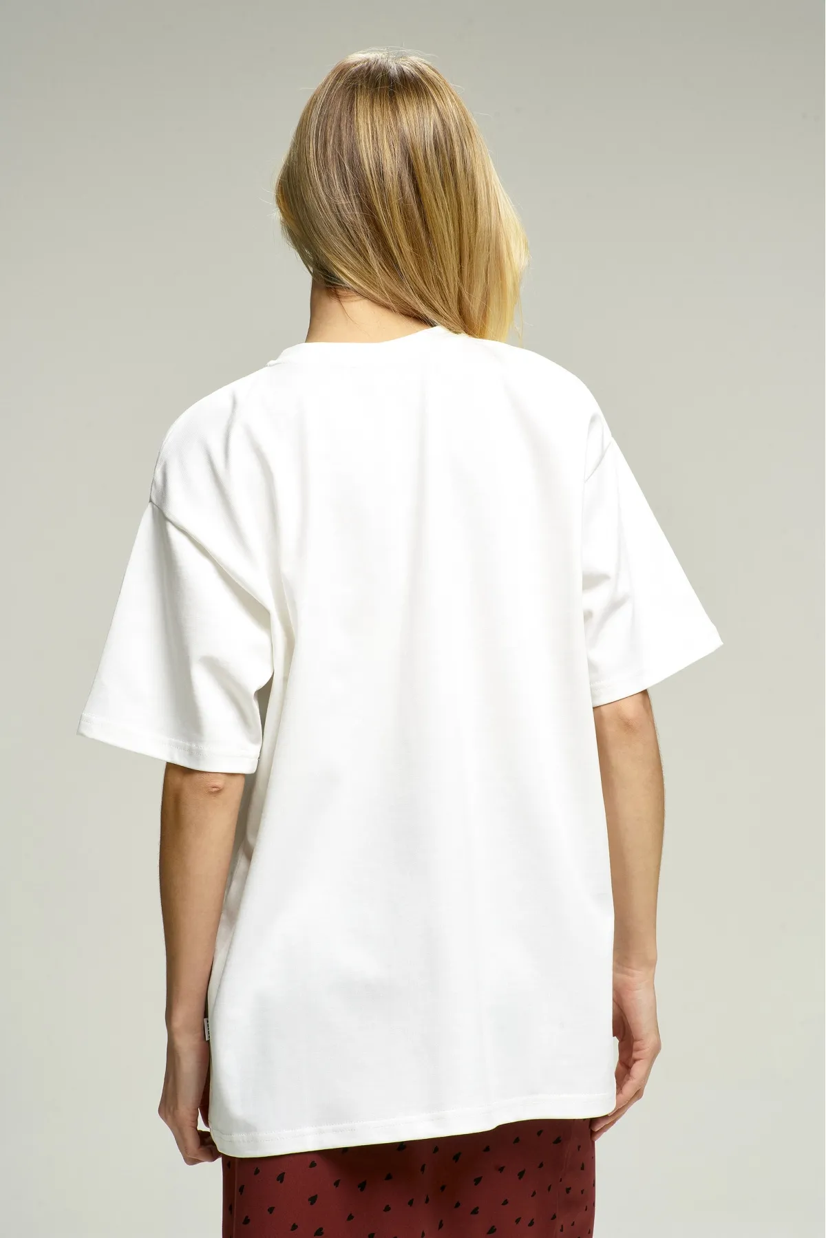 Материал не просвечивает и прекрасно дышит, обеспечивая комфорт в течение всего дня. Свободный силуэт OS легко вписать в повседневные образы. Принт выполнен с помощью высокотехнологичной печати, а значит, изделие надолго сохранит свой безупречный вид.