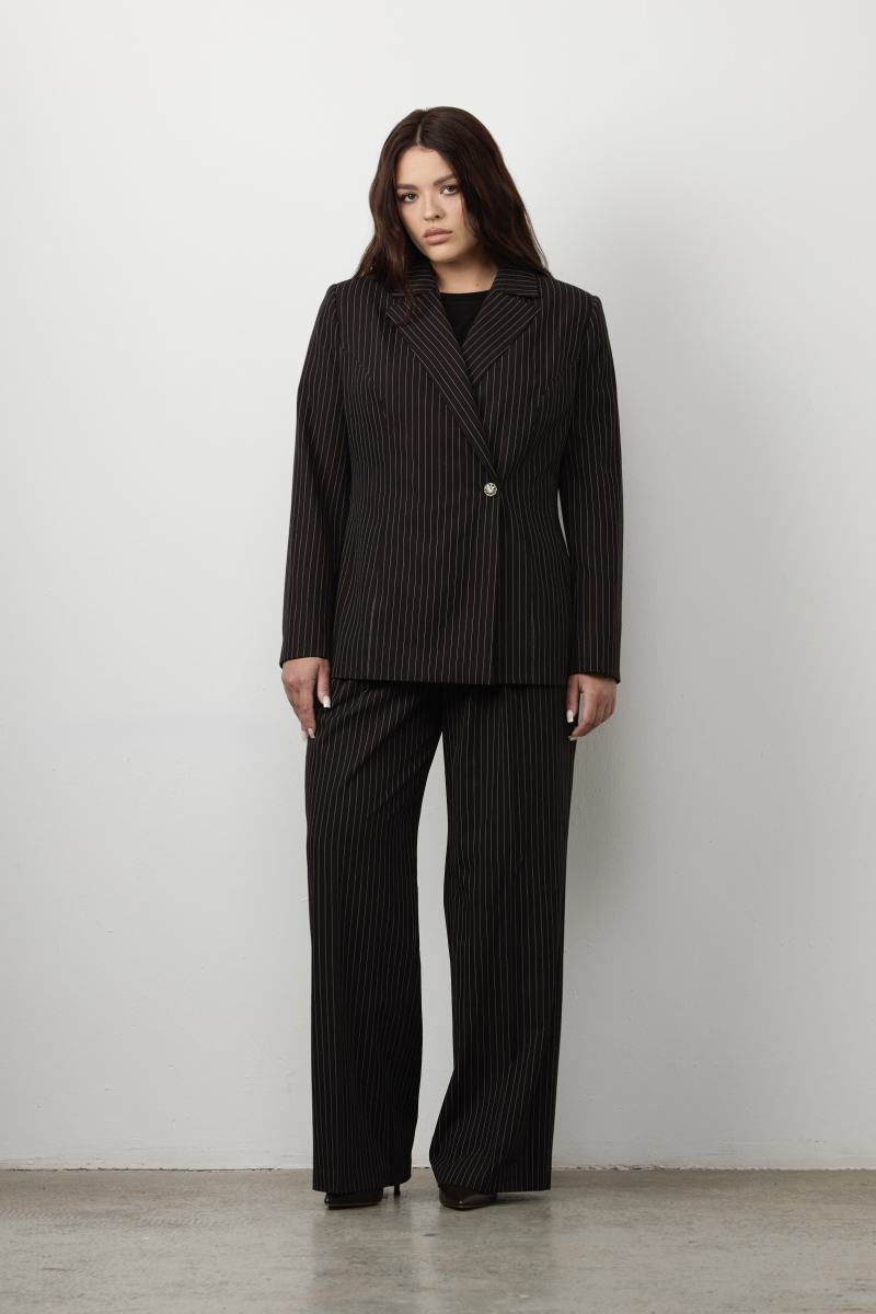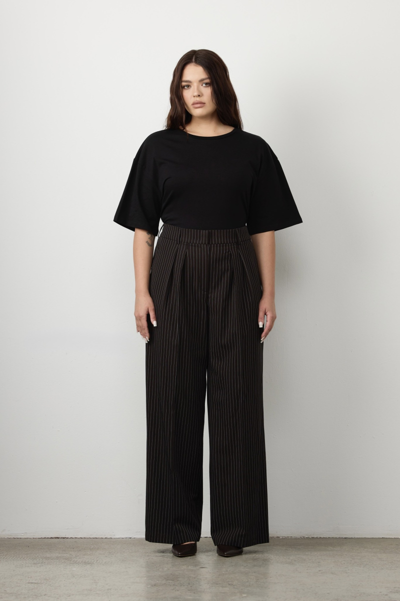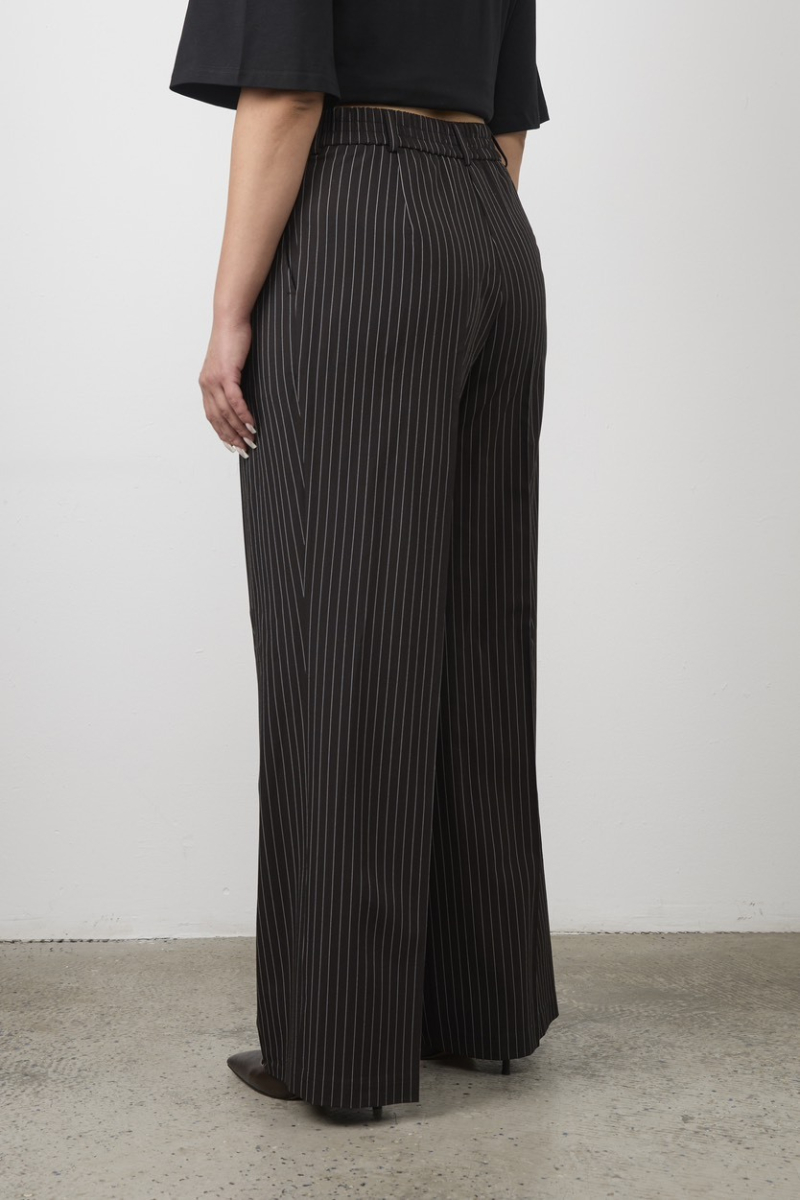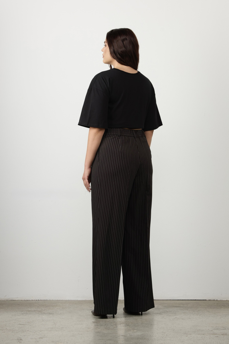 Базовые брюки прямого кроя со стрелками в полоску черного цвета.
