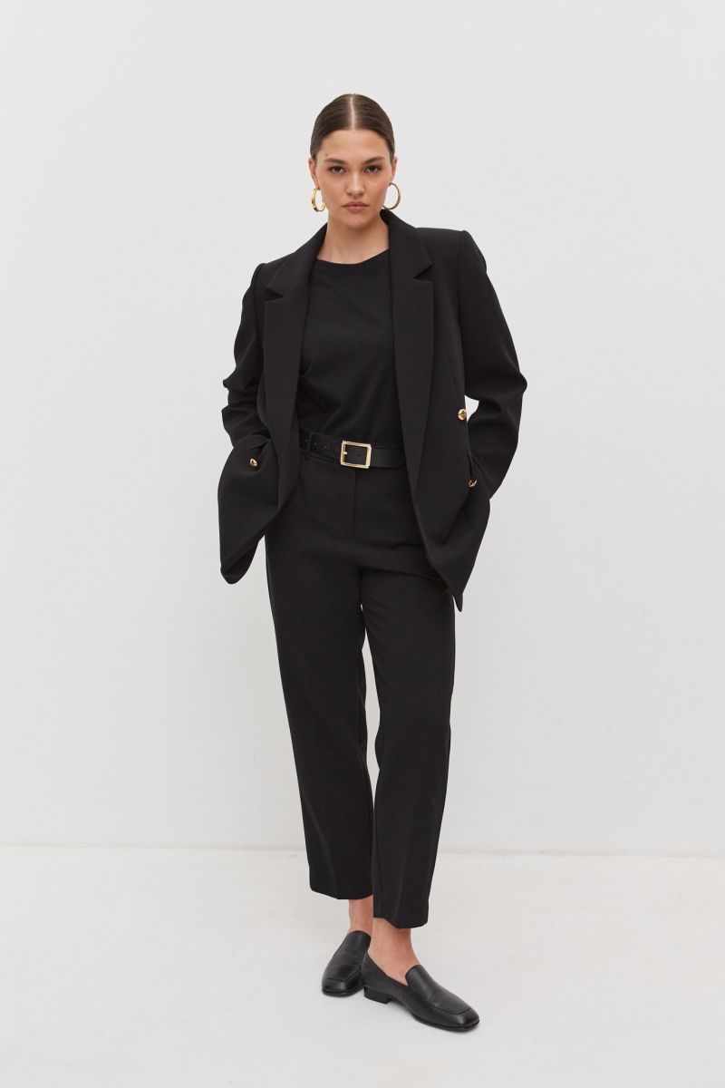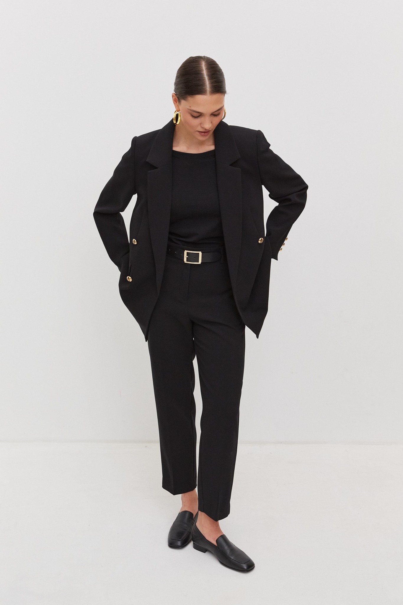 Базовые укороченные брюки классического кроя в черном цвете. Брюки из костюмной ткани, средняя посадка. В пояс брюк по бокам вставлена резинка.