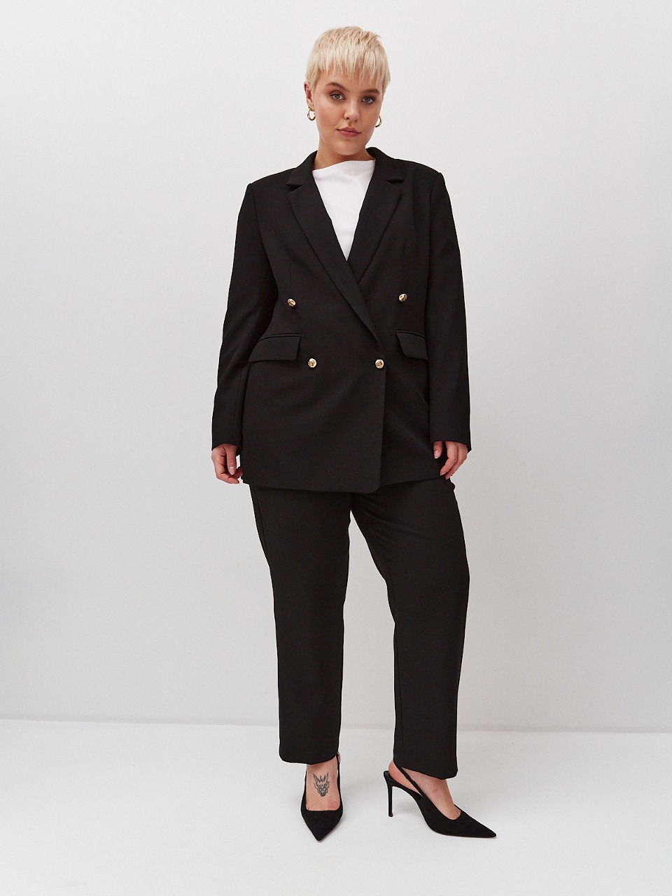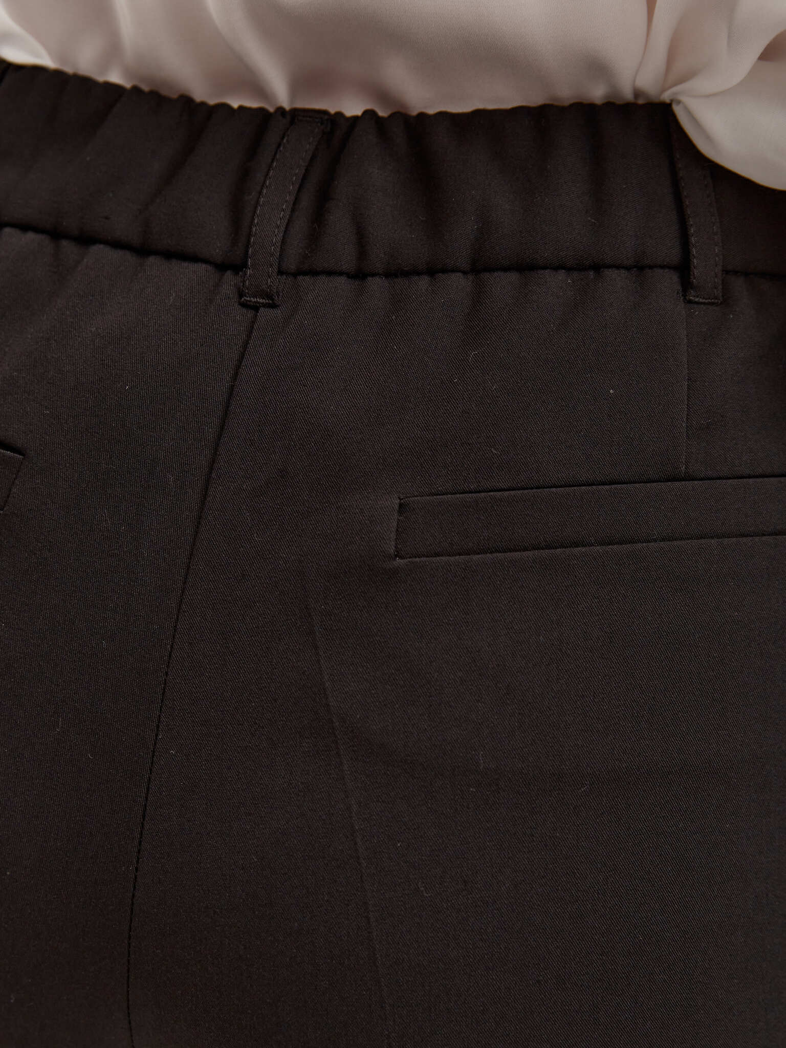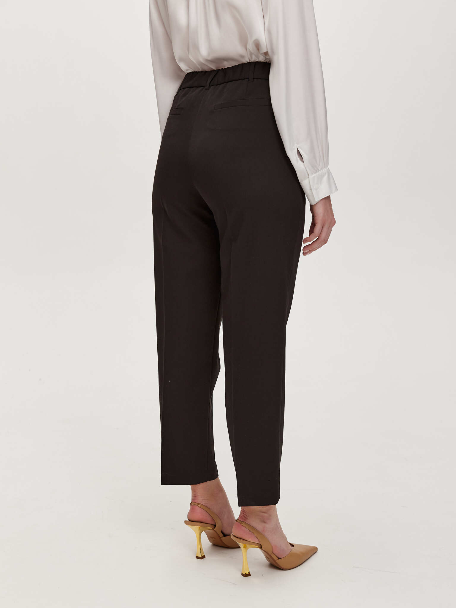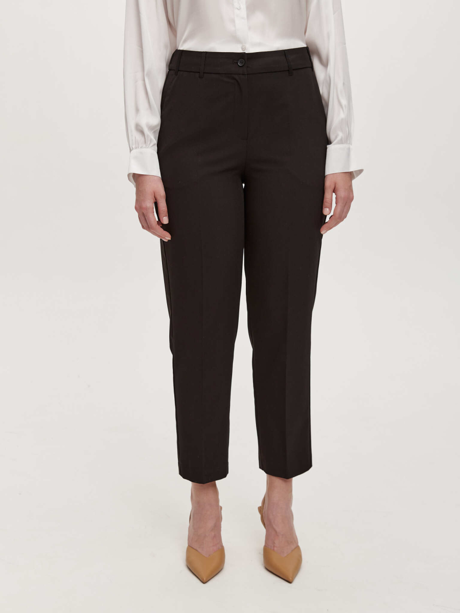 Базовые брюки классического кроя в черном цвете. Брюки из костюмной ткани, средняя посадка. В пояс брюк по бокам вставлена резинка.