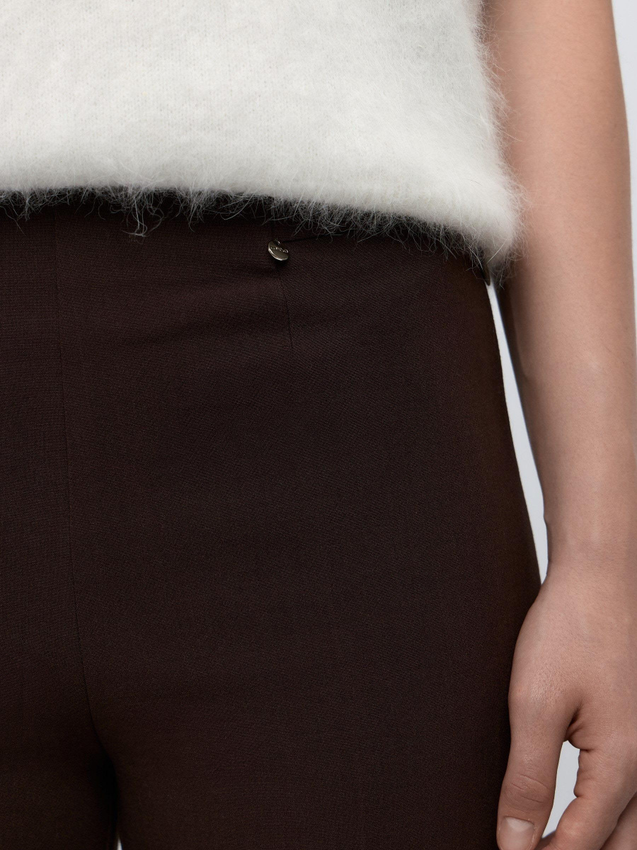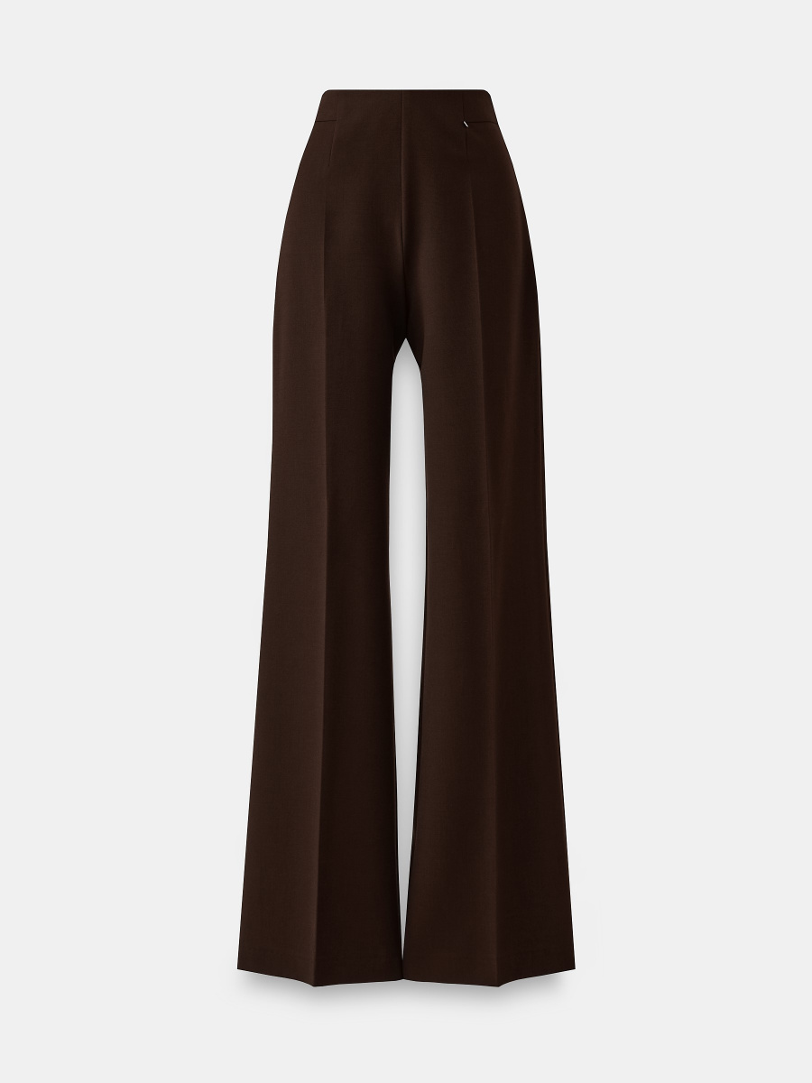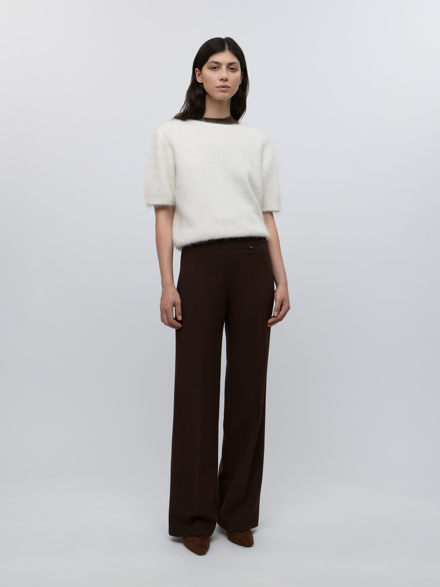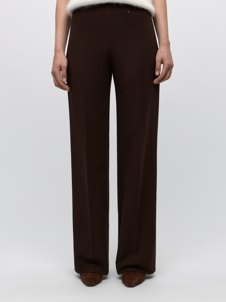 Классические широкие брюки с заутюженными стрелками. На высокой посадке, цельнокроеные по передней части и с отрезным поясом — на спинке. Для модели выбрано смесовое костюмное полотно средней плотности. Ткань не мнется и не растягивается, поддерживая исходную геометрию линий. Незаметная боковая застежка на молнию.