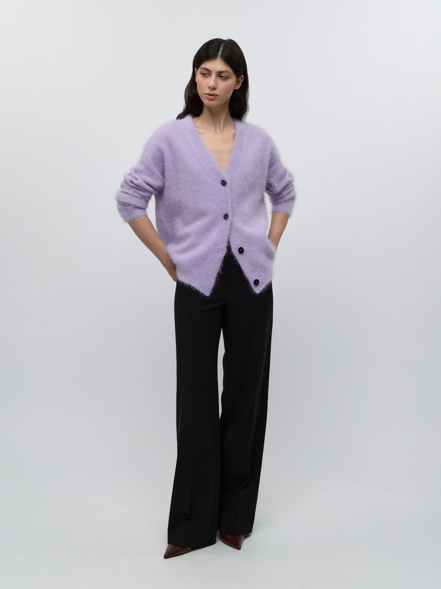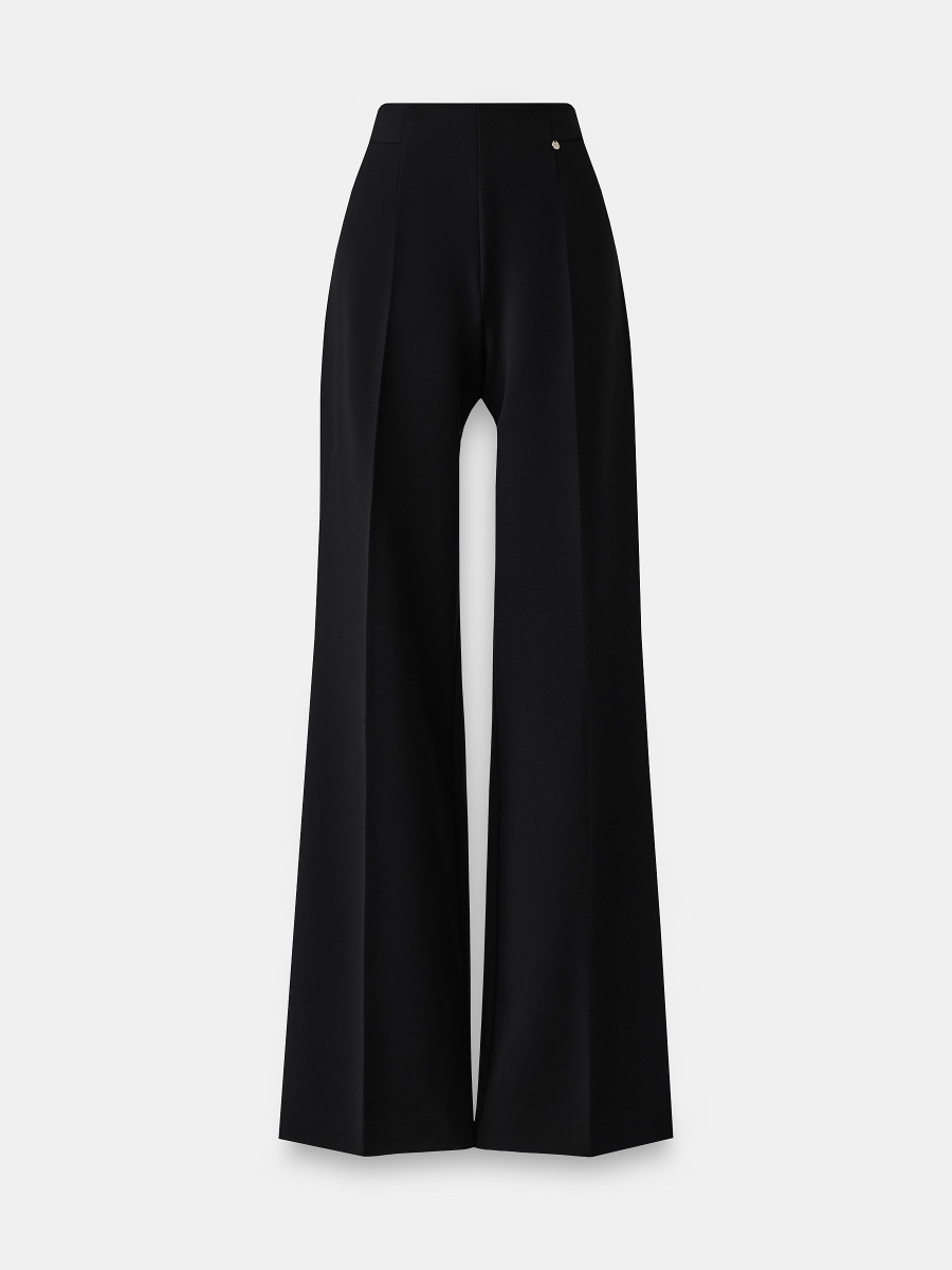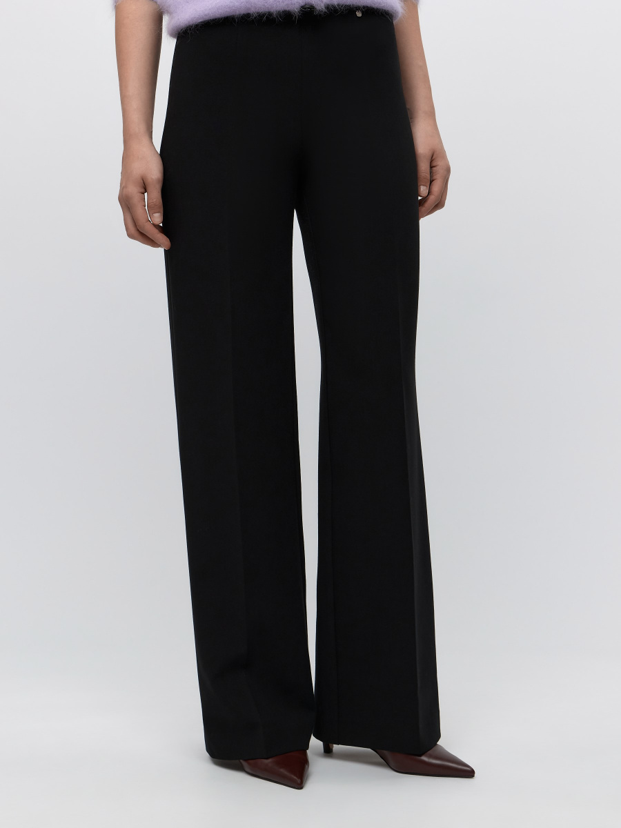 Классические широкие брюки с заутюженными стрелками. На высокой посадке, цельнокроеные по передней части и с отрезным поясом — на спинке. Для модели выбрано смесовое костюмное полотно средней плотности. Ткань не мнется и не растягивается, поддерживая исходную геометрию линий. Незаметная боковая застежка на молнию.