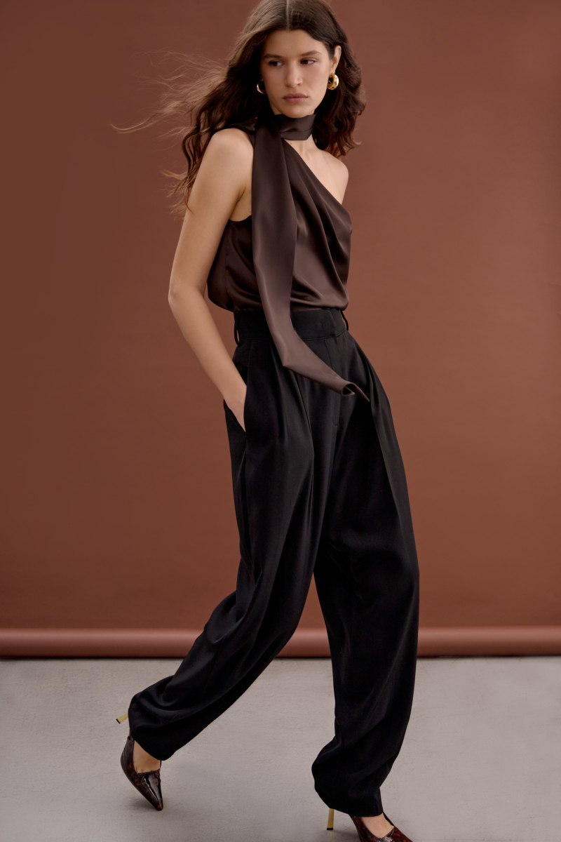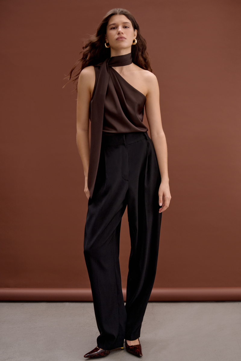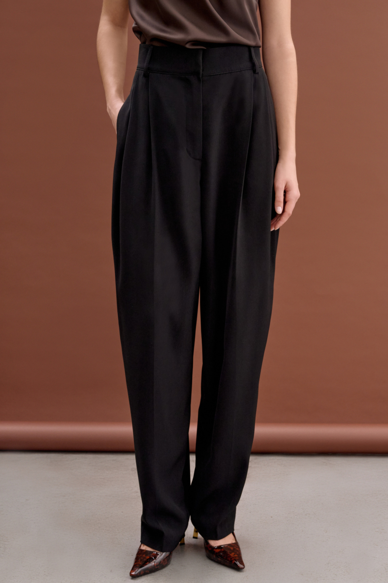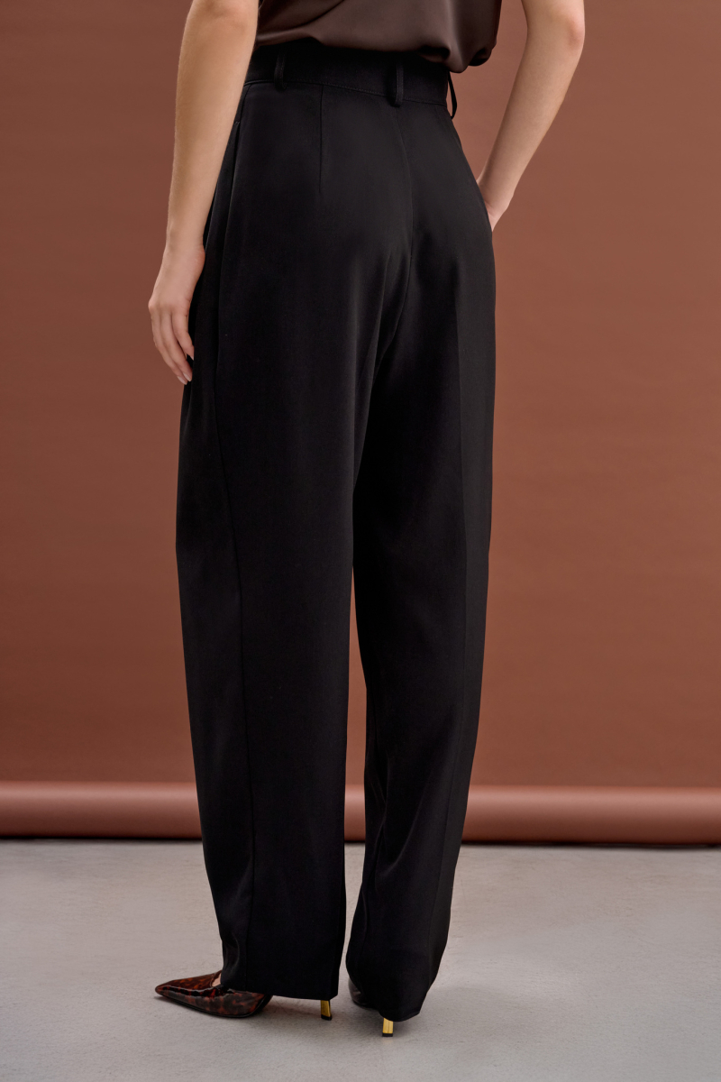 Черные брюки-бананы из стильной костюмной ткани – идеальный выбор для вашего гардероба! Элегантность силуэта подчеркнет фигуру, а комфорт материала позволит забыть о неудобствах. В составе 78% вискозы, что обеспечивает мягкость и легкость ухода.