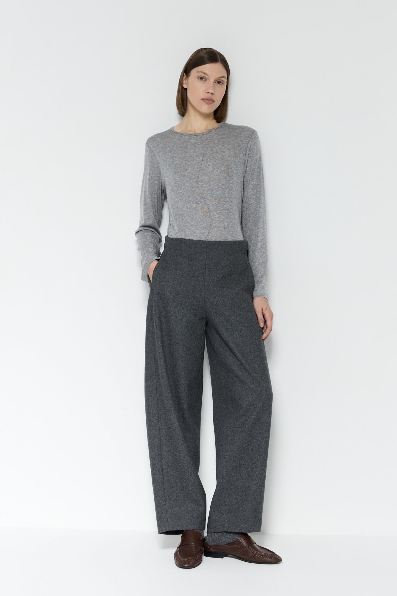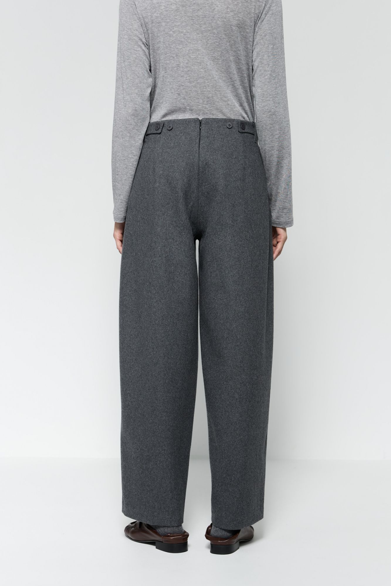 Длинные брюки «barrel pants». Их особенность в округлом силуэте: крой расширен в области колен и слегка заужен к низу. Модель без отрезного пояса. На талии есть хлястики, которые можно перестегнуть на пуговицы. От этого зависит посадка: более приталенная, средняя или слегка на бедрах.