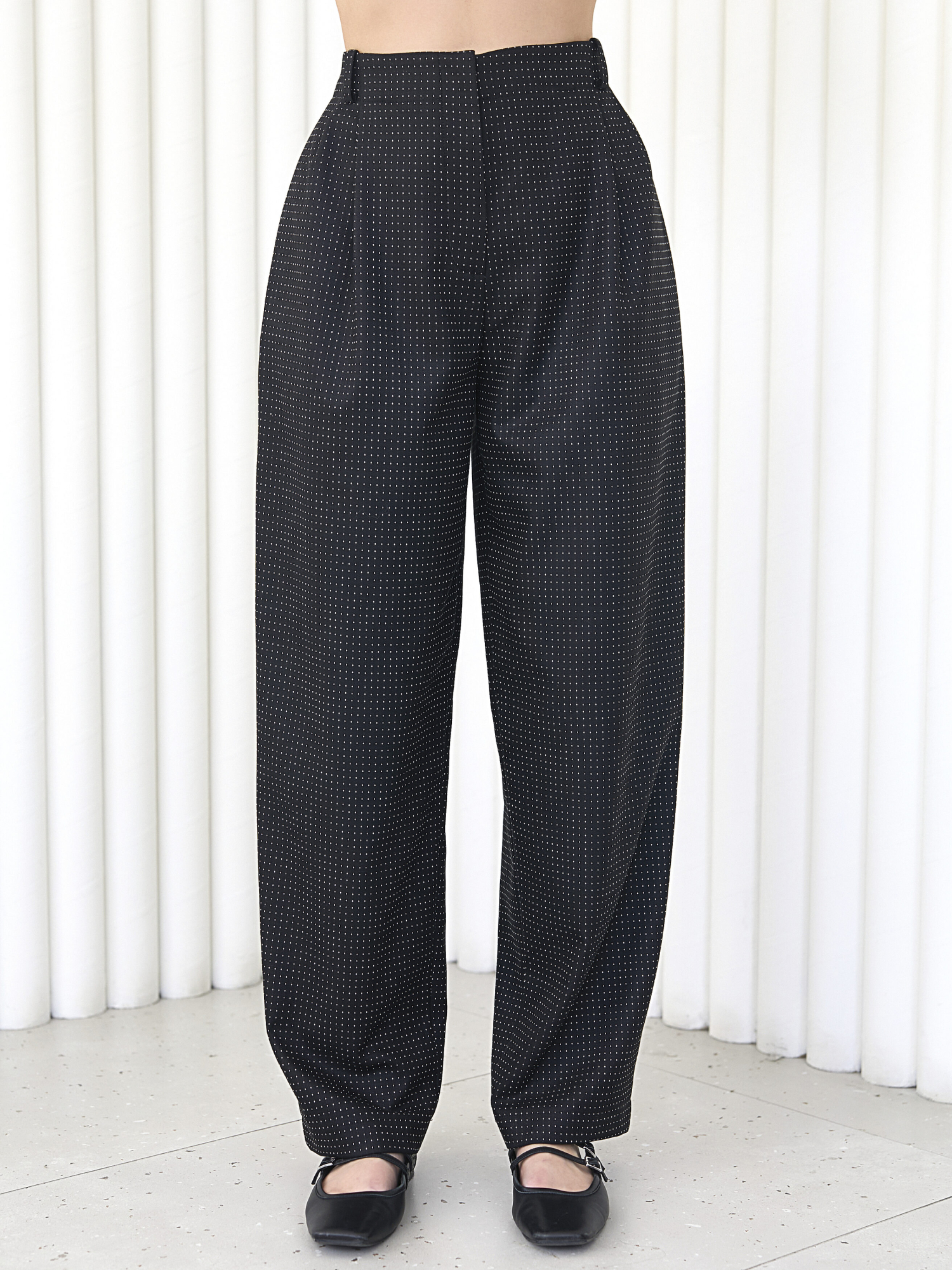Удобные брюки о-образного силуэта, зауженные к низу, с простроченными стрелками. Высокая линия талии делает фигуру стройнее.