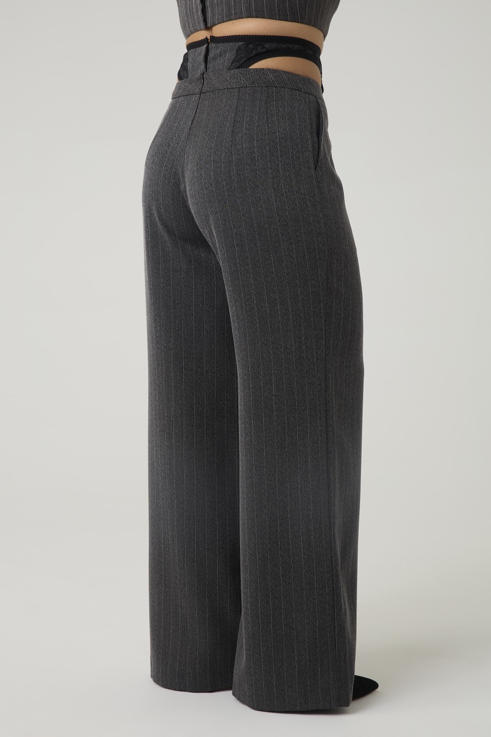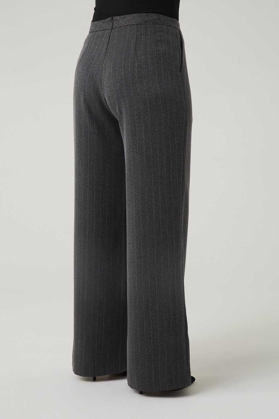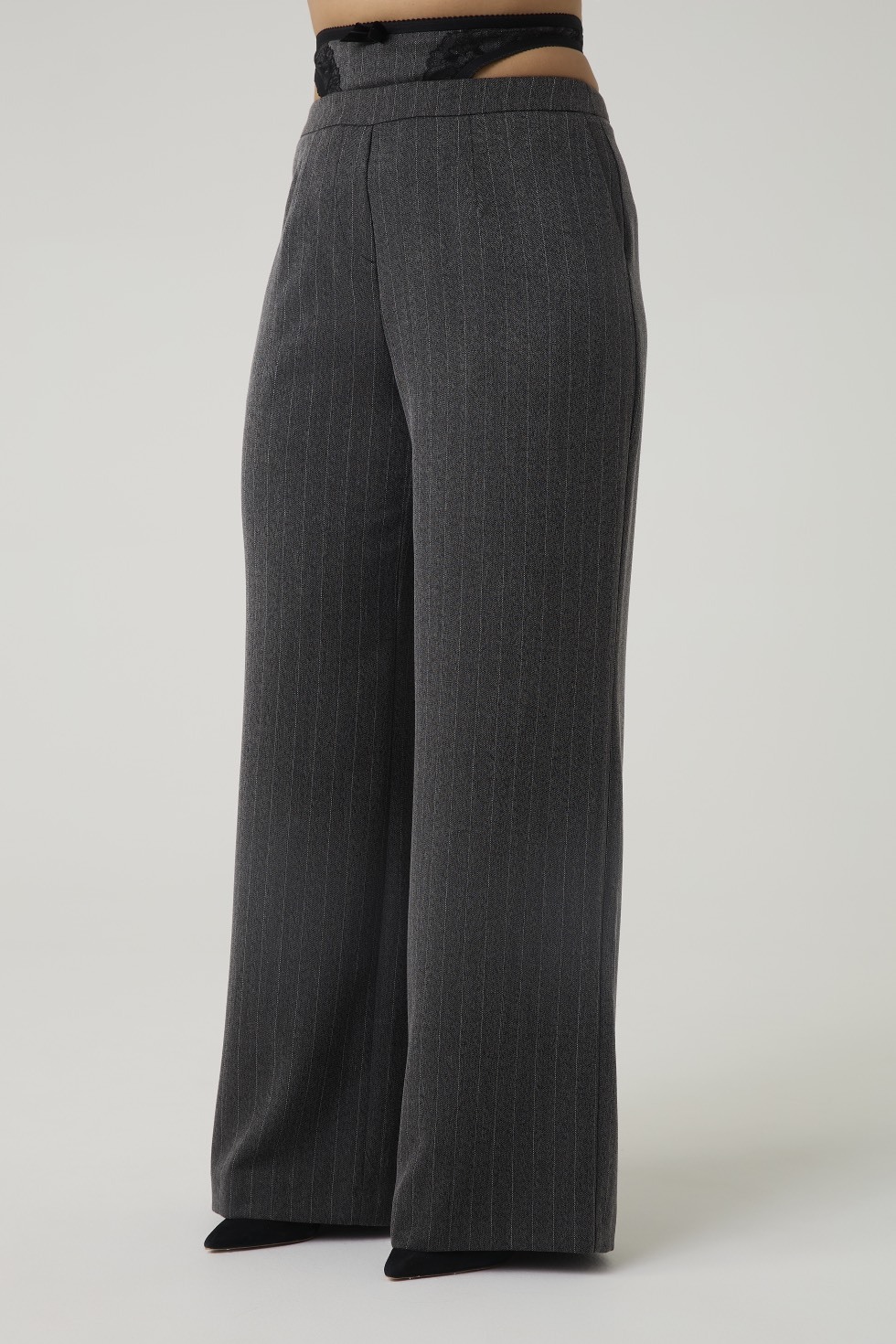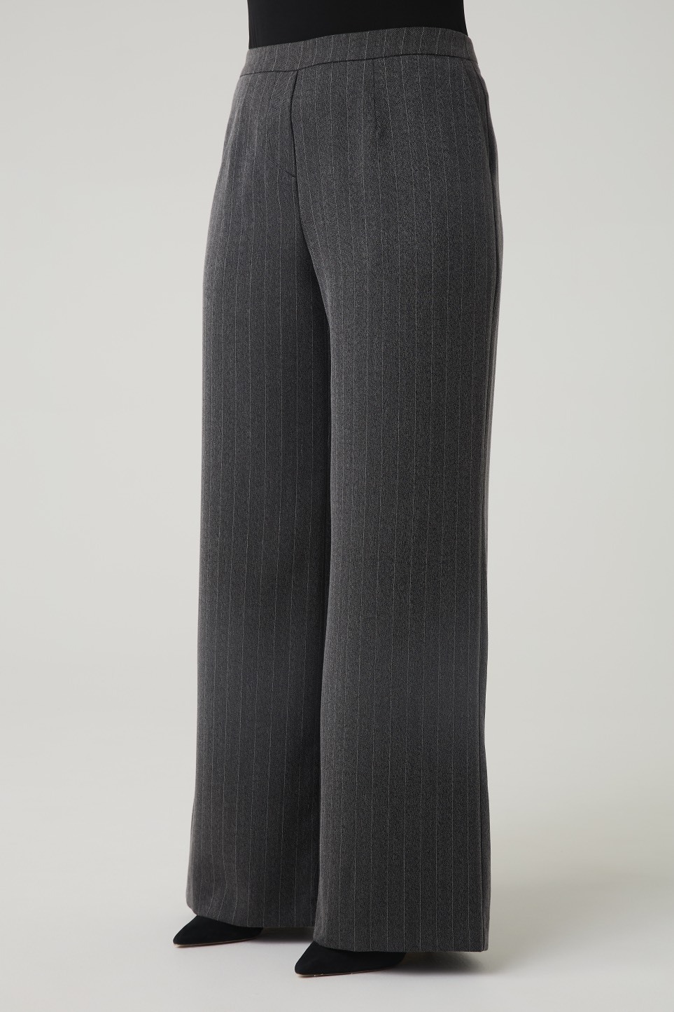 Женские брюки прямого кроя выполнены из плотной ткани серого цвета с тонкой белой полоской. Материал обладает хорошей плотностью и структурой, что позволяет сохранять форму изделия при носке.