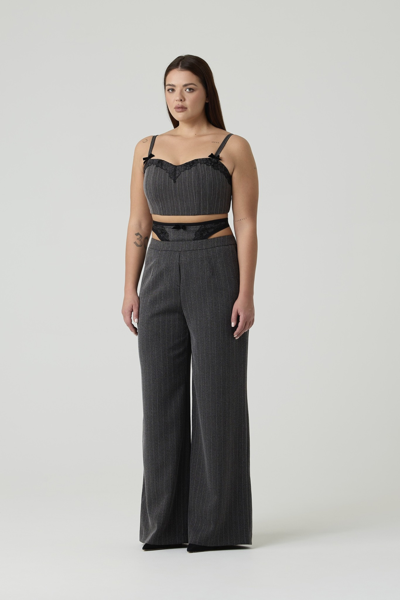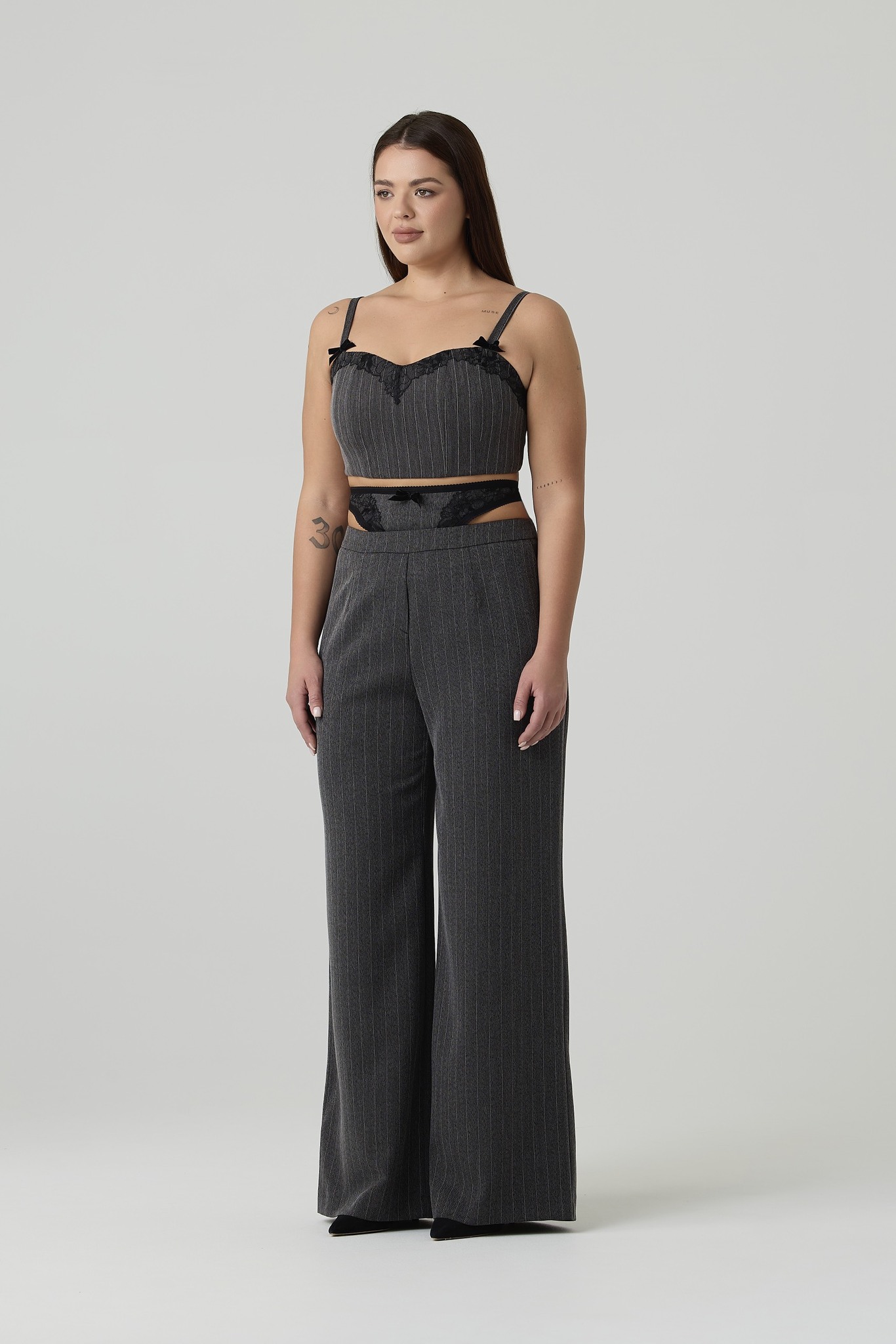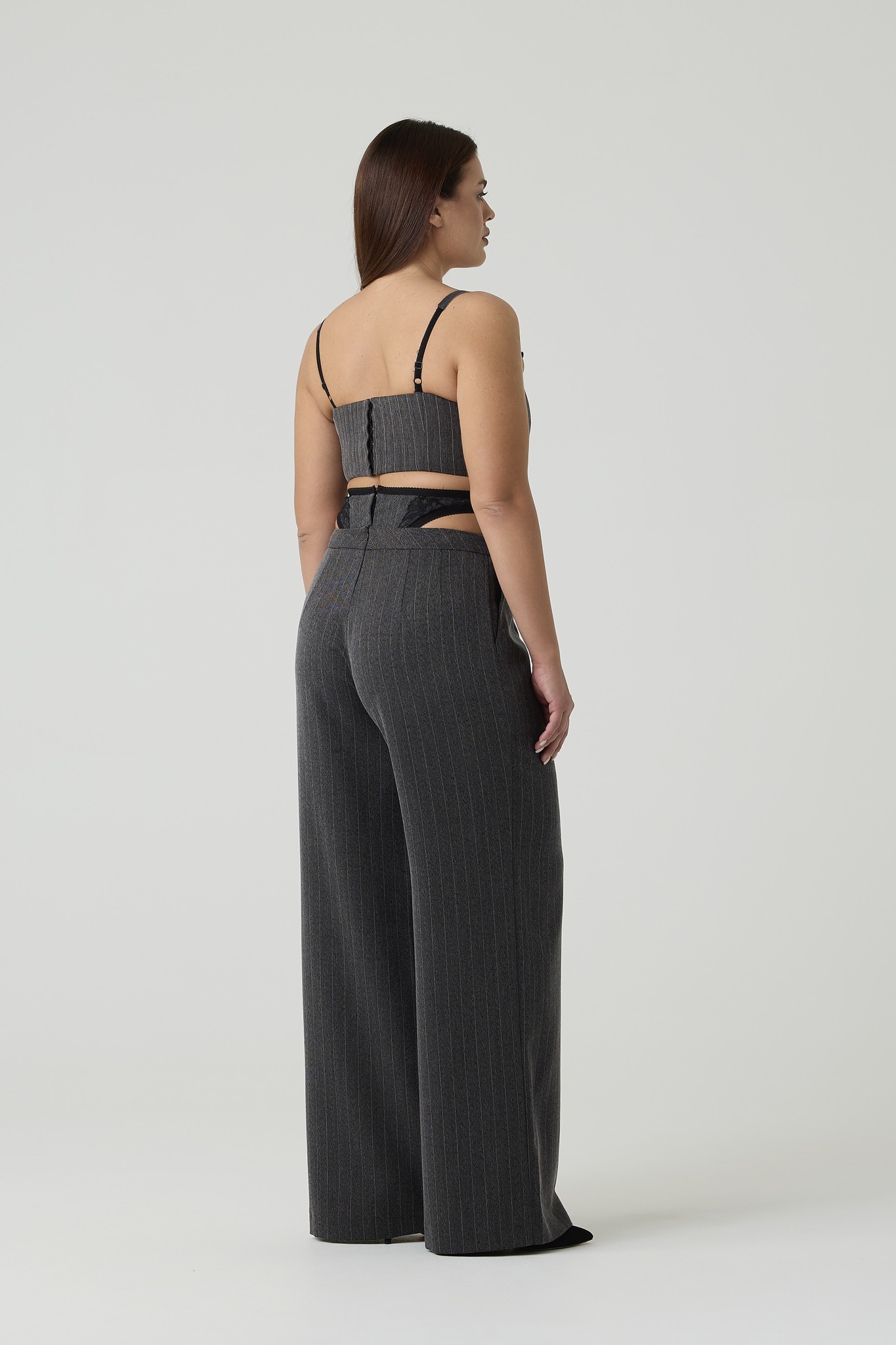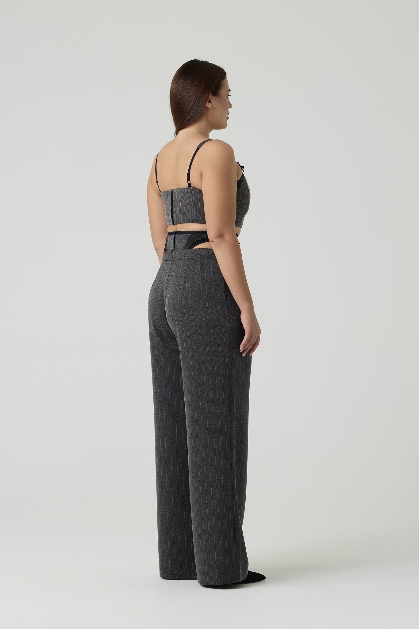Женские брюки прямого кроя выполнены из плотной ткани серого цвета с тонкой белой полоской. Материал обладает хорошей плотностью и структурой, что позволяет сохранять форму изделия при носке.