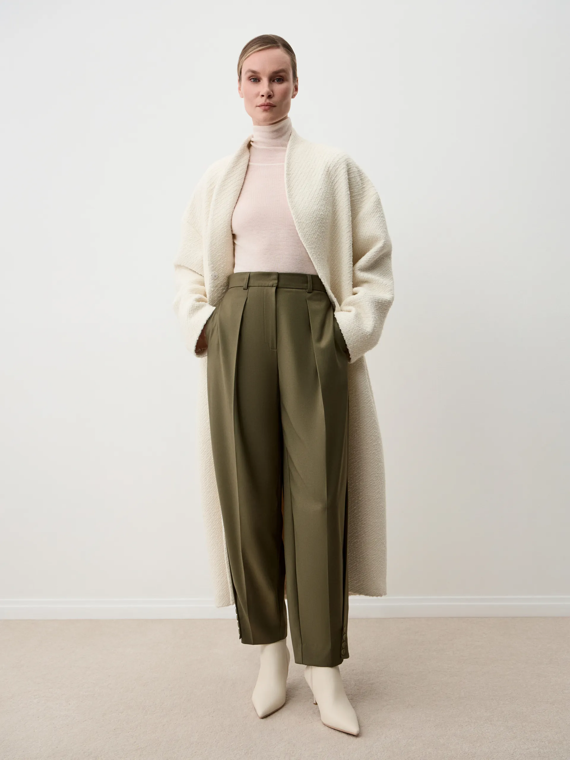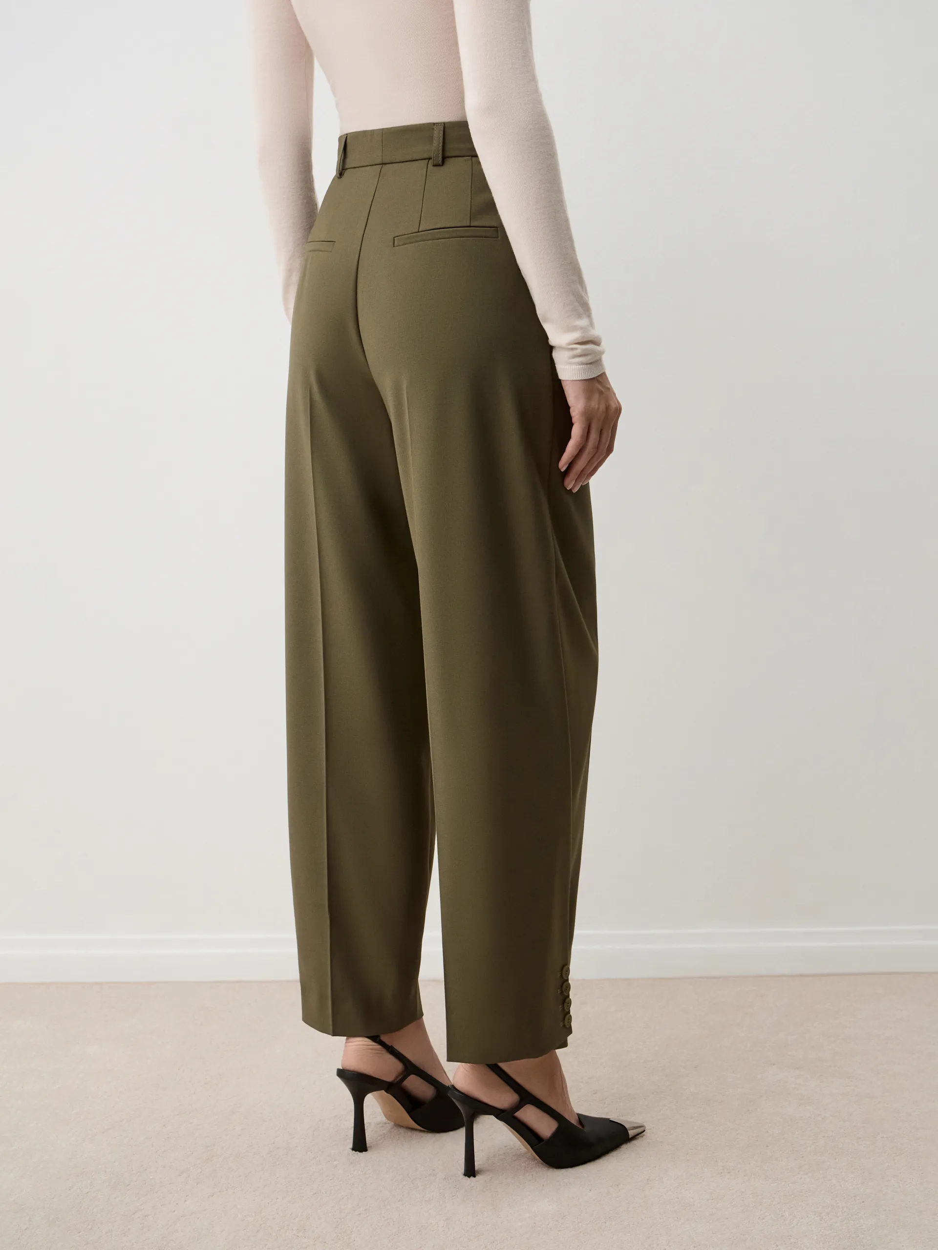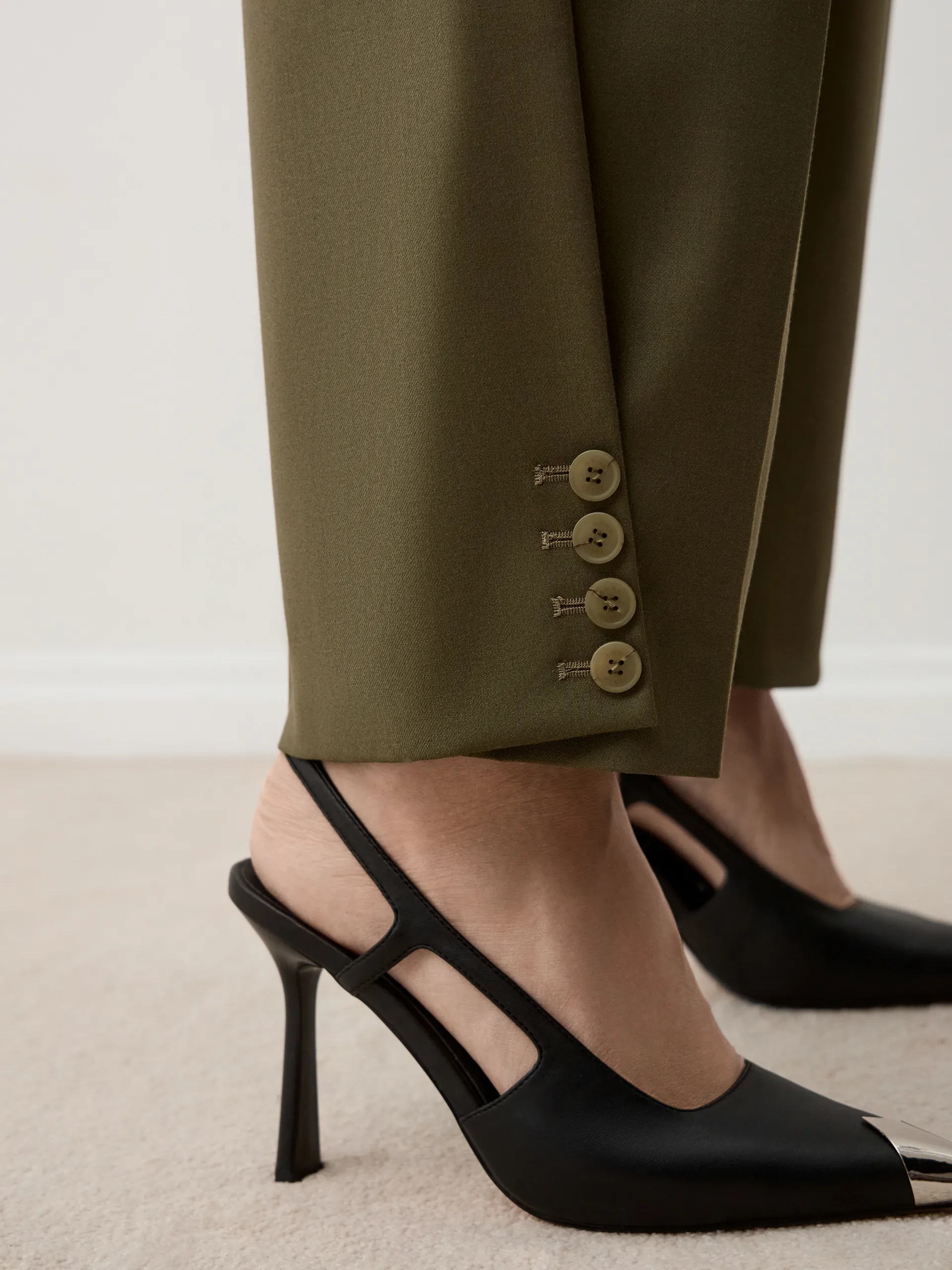 Брюки Moana. Брюки до щиколотки в оттенке хаки выполнены в модном О-силуэте, создающем лёгкость и современный акцент в образе. Высокая посадка подчёркивает талию и визуально удлиняет ноги. Внизу брючин — ряд пуговиц и акцентные складки, которые формируют струящиеся линии и добавляют элегантности. Универсальная модель легко вписывается в повседневные и формальные гардеробы. Рекомендуем носить с облегающими топами и блузами для контраста или сочетать с жакетом и кардиганом для более собранного образа. Обувь на каблуке подчеркнёт пропорции и сделает силуэт ещё более изящным.