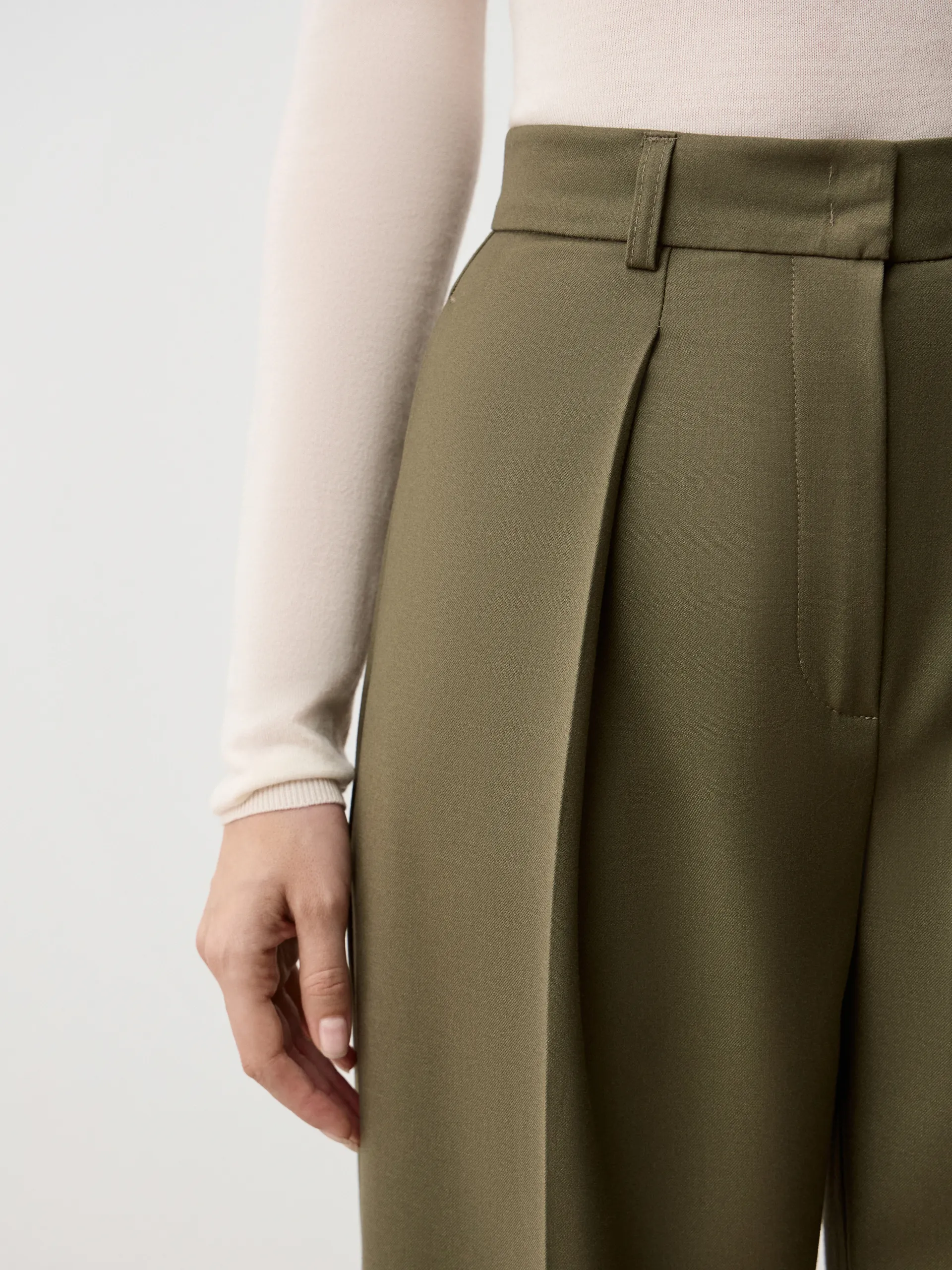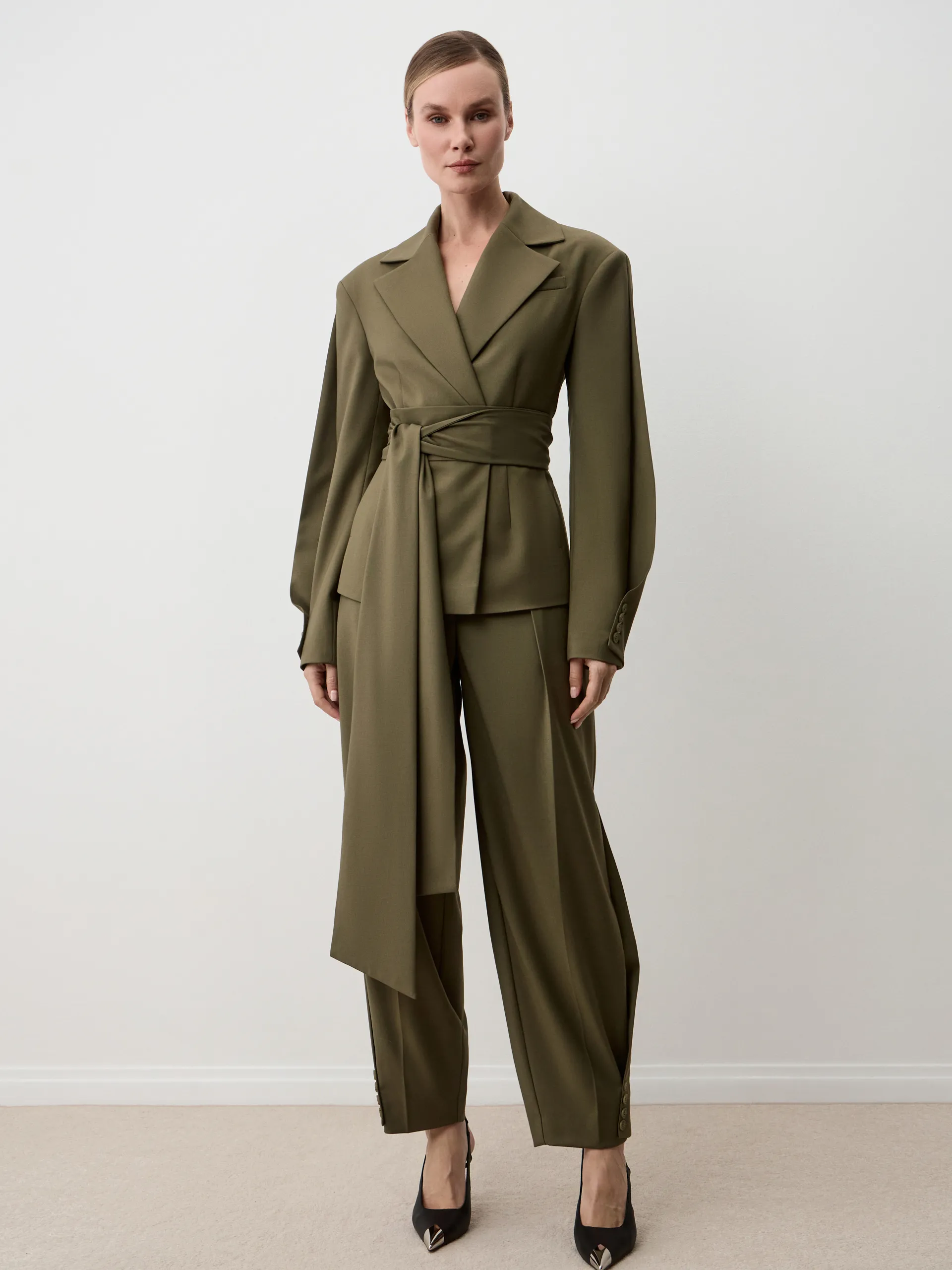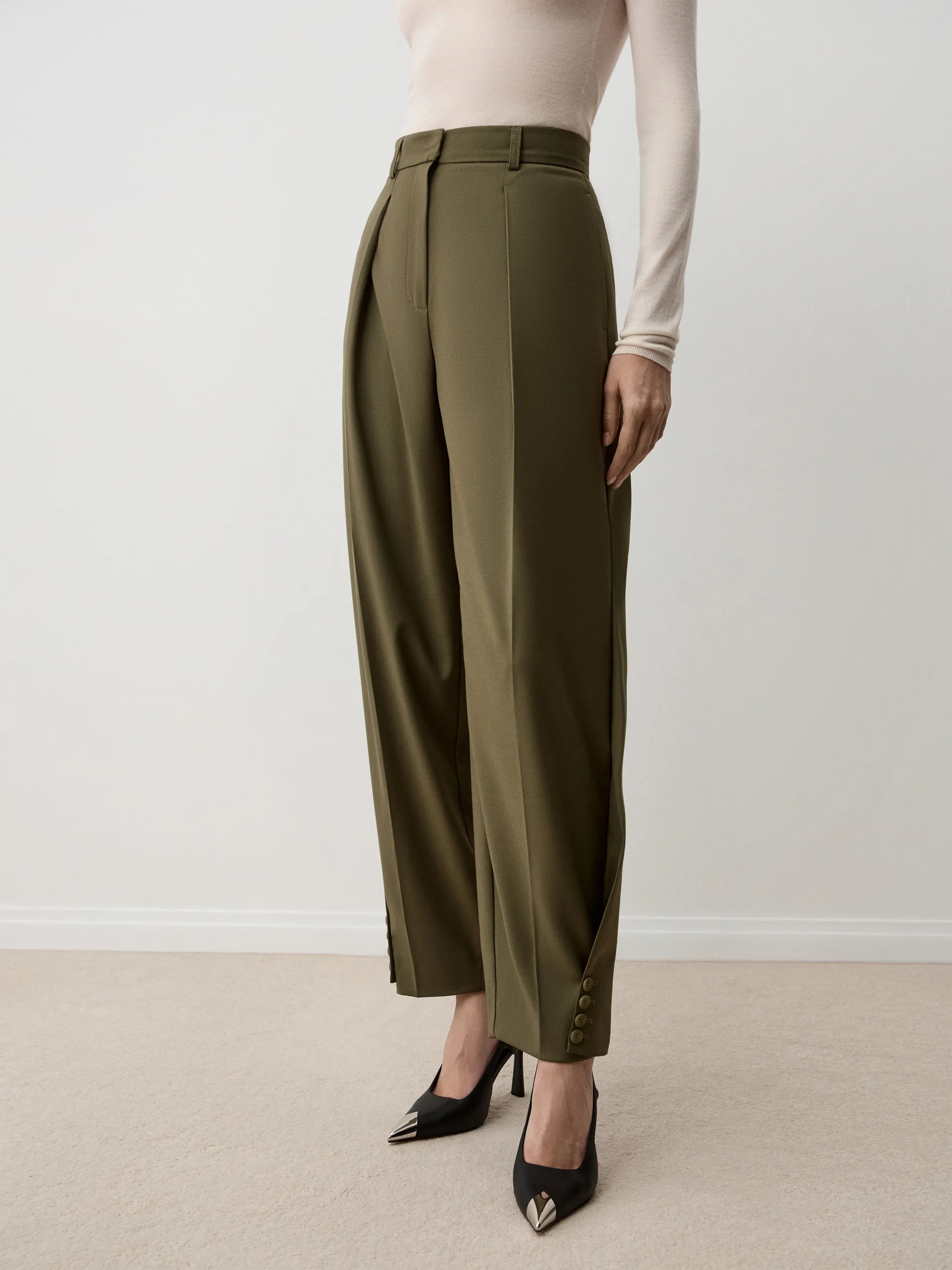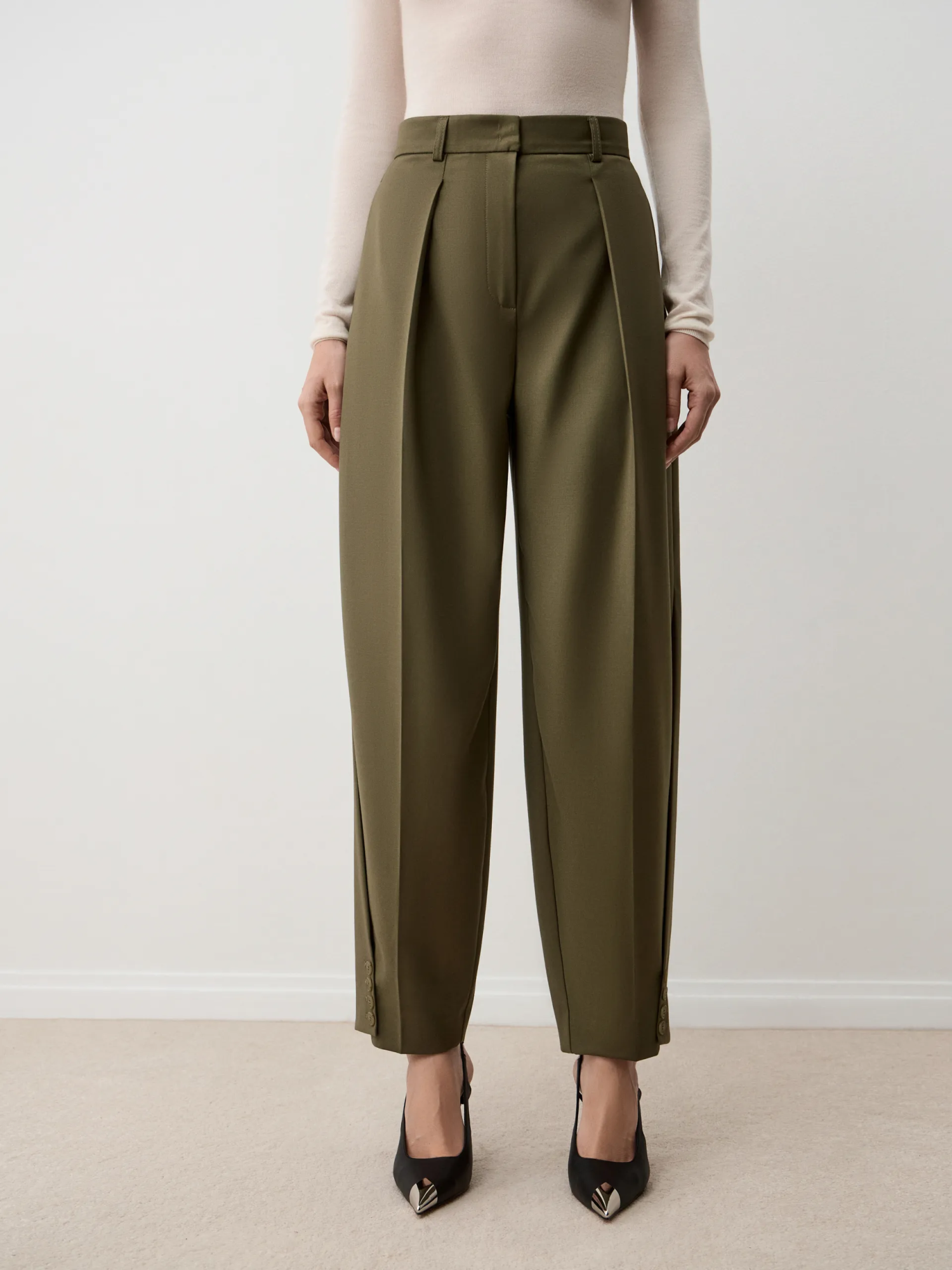 Брюки Moana. Брюки до щиколотки в оттенке хаки выполнены в модном О-силуэте, создающем лёгкость и современный акцент в образе. Высокая посадка подчёркивает талию и визуально удлиняет ноги. Внизу брючин — ряд пуговиц и акцентные складки, которые формируют струящиеся линии и добавляют элегантности. Универсальная модель легко вписывается в повседневные и формальные гардеробы. Рекомендуем носить с облегающими топами и блузами для контраста или сочетать с жакетом и кардиганом для более собранного образа. Обувь на каблуке подчеркнёт пропорции и сделает силуэт ещё более изящным.
