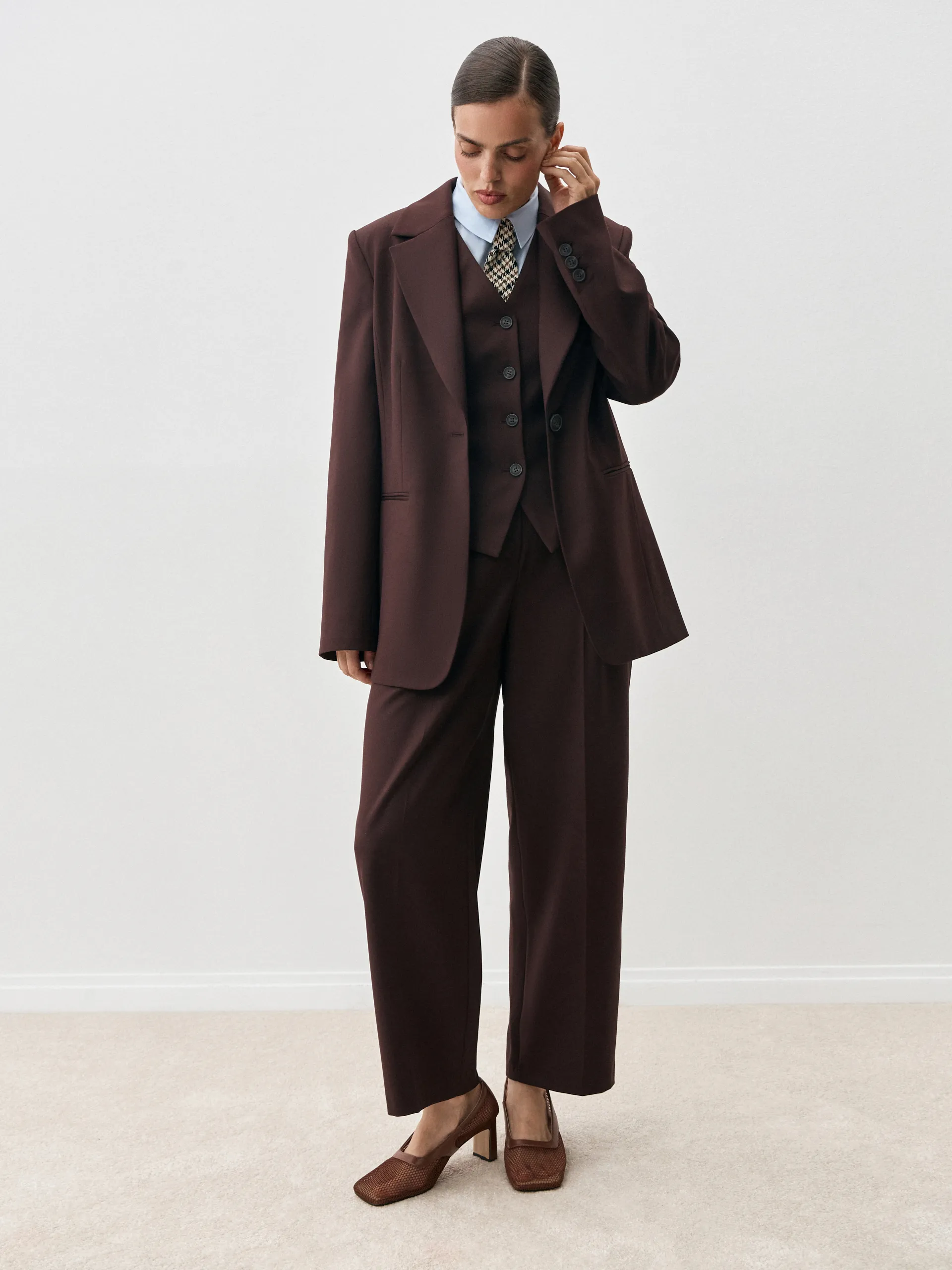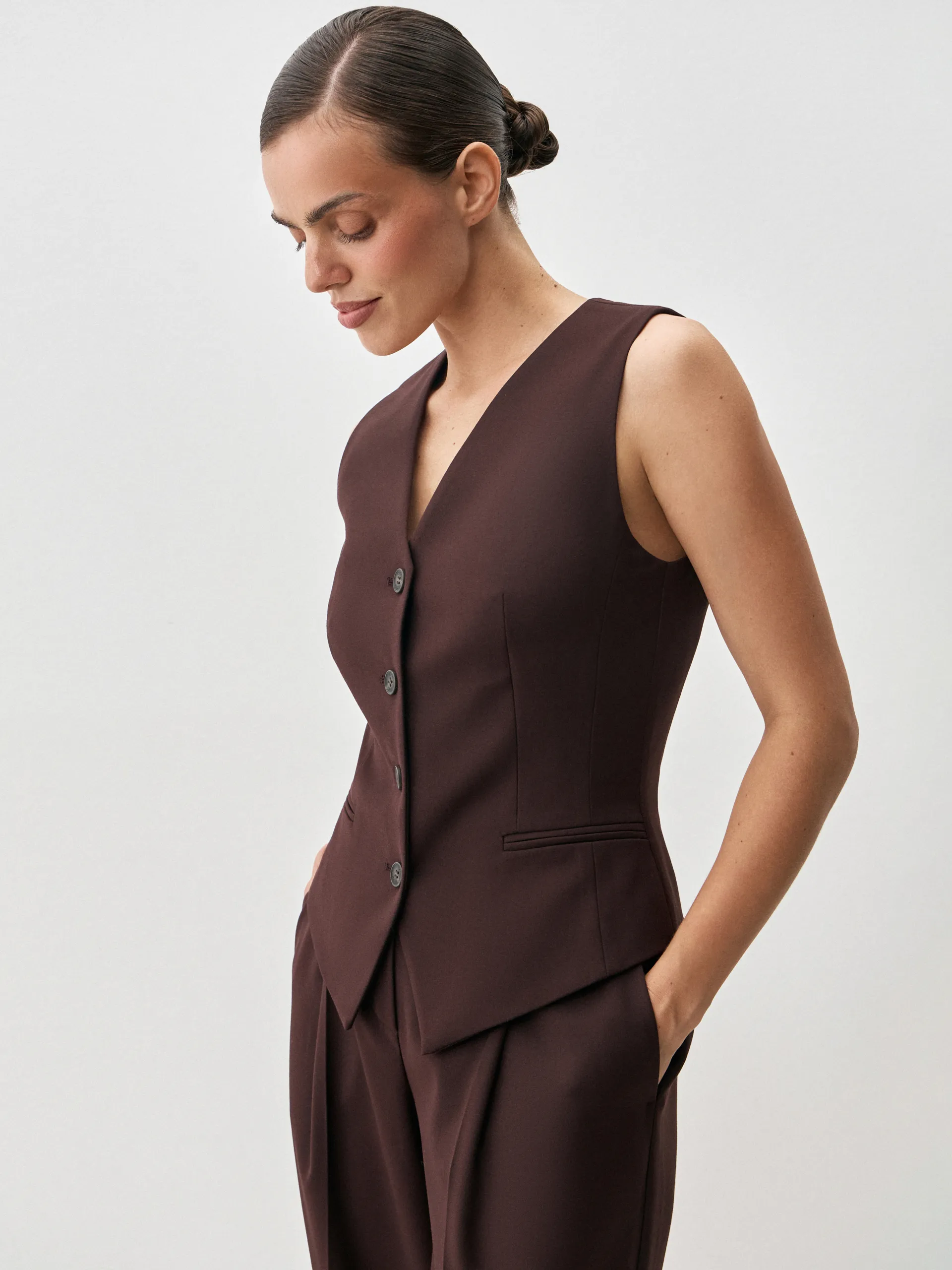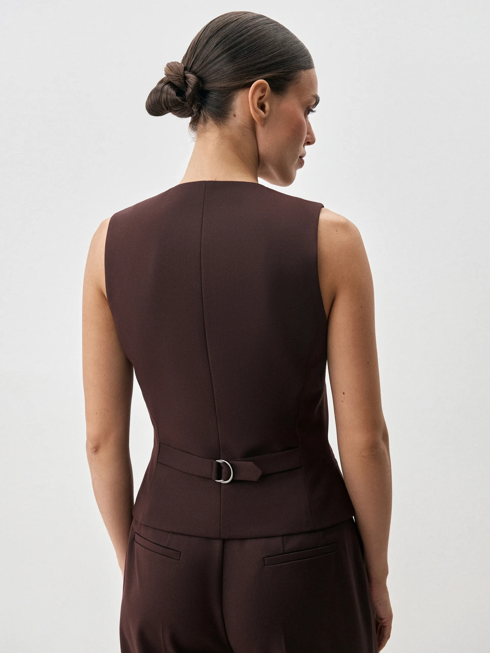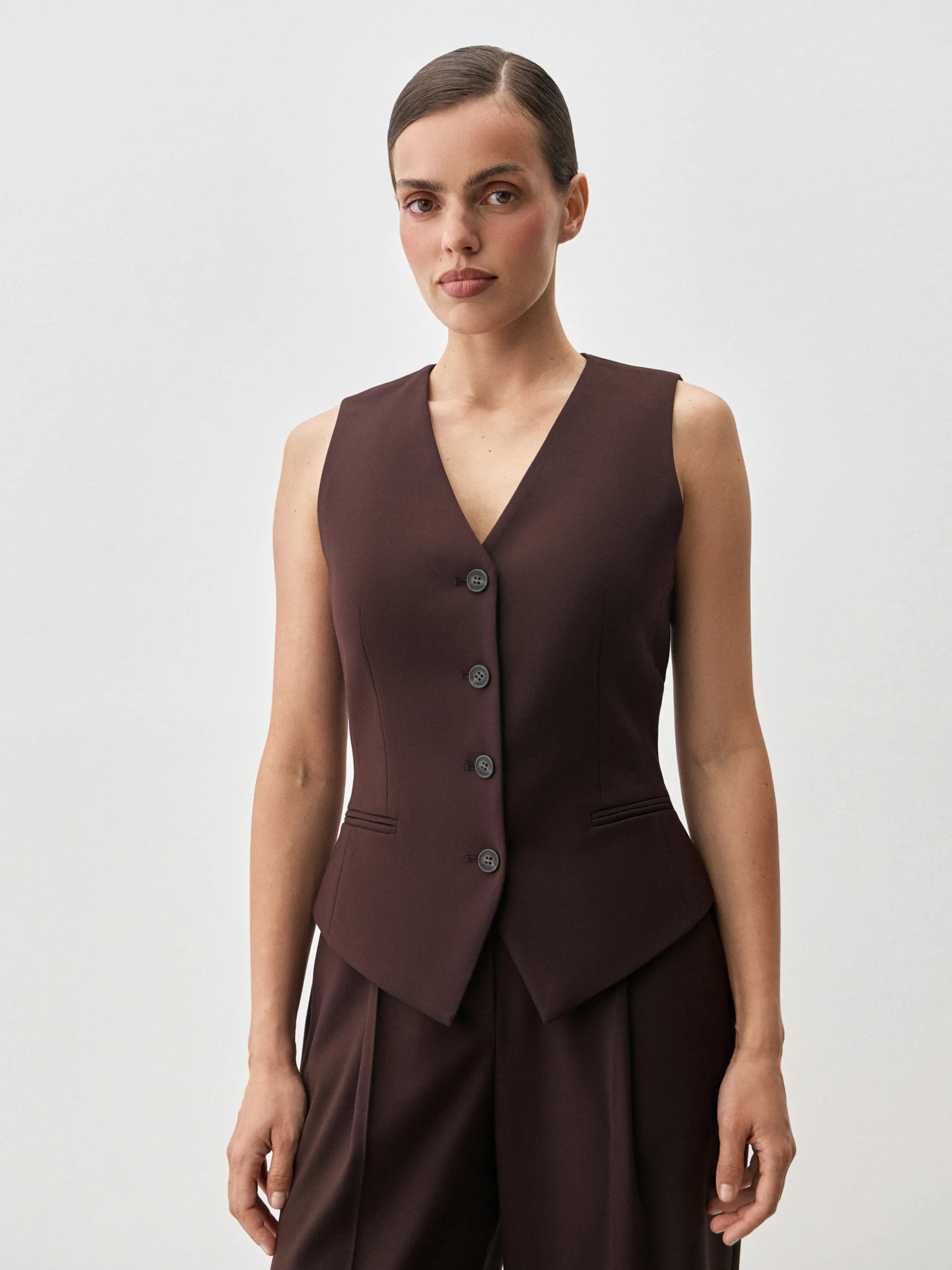 Жилет Lana из костюмной ткани - стильная модель для офиса и повседневной жизни. Модель приталенного силуэта отлично садится по фигуре благодаря выверенным линиям и современному дизайну. Плотная ткань хорошо держит форму. Спинка жилета декорирована тонким ремешком. Стилизуйте образ строгой блузкой для делового аутфита, добавьте брюки Hardi и элегантные лодочки. А для неформального образа подберите oversize футболку, кожаные штаны и грубые ботинки.Жилет можно носить, как самостоятельную часть образа - без нижнего слоя.