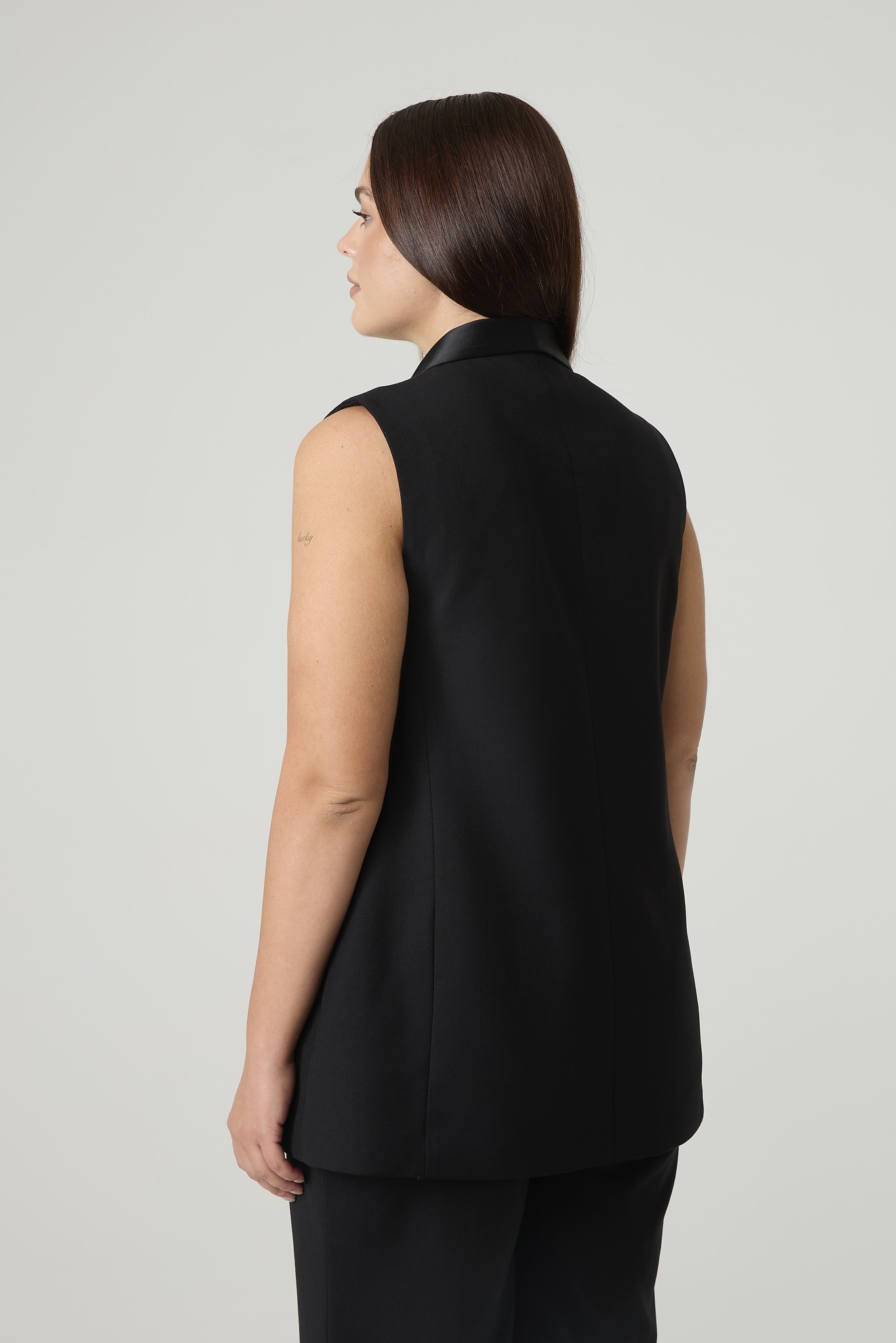 Женский жилет выполнен из плотной ткани с легким матовым блеском.