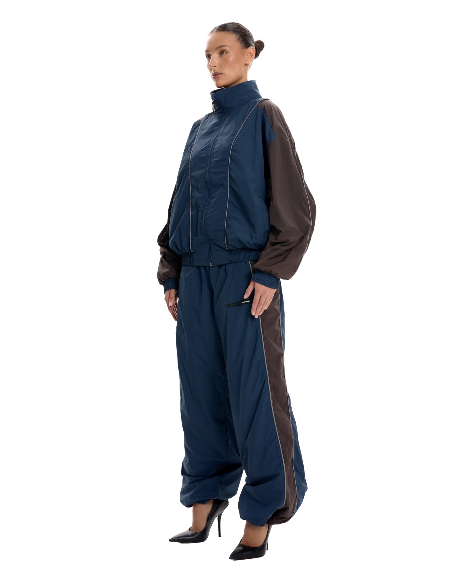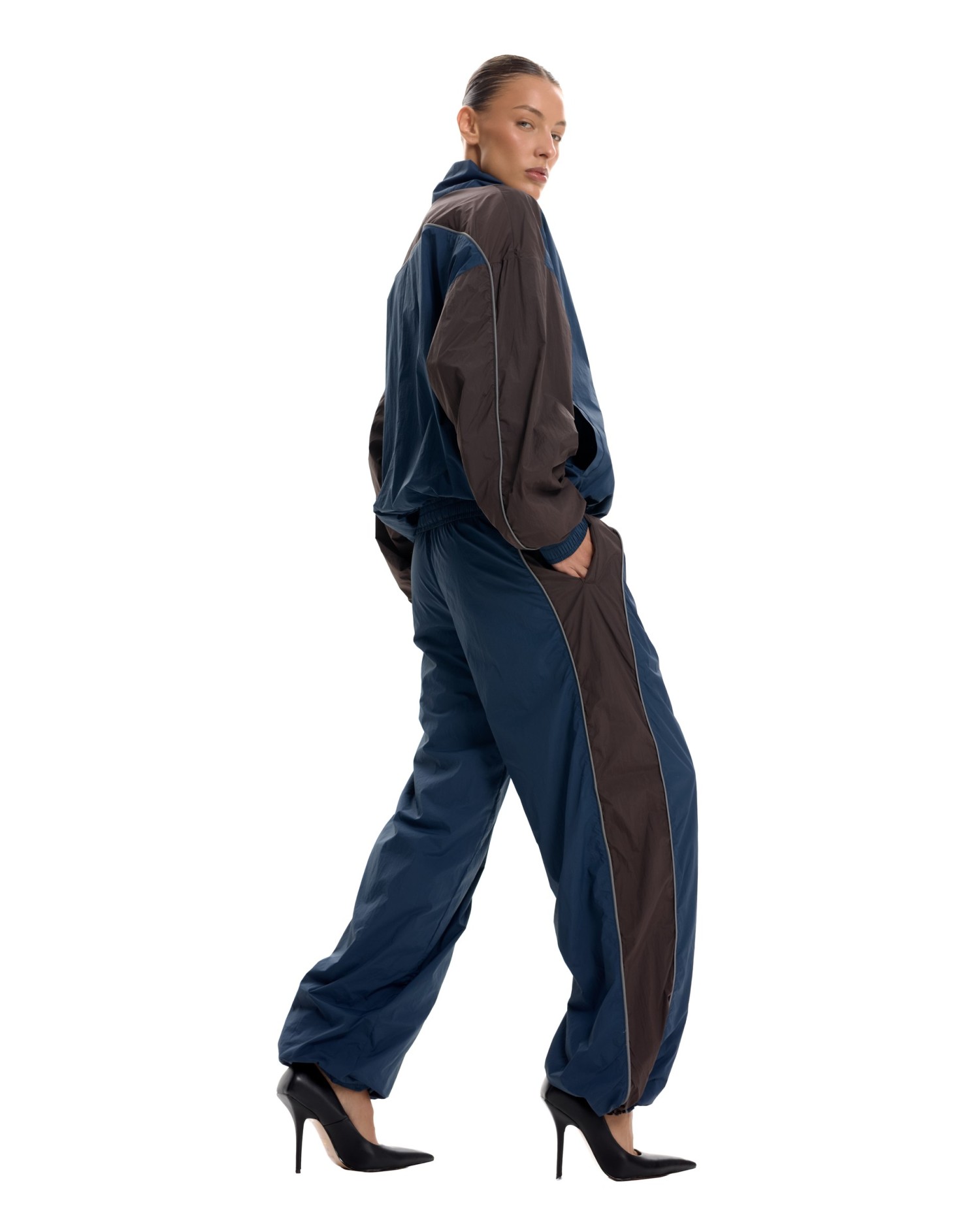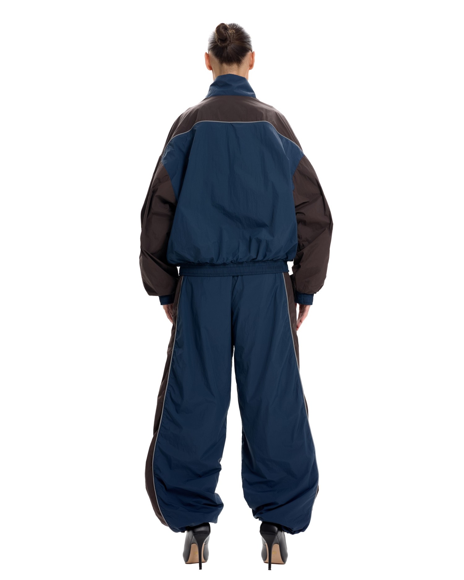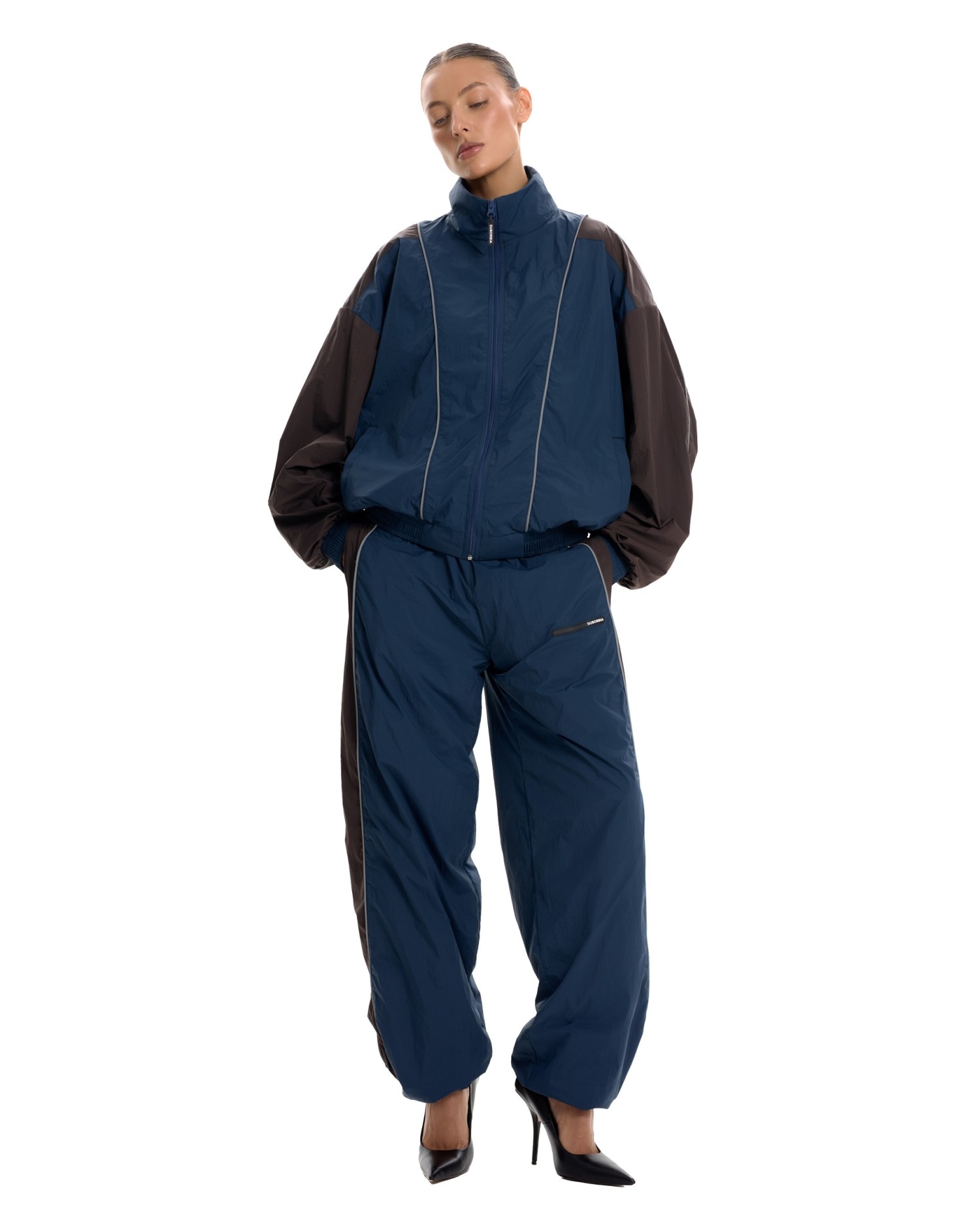 Костюм с мастеркой и брюками свободного кроя из облегченной ткани.
