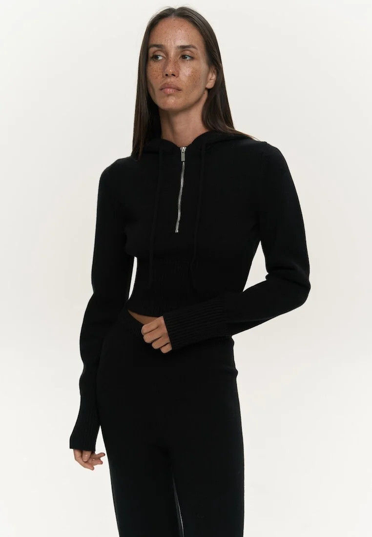 Костюм из брюки и укороченного худи с молнией и капюшоном.