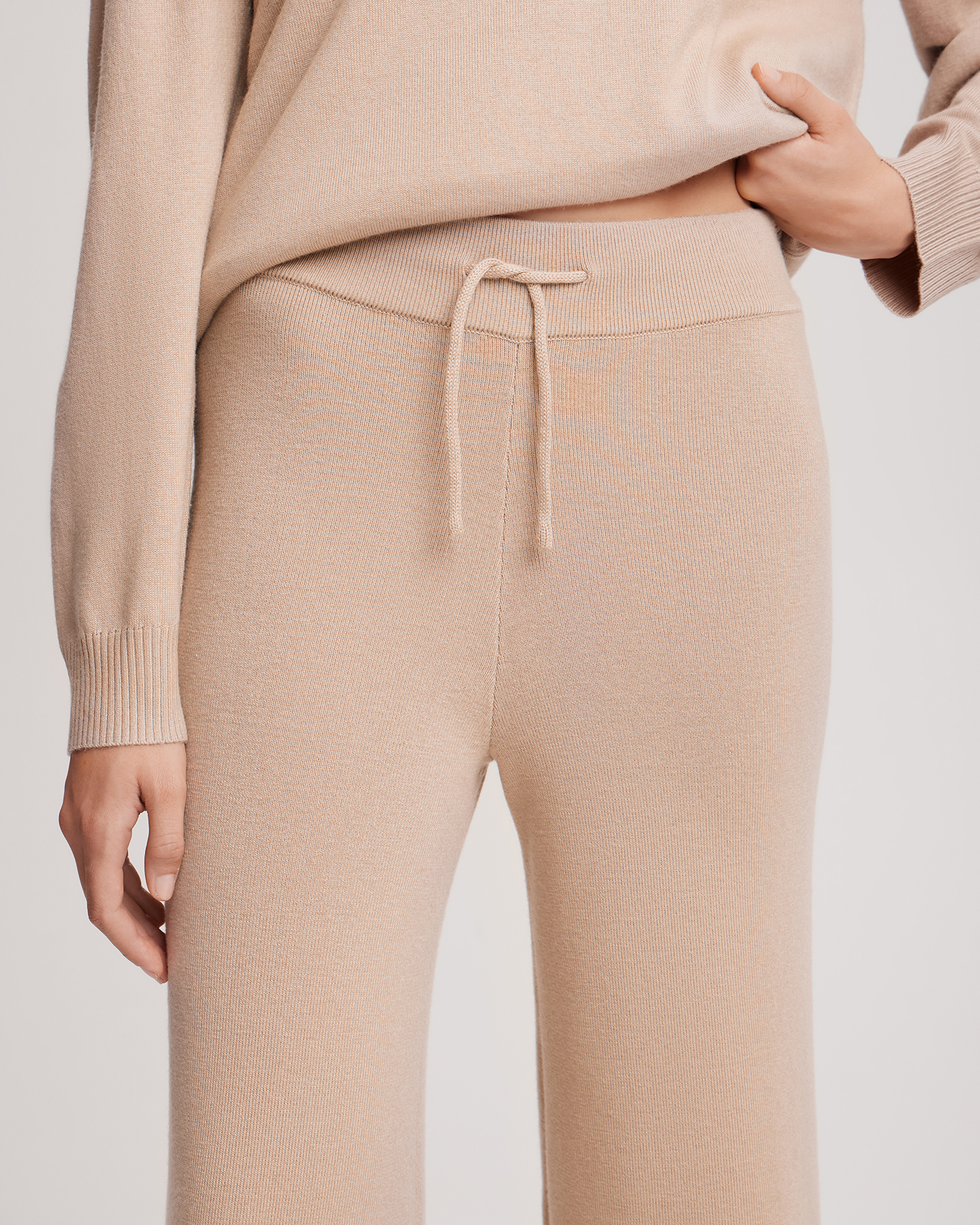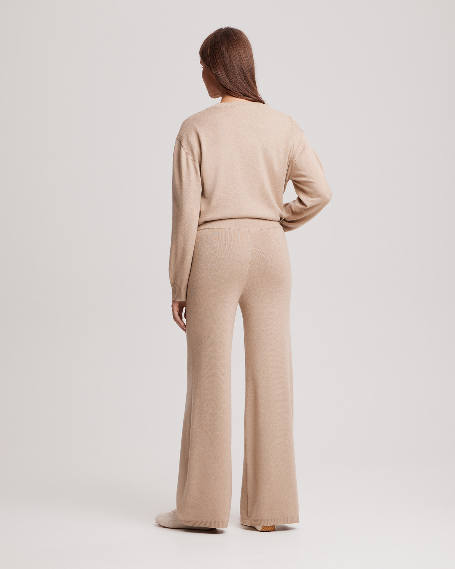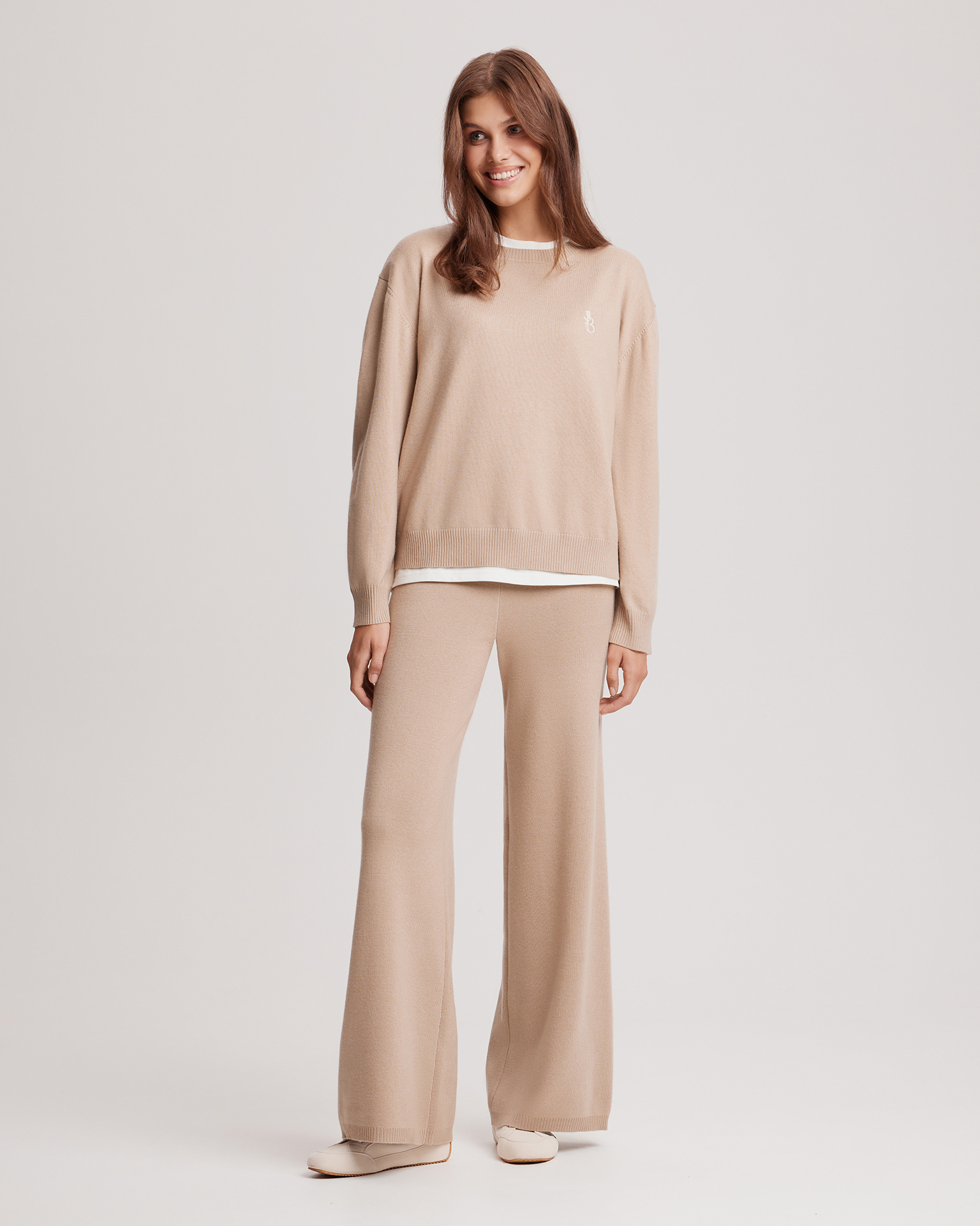 Вязаный костюм из джемпера и свободных брюк идеально подходит для прогулок. Брюки с регулируемой резинкой на талии обеспечивают удобную посадку. oversize джемпер дополнен лого бренда, который разработан и нарисован вручную нашим дизайнером. Комплект выполнен из мягкой пряжи и делает эти вещи особенно приятными на ощупь.