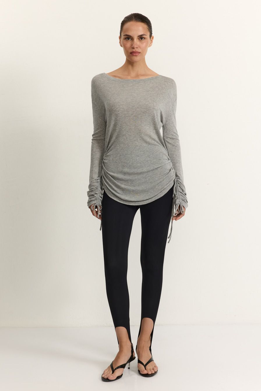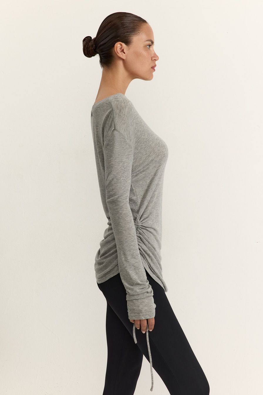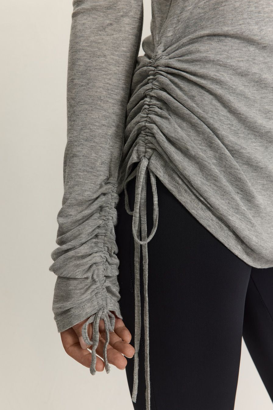 Серый лонгслив приталенного кроя выполнен из смесового тенселя с добавлением шерсти. Тенсель – материал натурального происхождения из древесины австралийского эвкалипта, который подвергается нанообработке. Лонгслив декорирован кулисками на рукавах и по бокам.