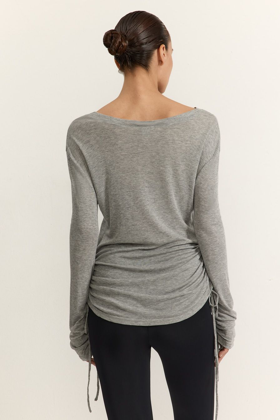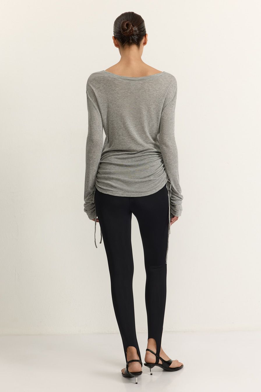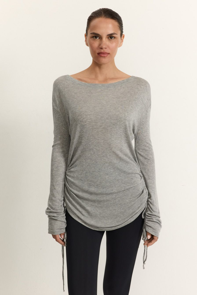 Серый лонгслив приталенного кроя выполнен из смесового тенселя с добавлением шерсти. Тенсель – материал натурального происхождения из древесины австралийского эвкалипта, который подвергается нанообработке. Лонгслив декорирован кулисками на рукавах и по бокам.