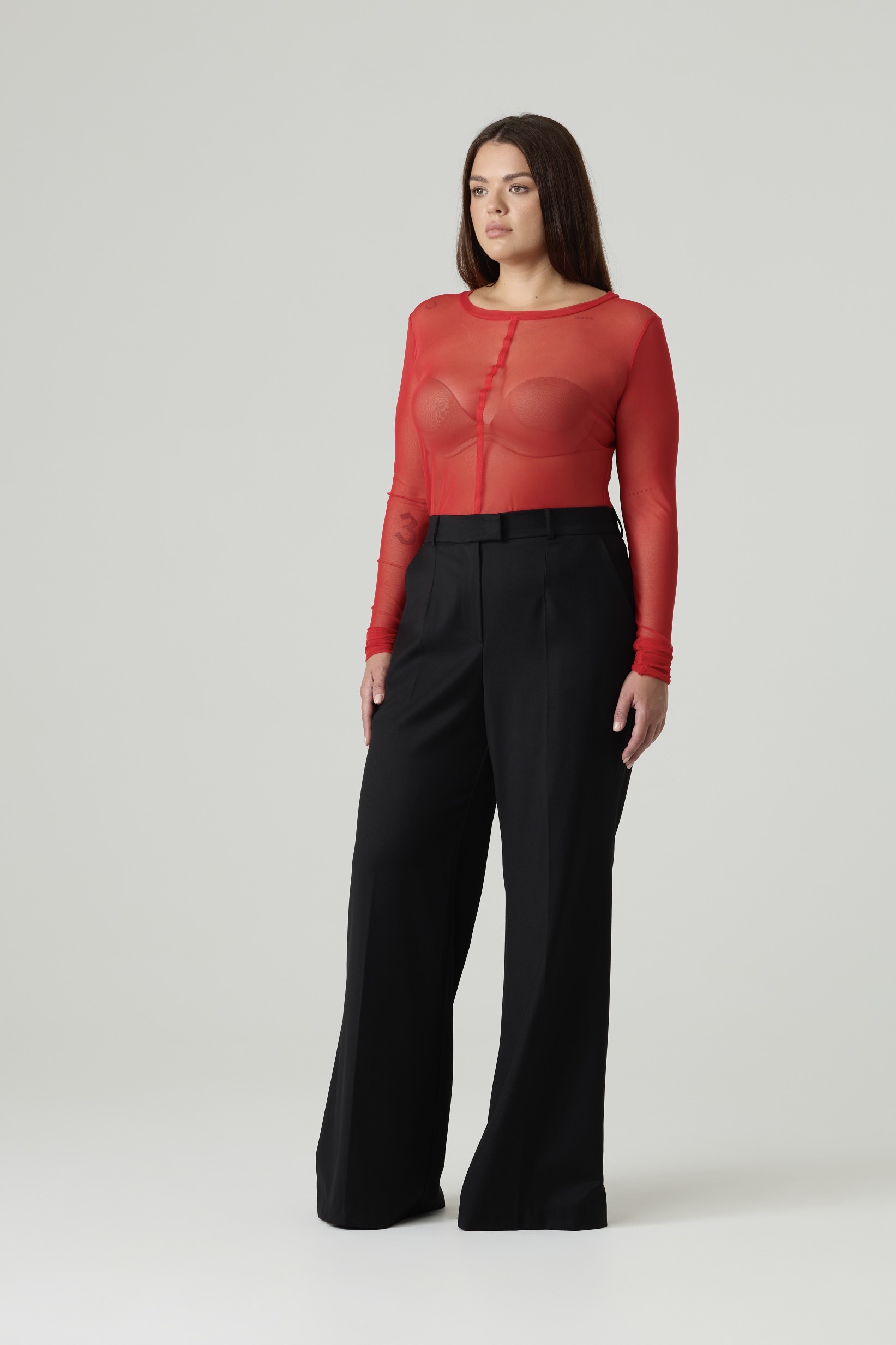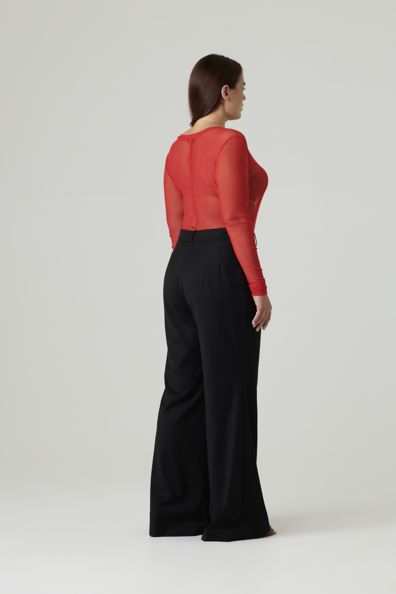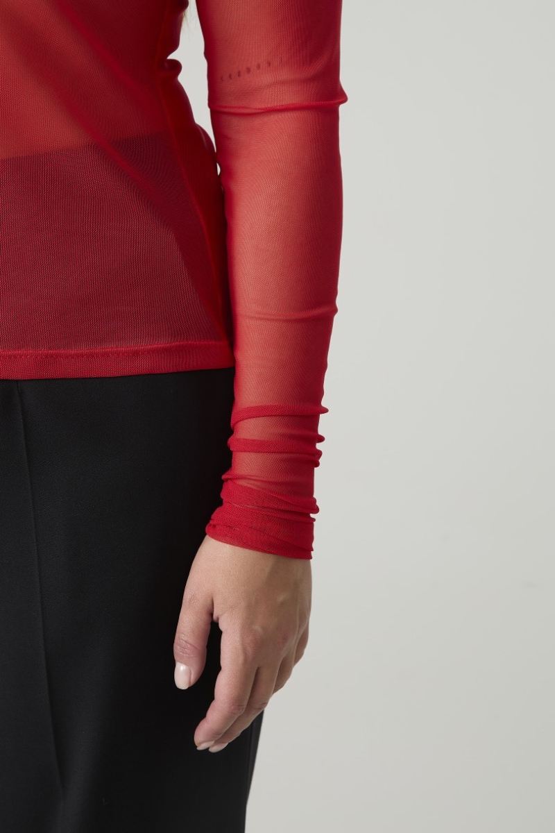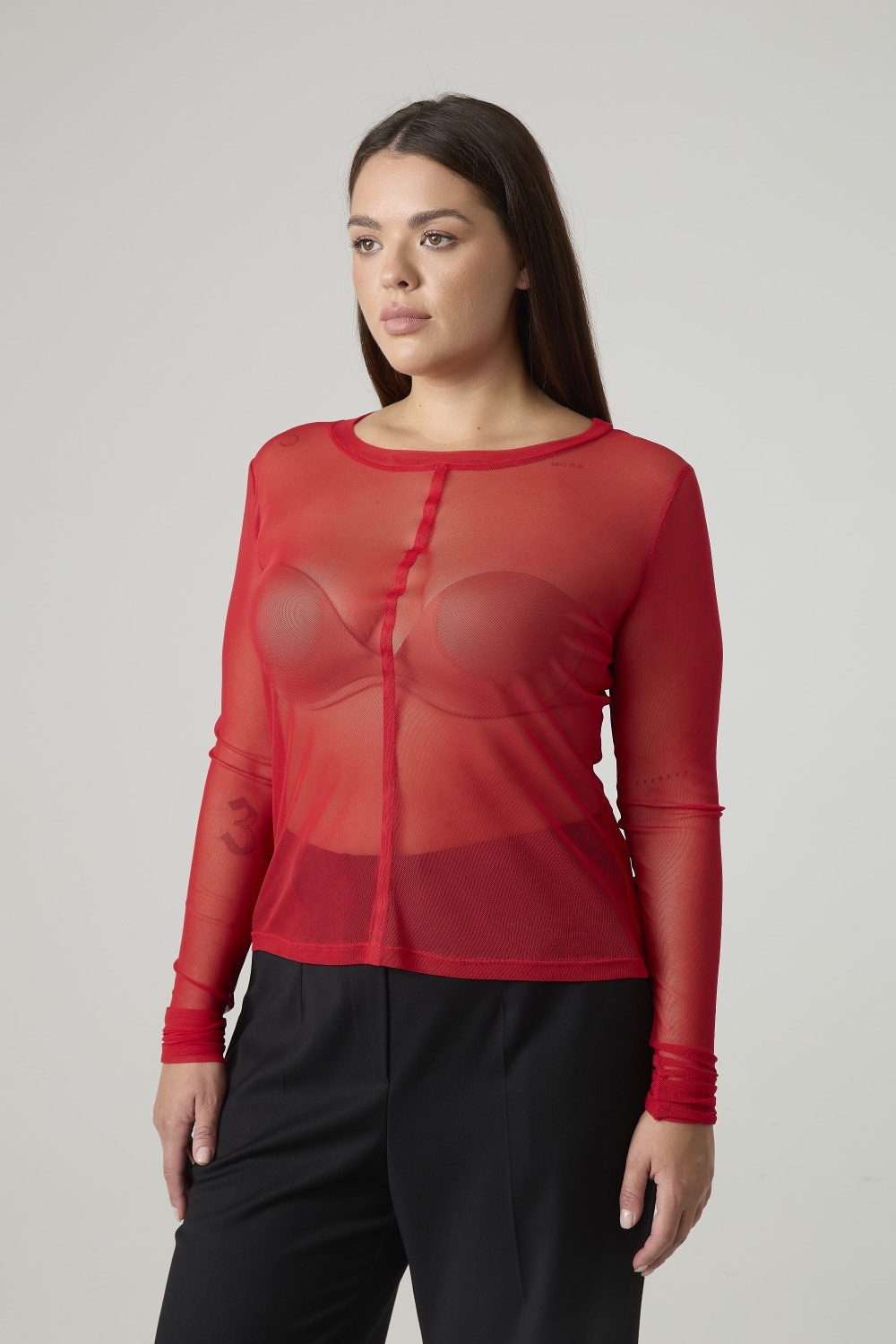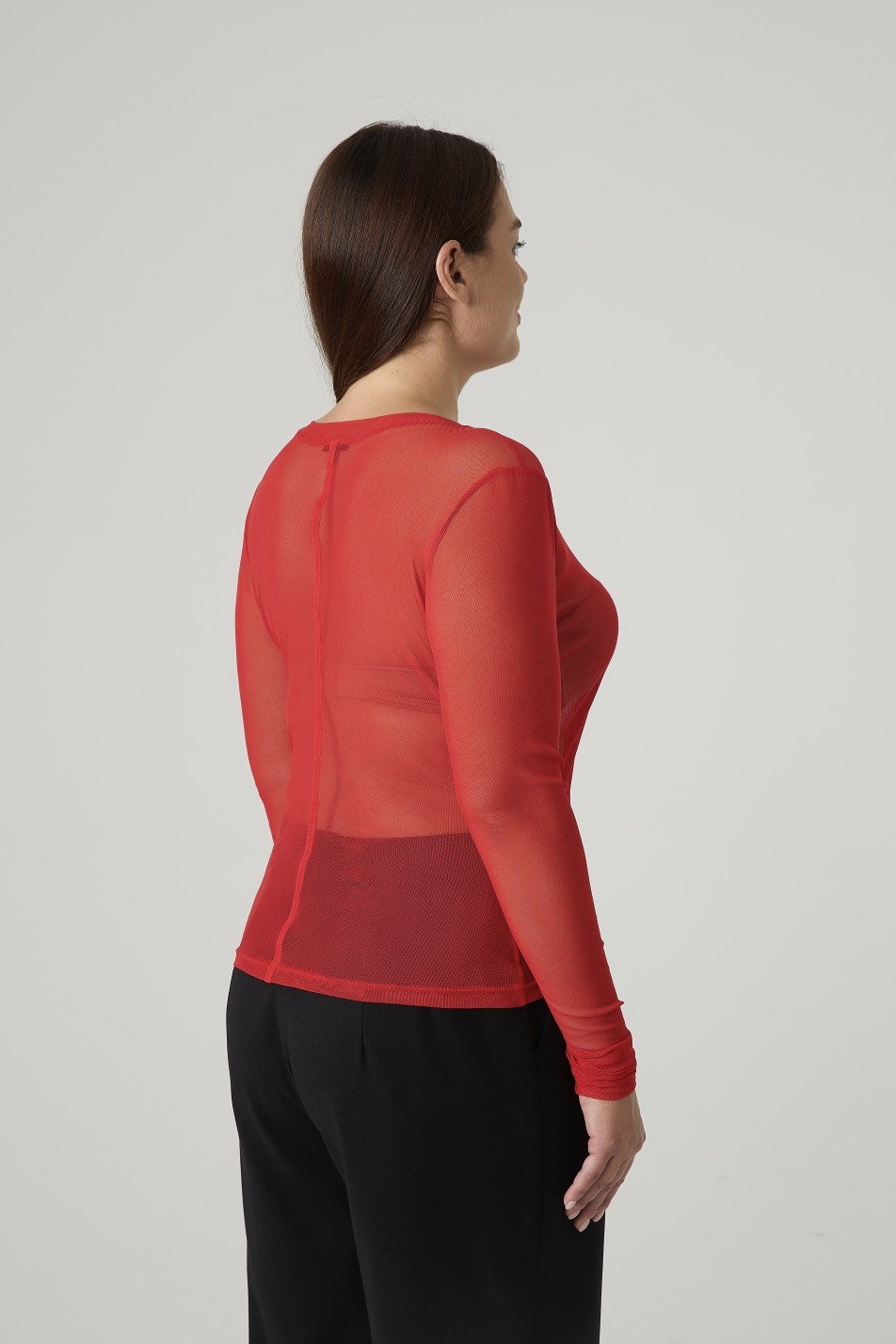Женский лонгслив выполнен из тонкой эластичной сетчатой ткани, обеспечивающей легкость и воздушность, создавая эффектную прозрачность. Модель прилегающего силуэта, без застежек, с длинными рукавами и круглым вырезом горловины. Центральный шов спереди и сзади добавляет конструкции выразительности и подчеркивает силуэт. Низ изделия прямой, длина стандартная, до линии бедер.
