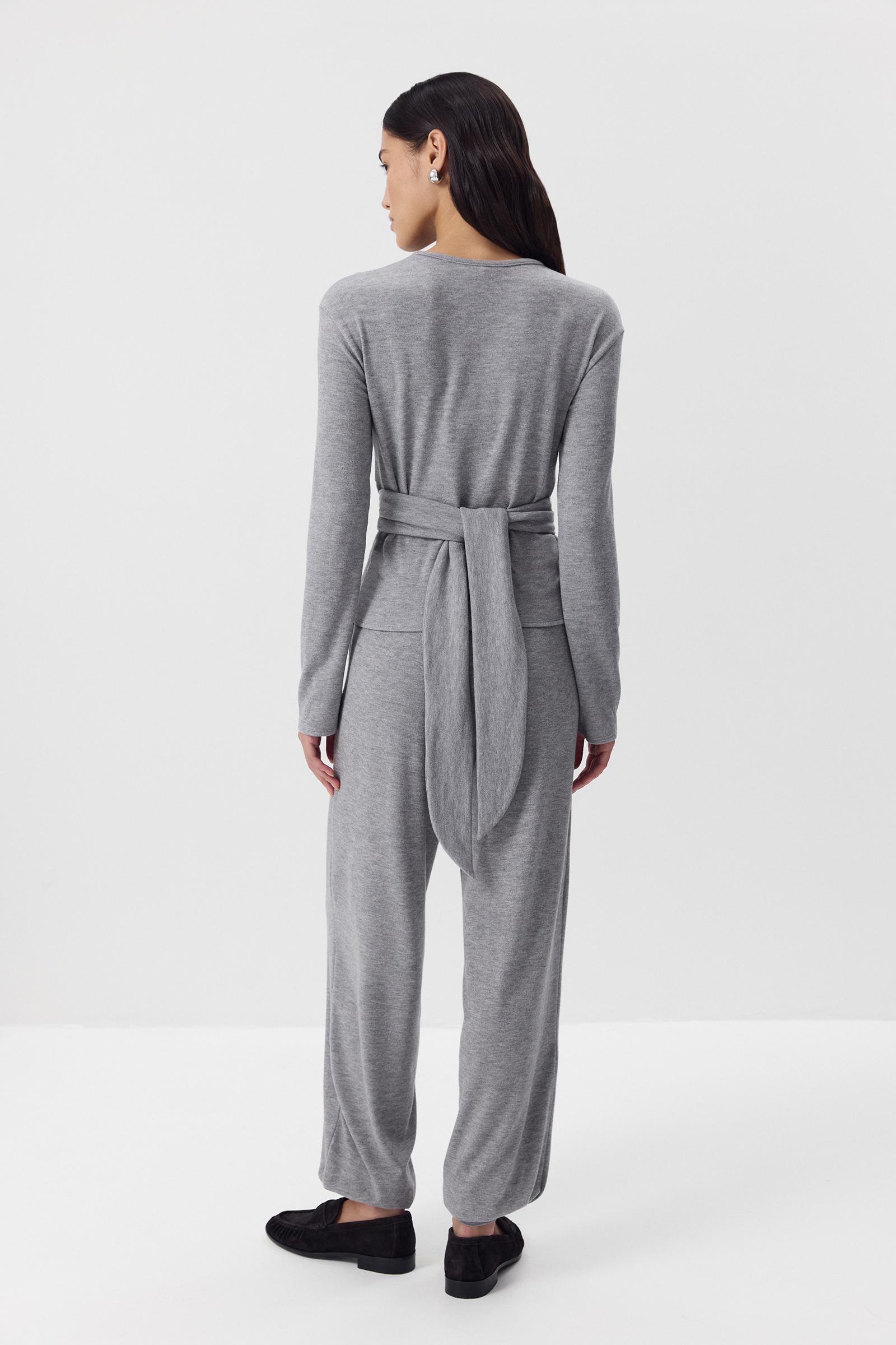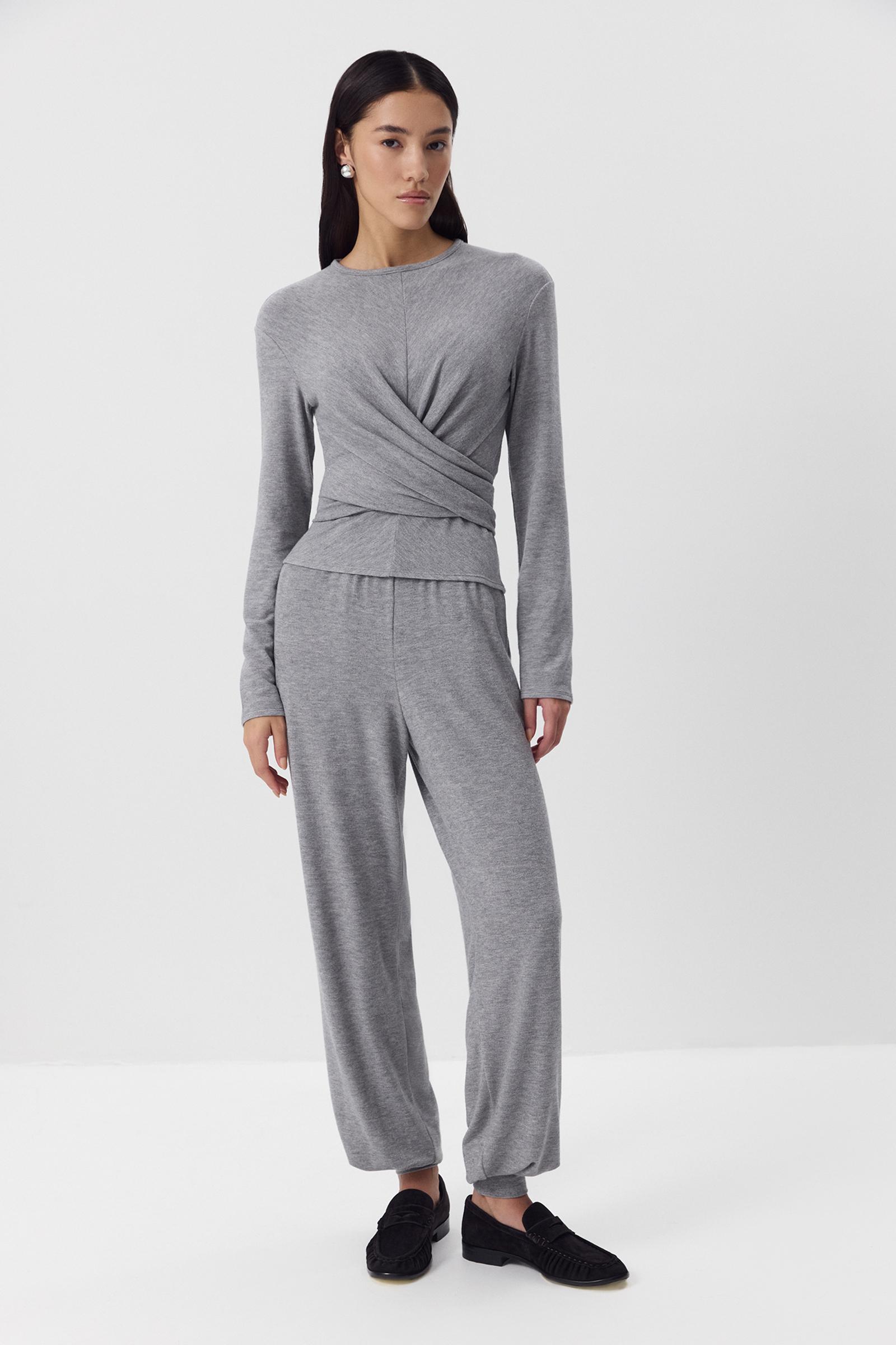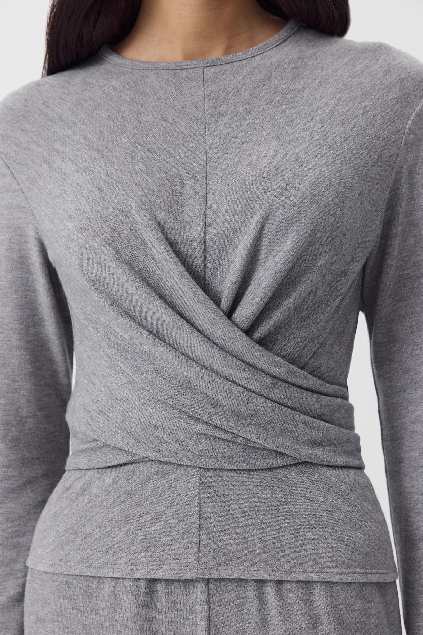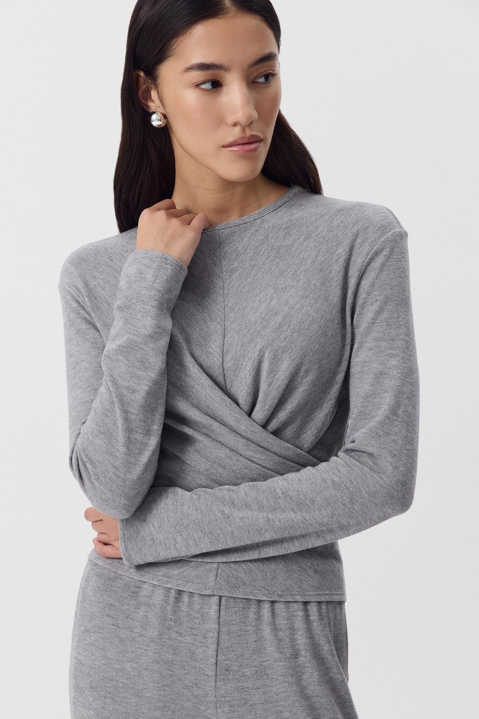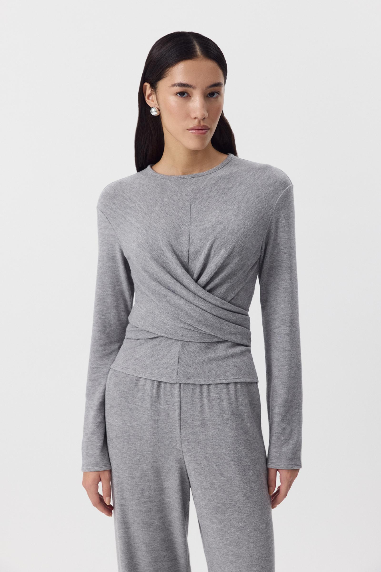 Лонгслив из мягкого свитерного трикотажа. Лонгслив с длинным рукавом и горловиной лодка. По линии талии пояс создающий приталенный силуэт и формирующий акцентную драпировку по переду драпировка, переходящая в удлиненный пояс с возможностью завязать спереди и сзади.