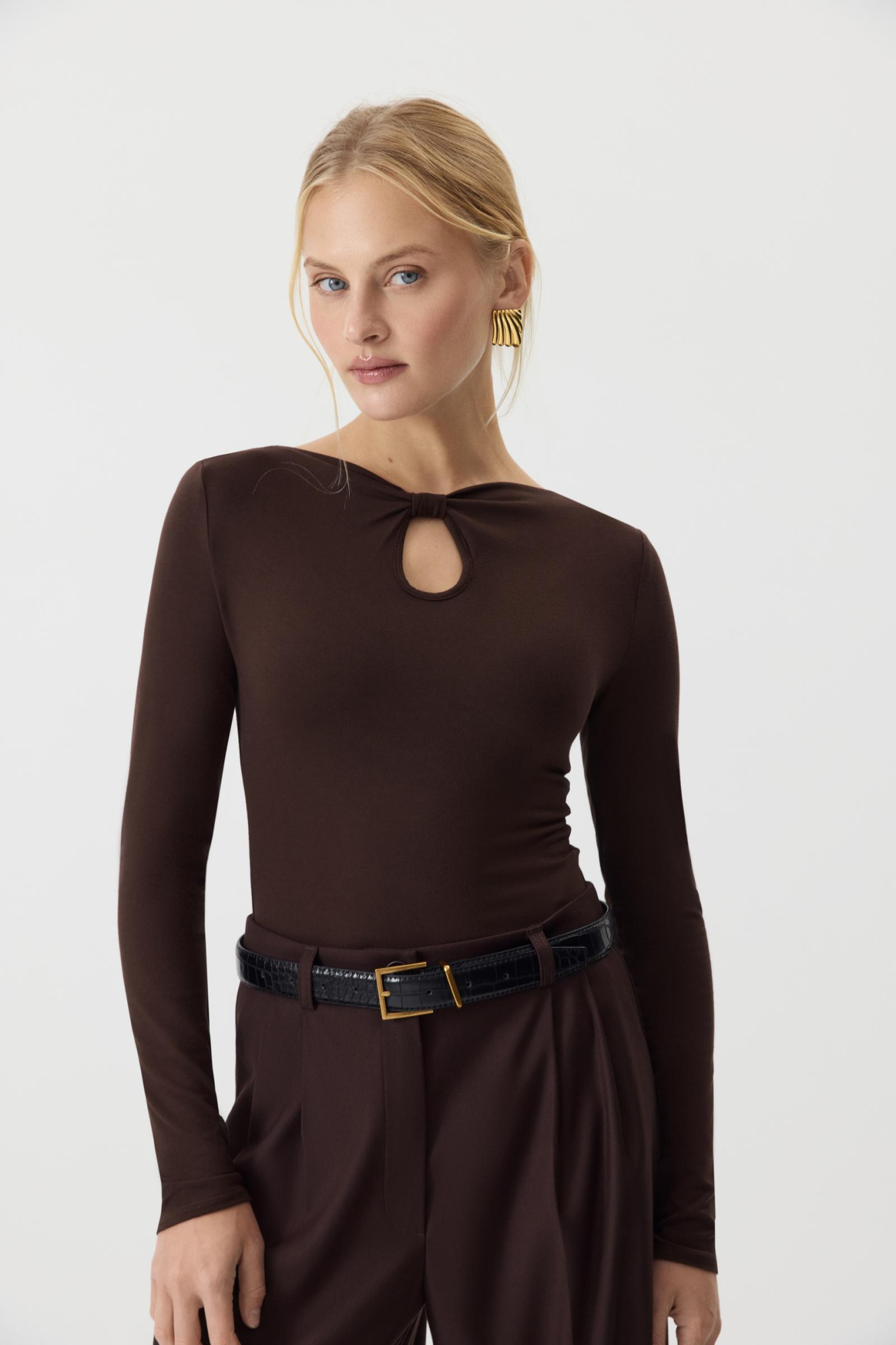 Выполненный из эластичной вискозы топ облегающего силуэта. Декоративным элементом является узел на горловине с вырезом капелькой. Изделие с длинным рукавом. Универсальная посадка позволяет собирать лаконичные образы.
