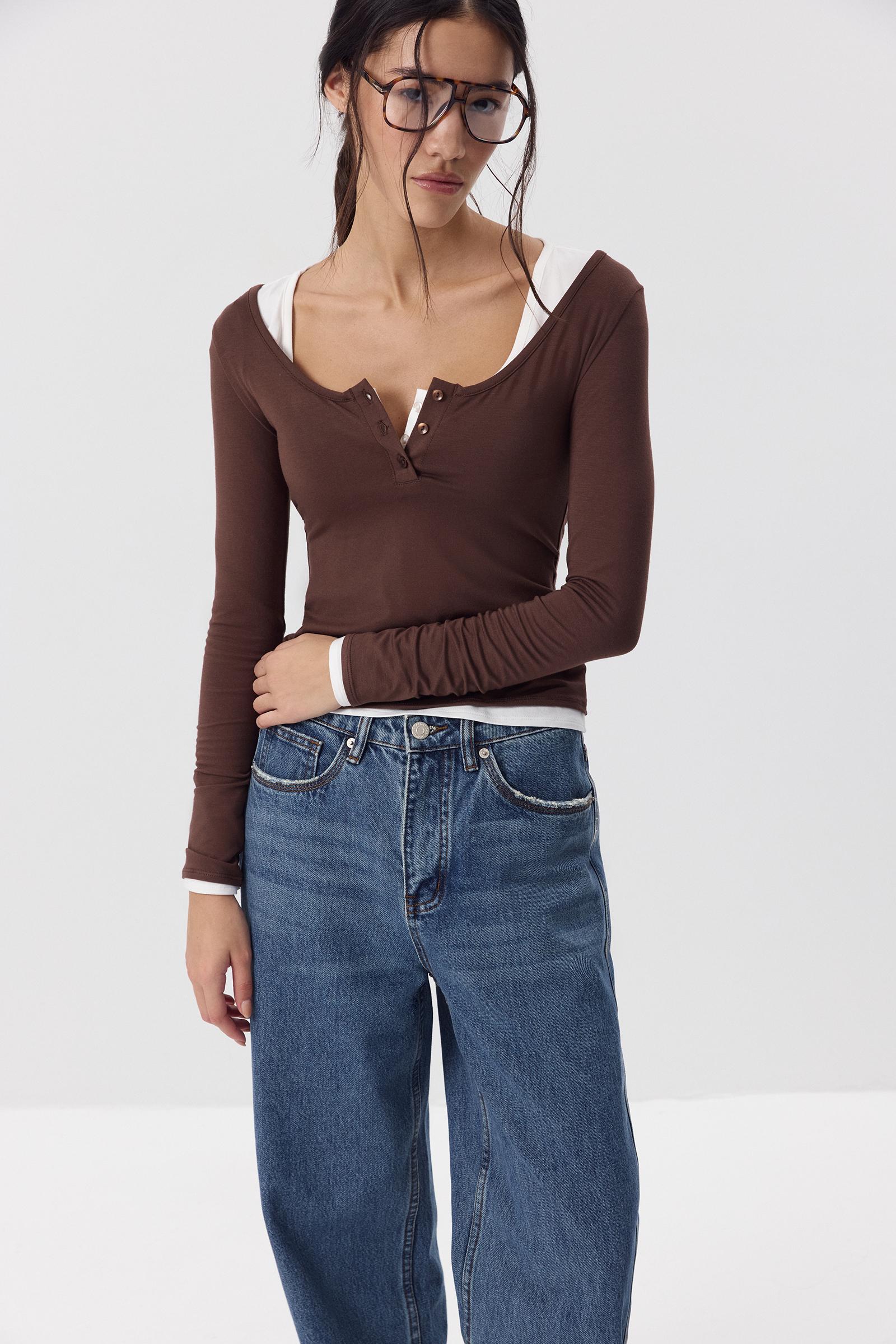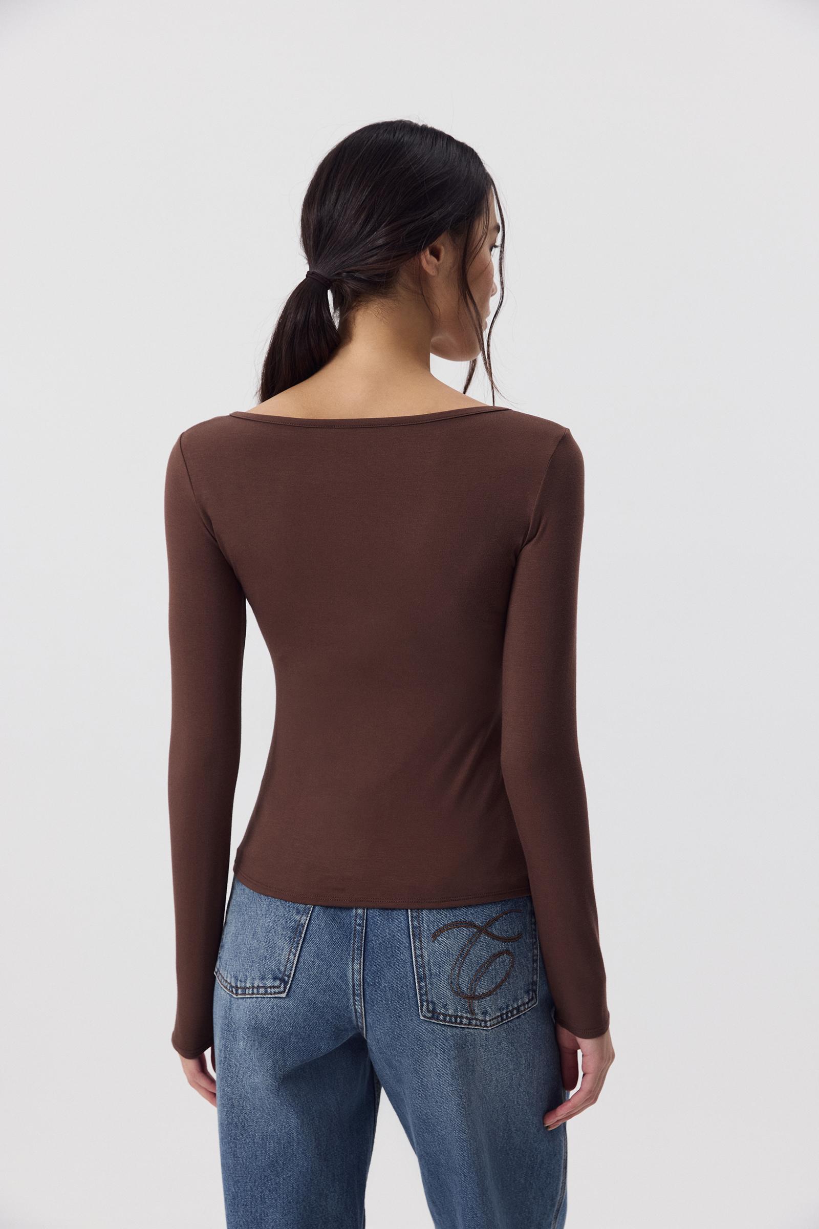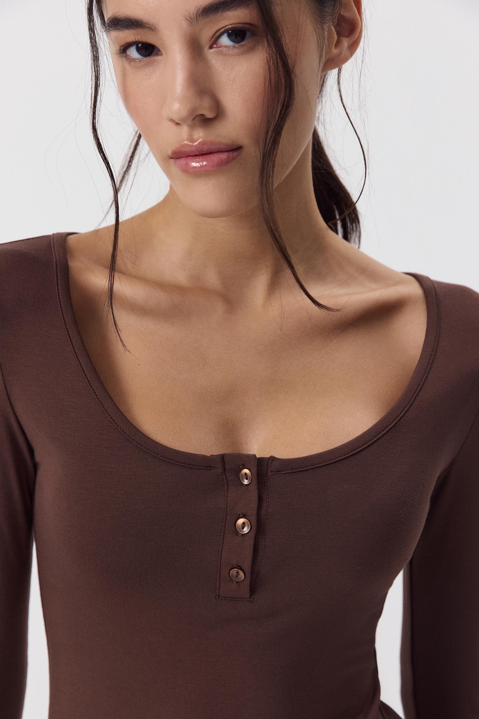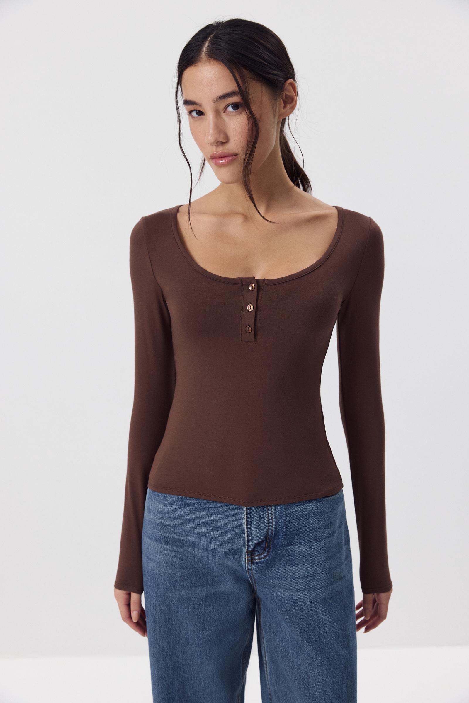 Лонгслив прилегающего силуэта с круглым вырезом и длинным рукавом. Изделие выполнено из эластичной трикотажной вискозы, дополнено глубоким декольте с застежкой на изящную функциональную планку, которая застегивается на три пуговицы.