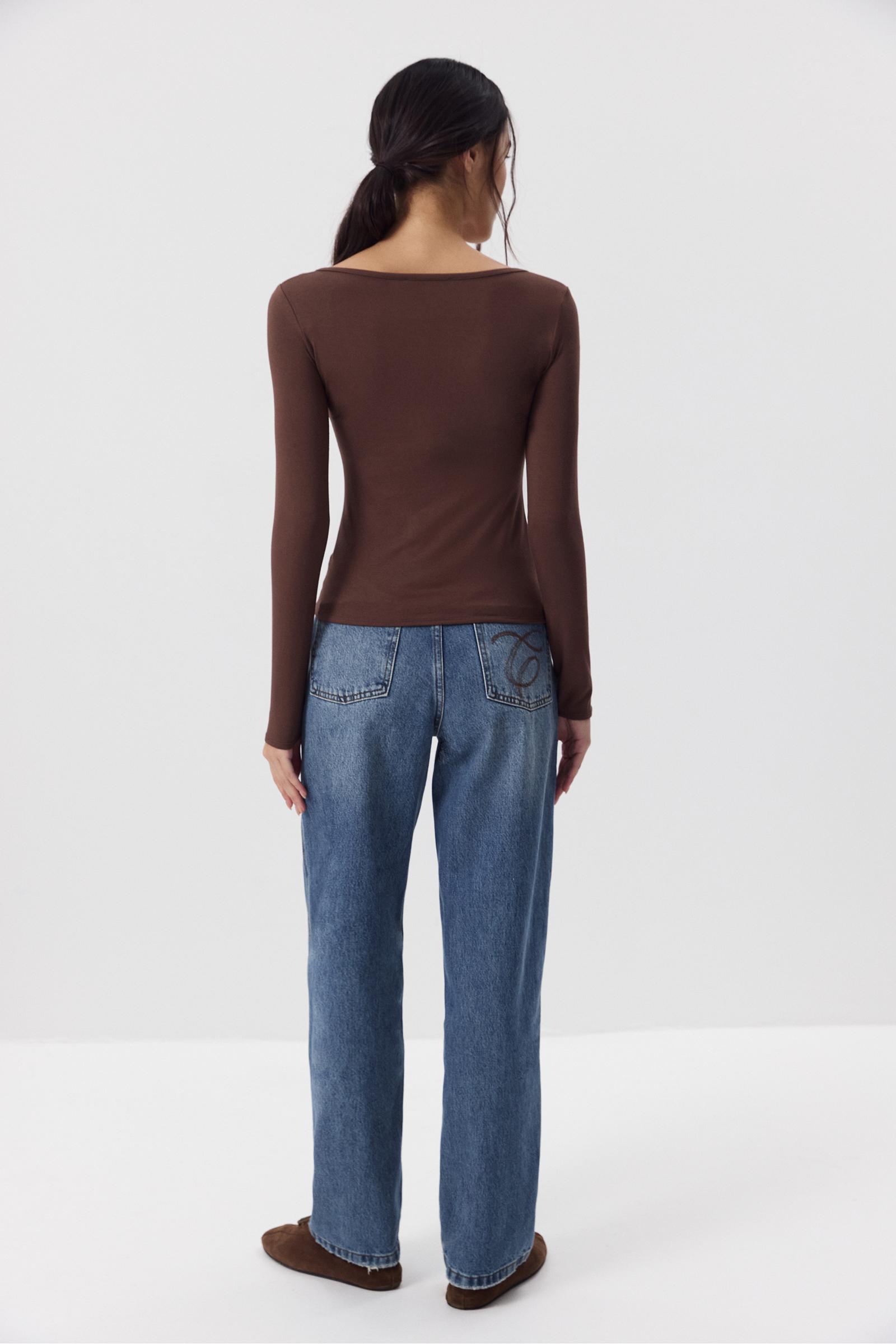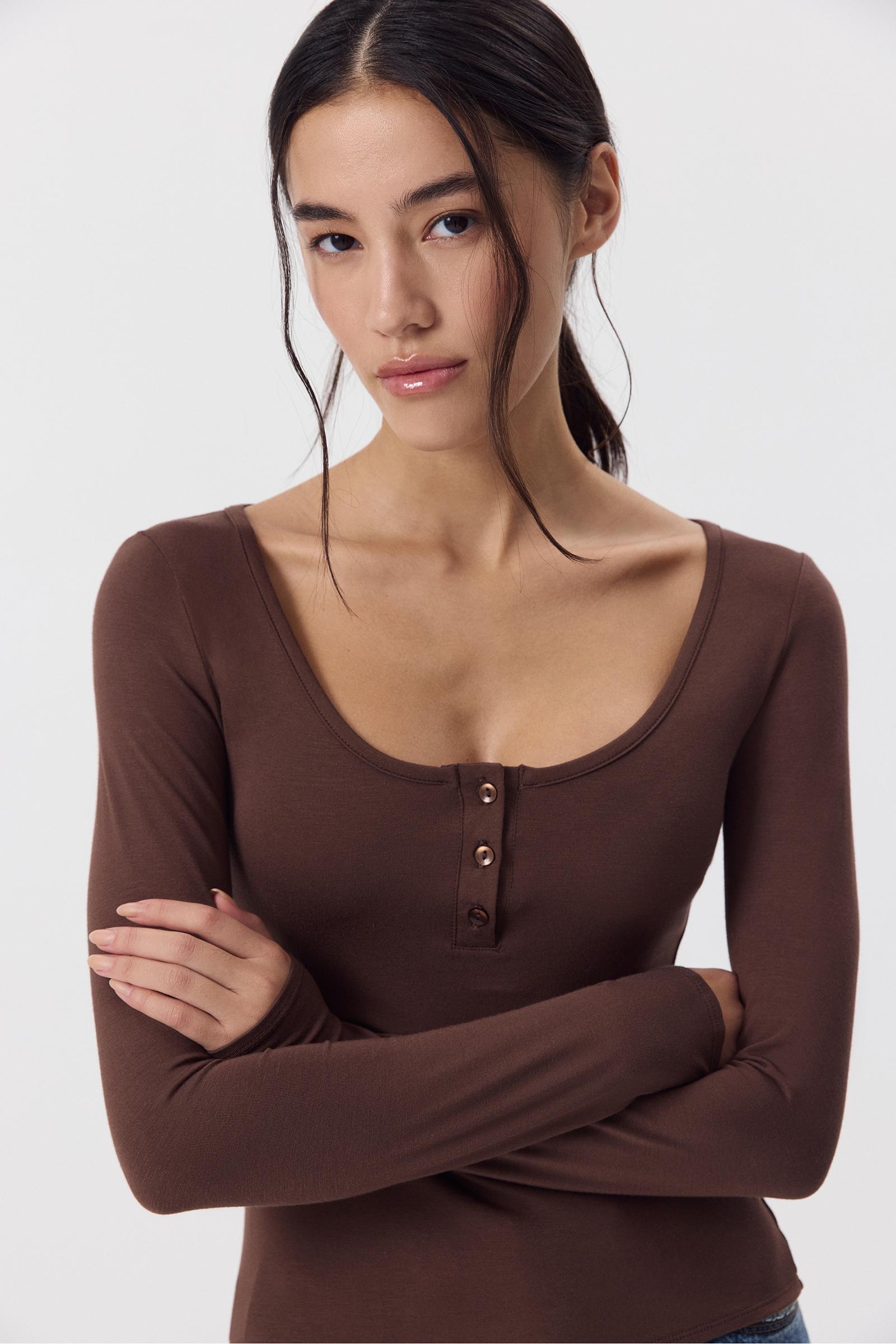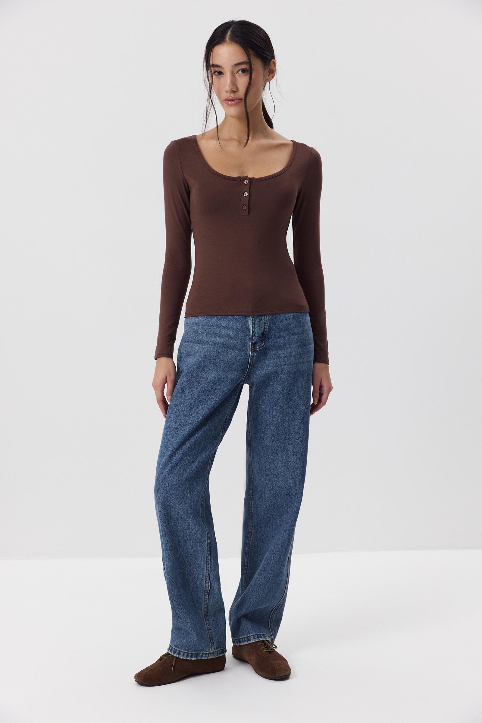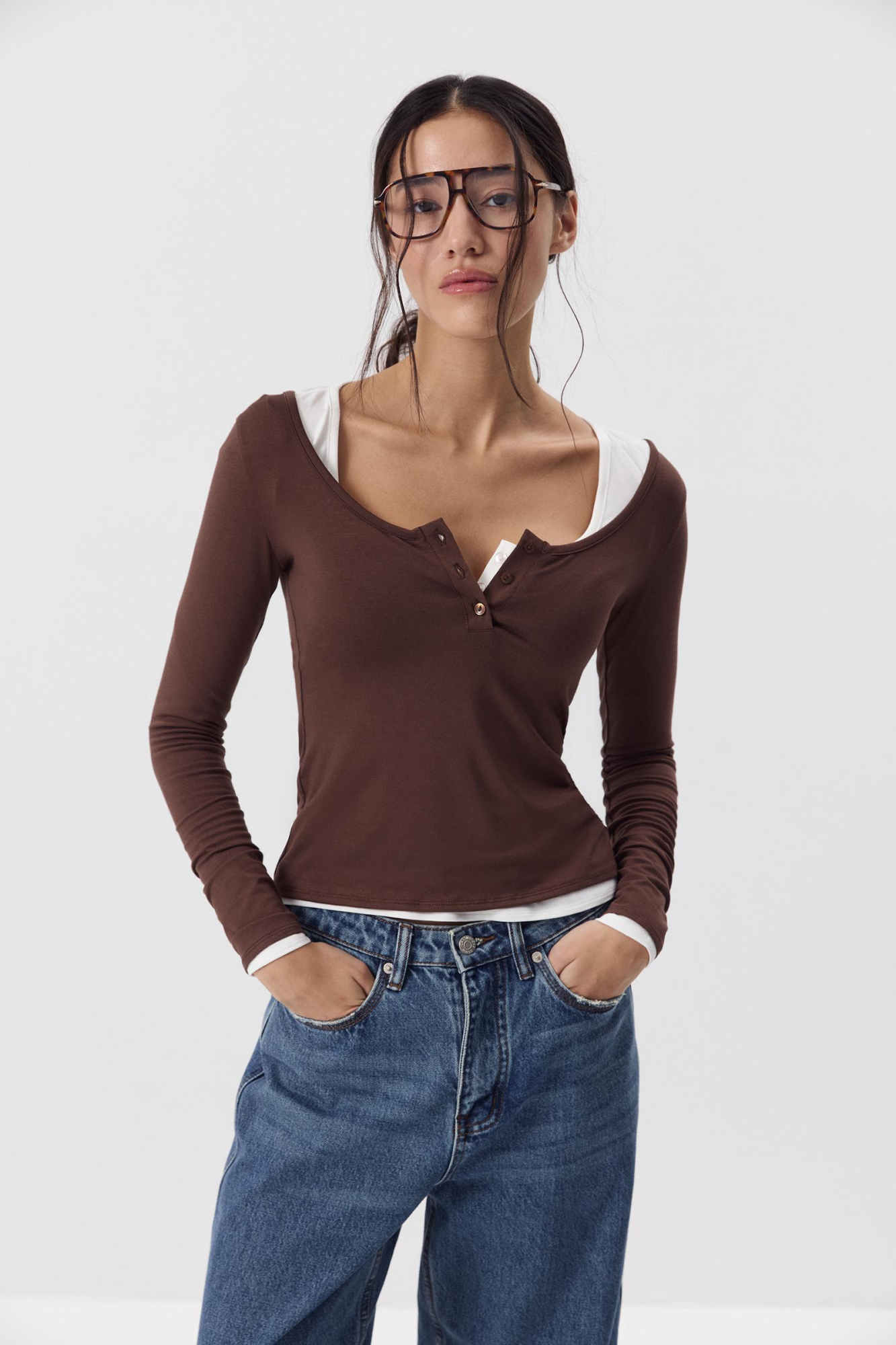 Лонгслив прилегающего силуэта с круглым вырезом и длинным рукавом. Изделие выполнено из эластичной трикотажной вискозы, дополнено глубоким декольте с застежкой на изящную функциональную планку, которая застегивается на три пуговицы.