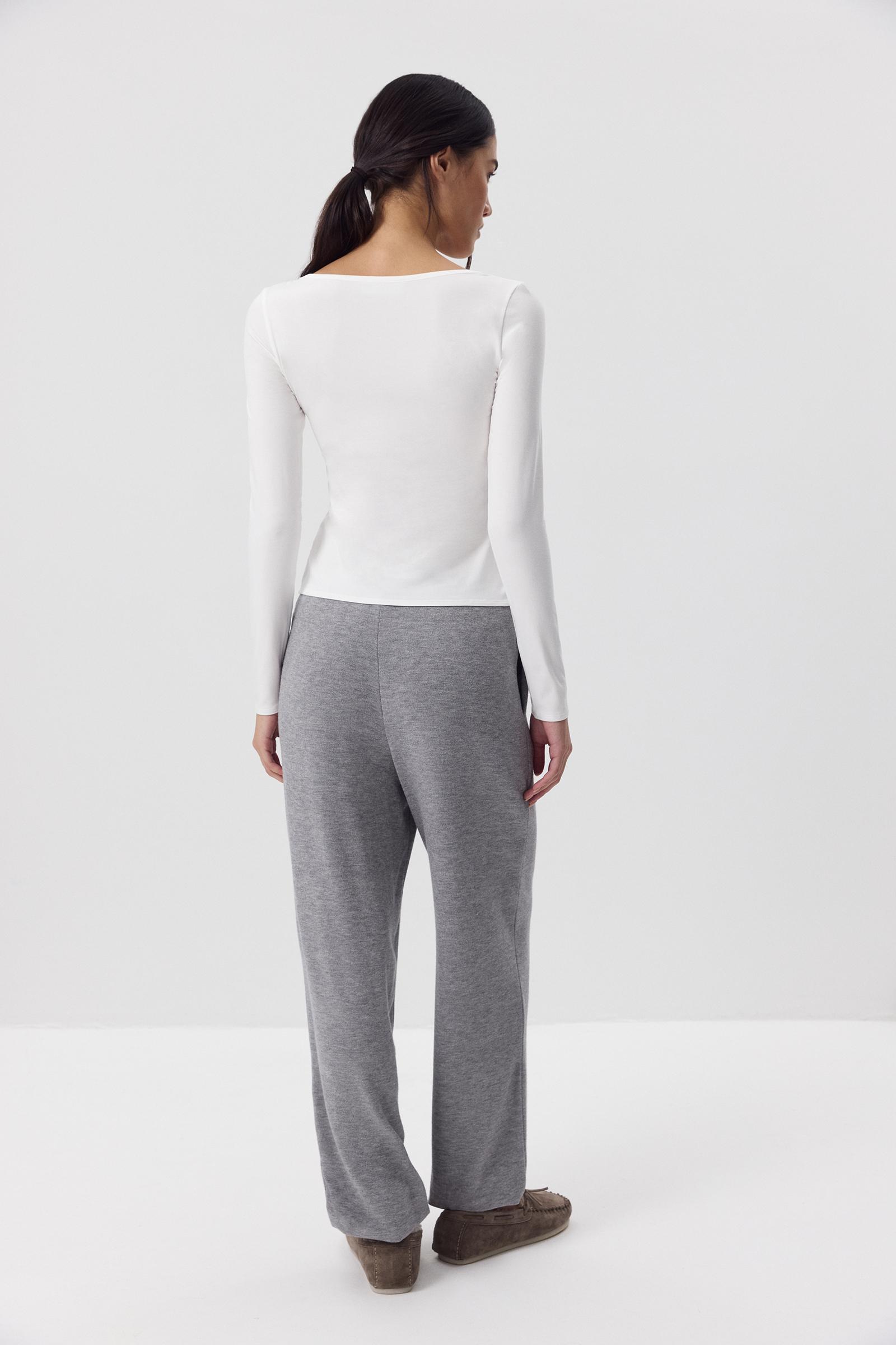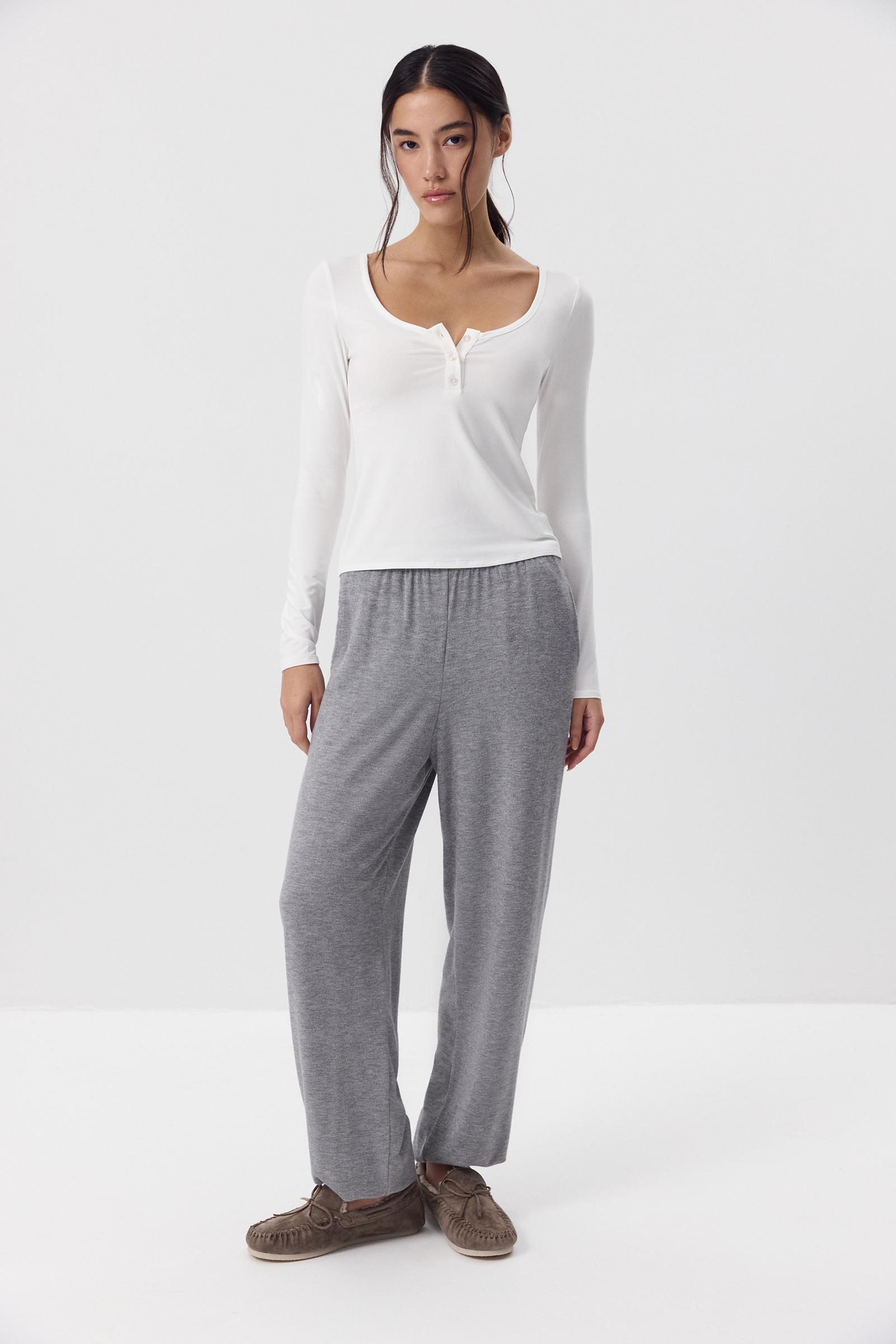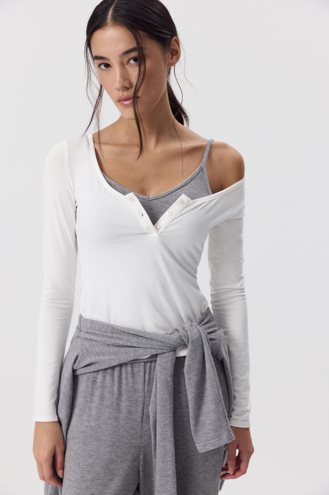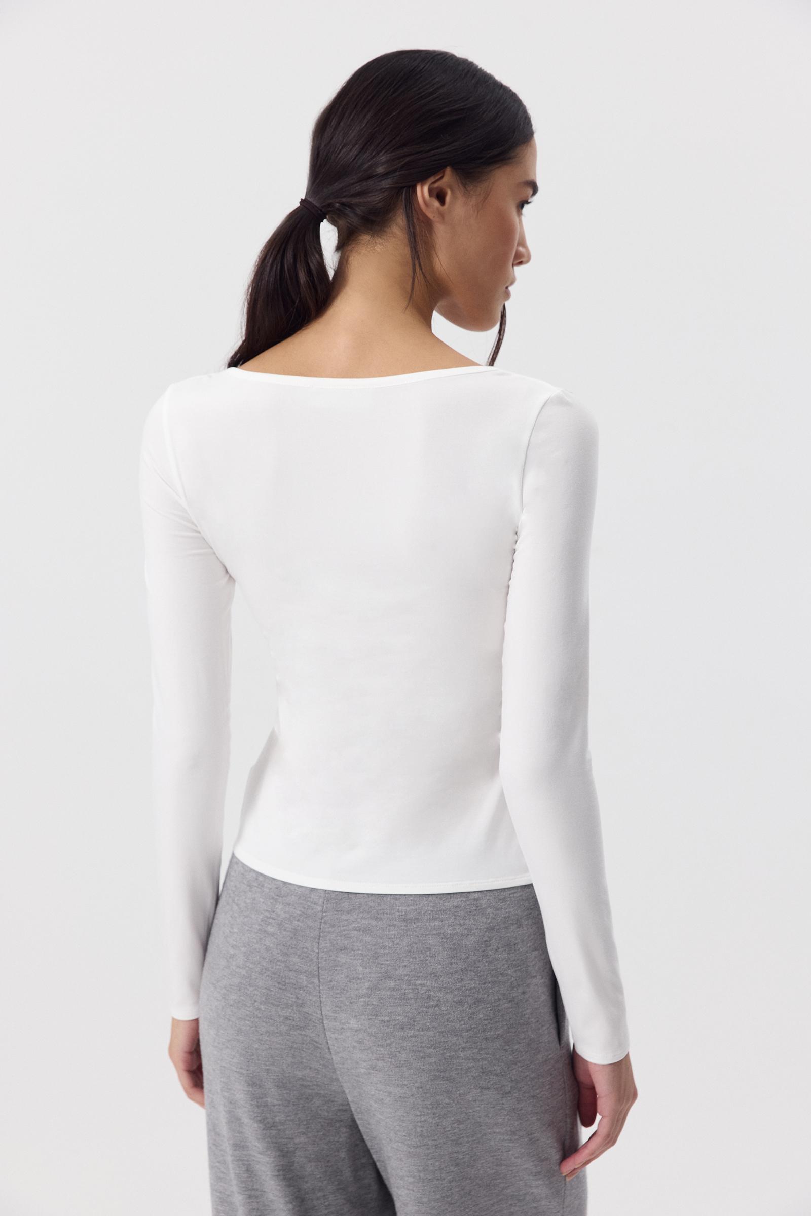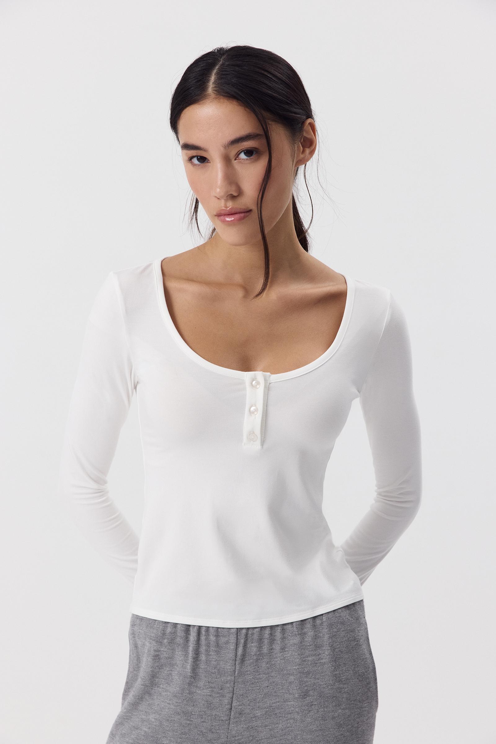 Лонгслив прилегающего силуэта с круглым вырезом и длинным рукавом. Изделие выполнено из эластичной трикотажной вискозы, дополнено глубоким декольте с застежкой на изящную функциональную планку, которая застегивается на три пуговицы.