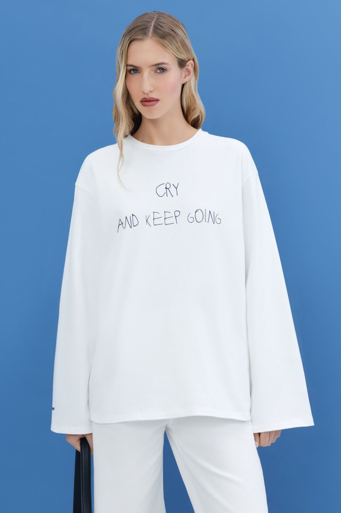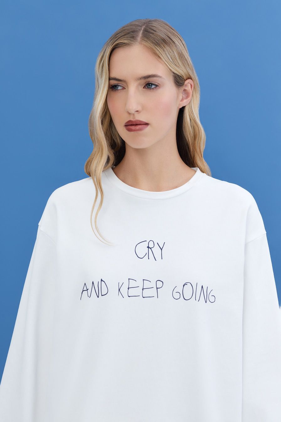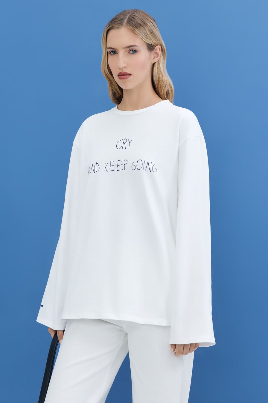 Молочно-белый лонгслив выполнен из 100% хлопка с peach-эффектом: благодаря специальной обработке ткань приобрела мягкую и бархатистую поверхность. Модель свободного кроя декорирована принтом в виде надписи CRY AND KEEP GOING.