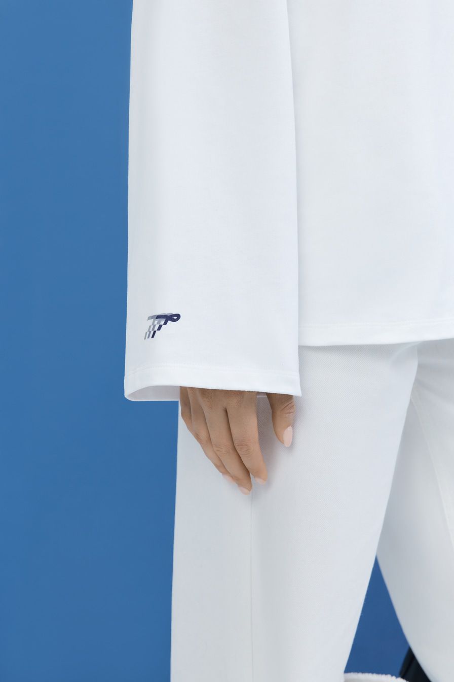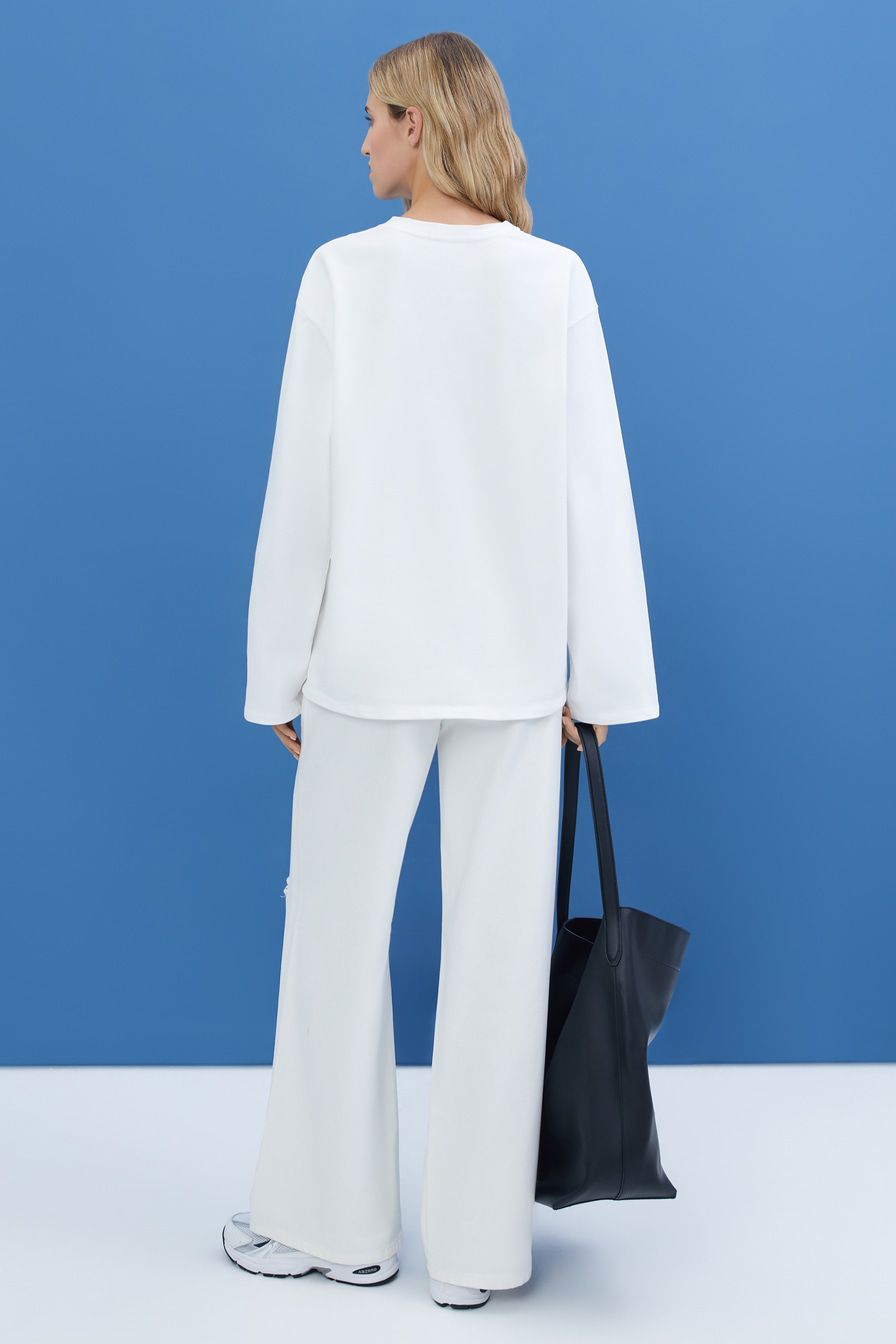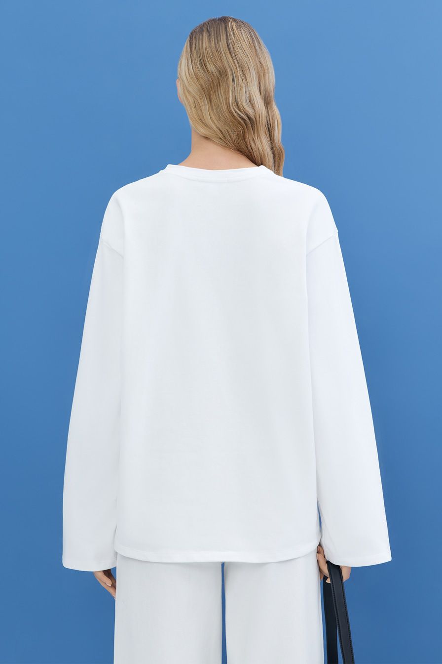 Молочно-белый лонгслив выполнен из 100% хлопка с peach-эффектом: благодаря специальной обработке ткань приобрела мягкую и бархатистую поверхность. Модель свободного кроя декорирована принтом в виде надписи CRY AND KEEP GOING.