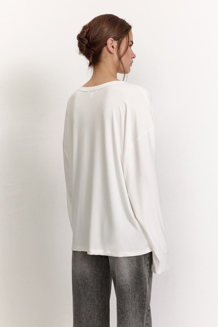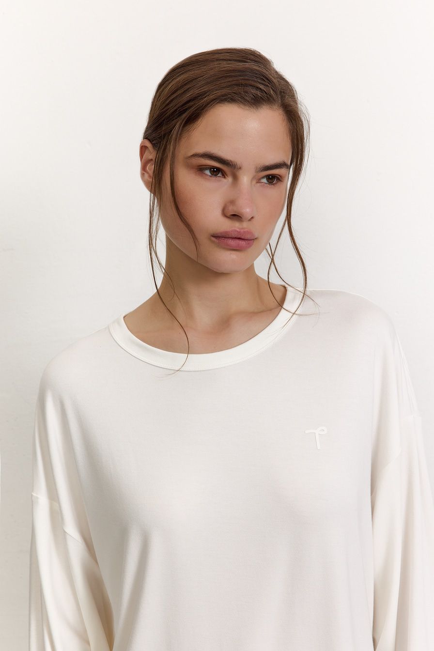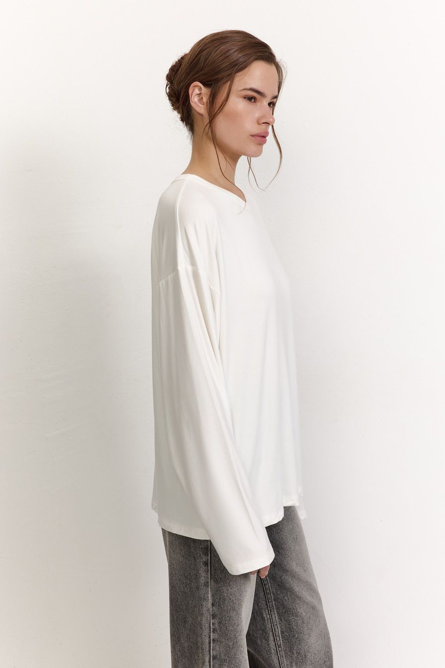 Молочный лонгслив из смесовой вискозы – модель оверсайз-кроя со спущенной линией плеч. Лонгслив декорирован вышивкой на груди в виде логотипа бренда.