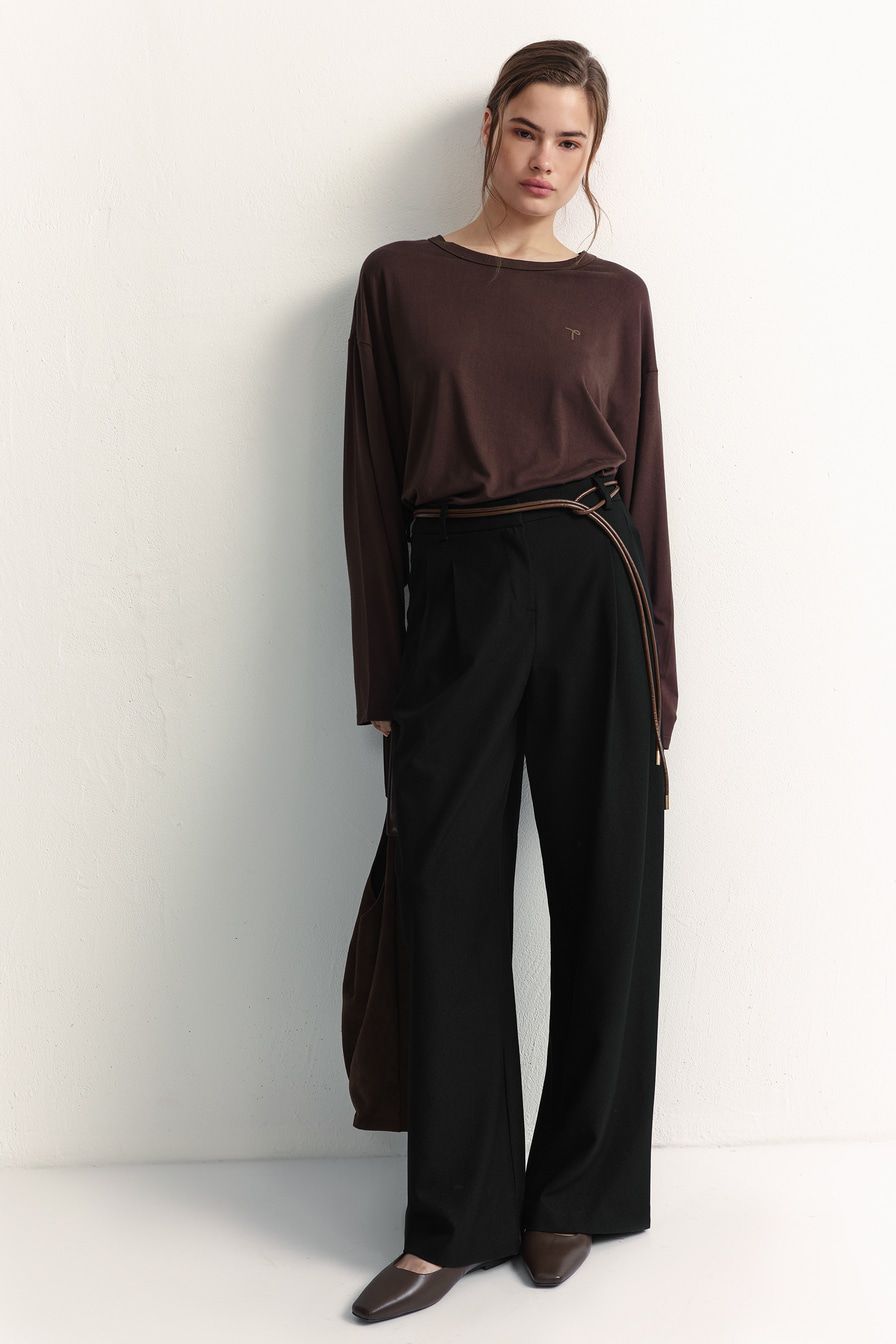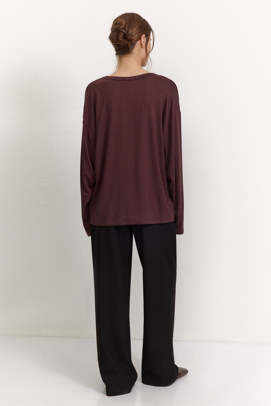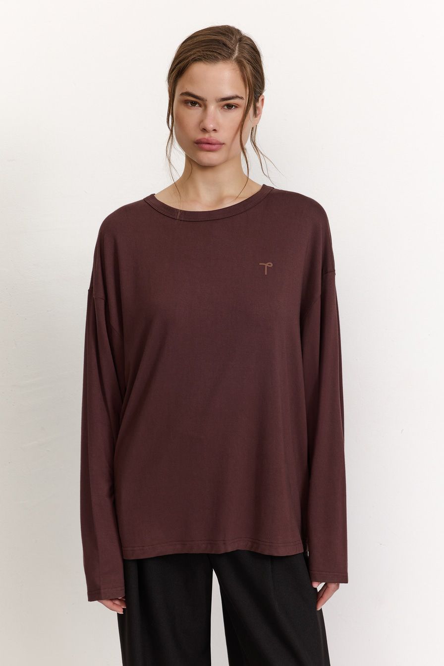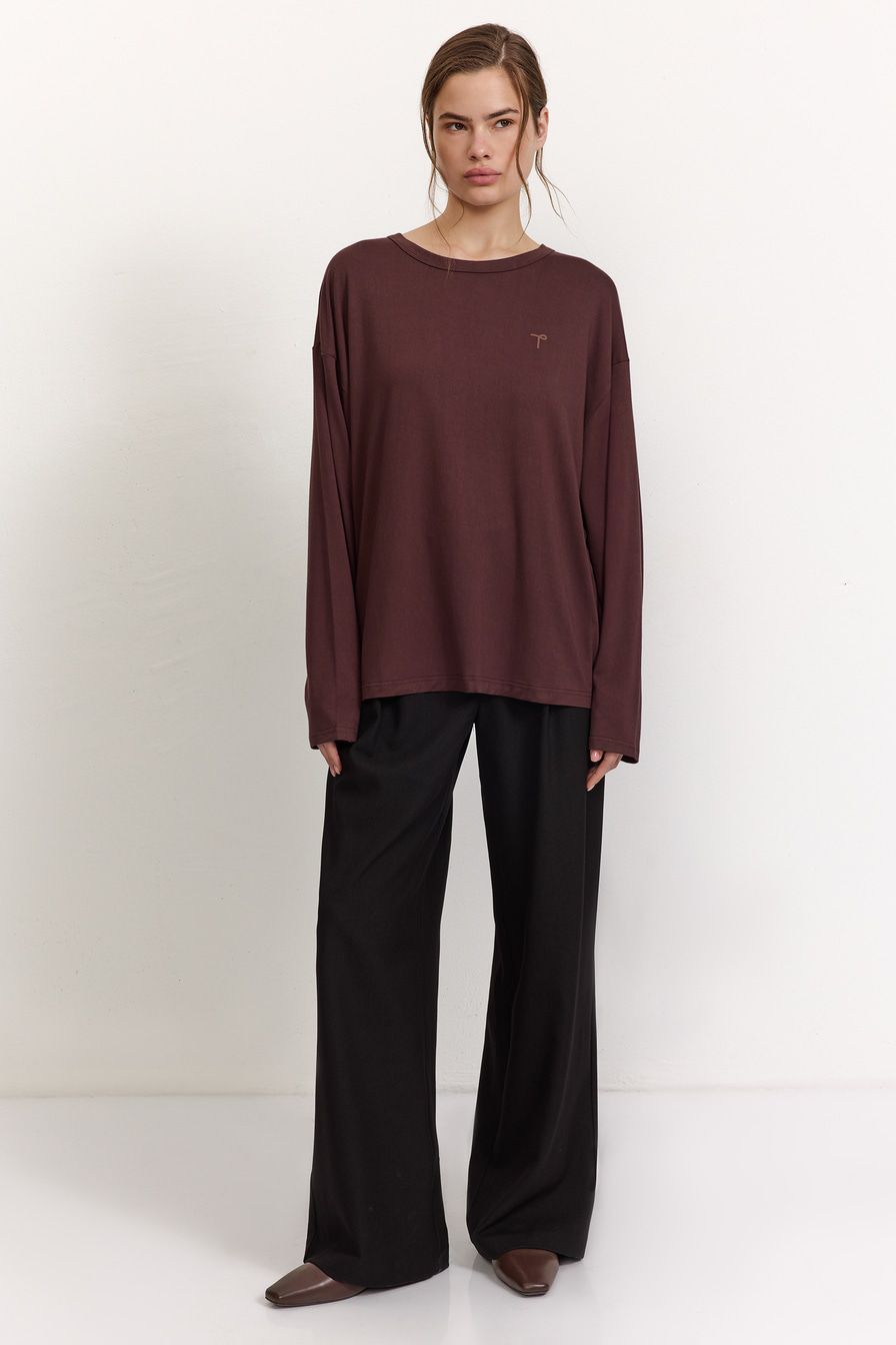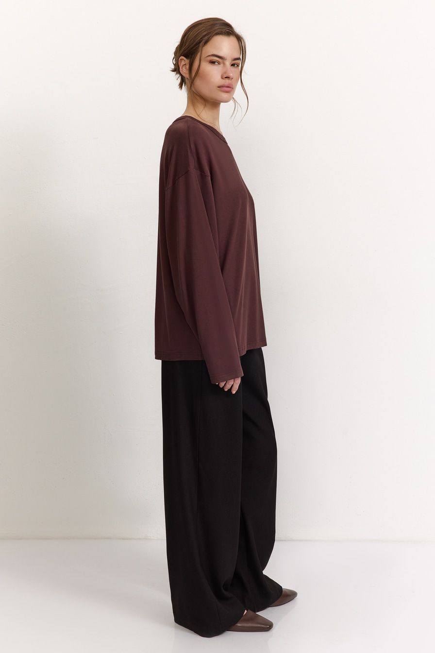 Темно-коричневый лонгслив из смесовой вискозы – модель оверсайз-кроя со спущенной линией плеч. Лонгслив декорирован вышивкой на груди в виде логотипа бренда.